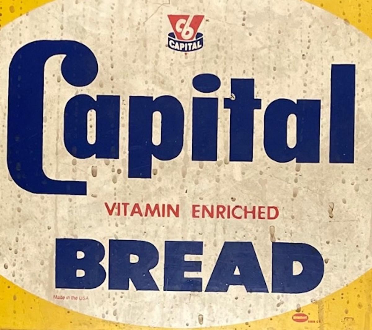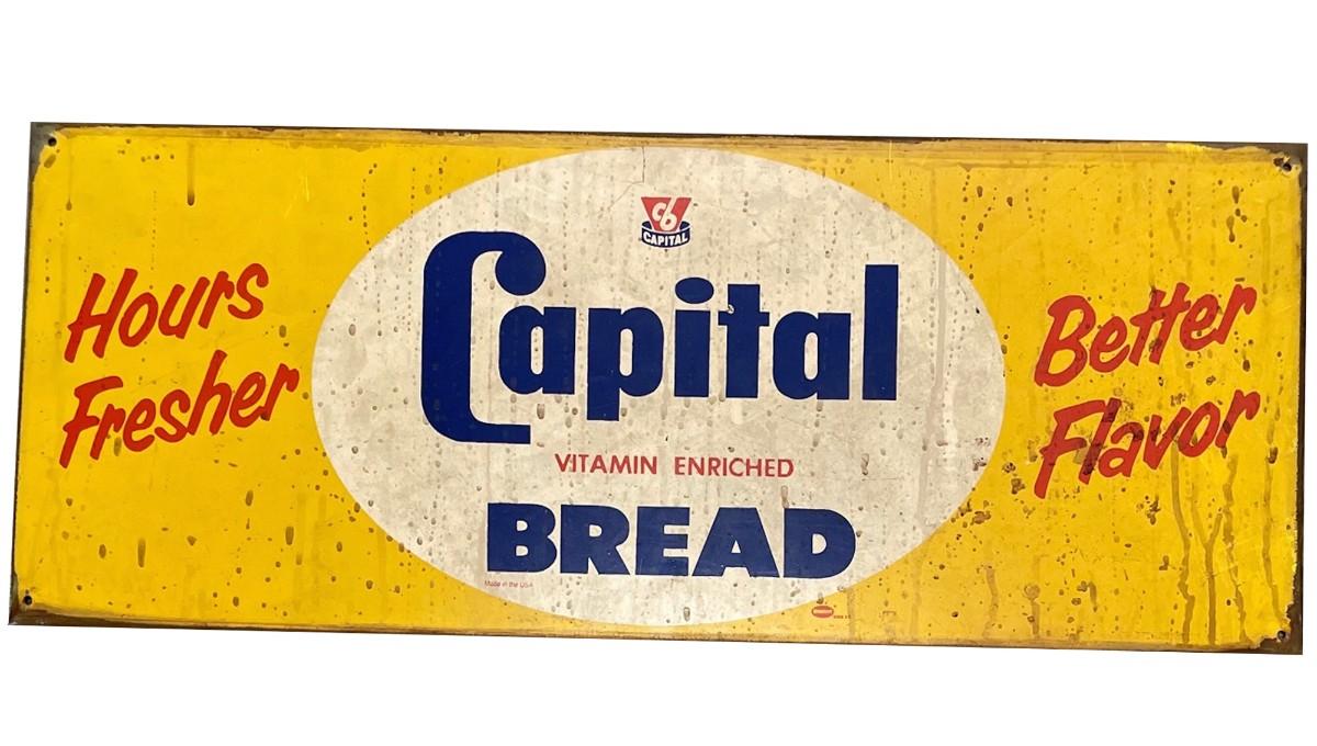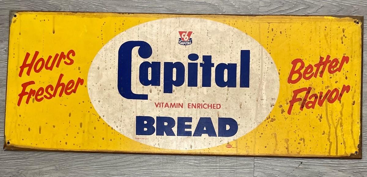 Description: Capital Bread Advertising Sign. Measures approximately: 23.5 X 9.5. Inches. Material : Metal.