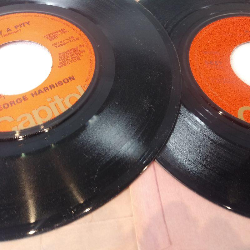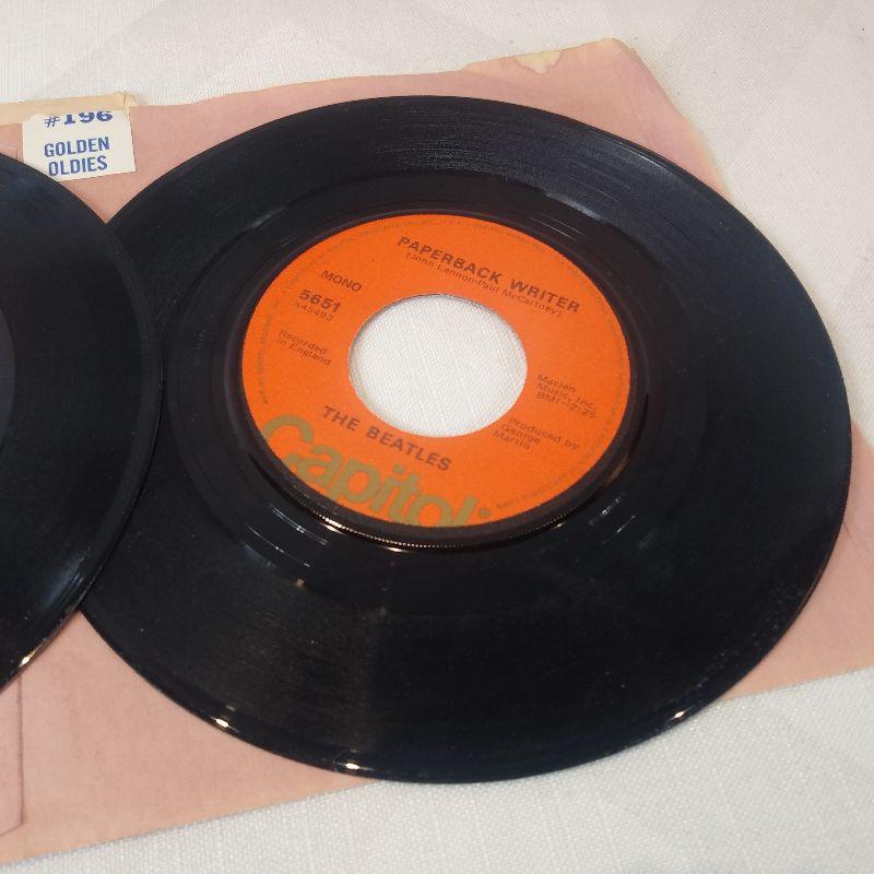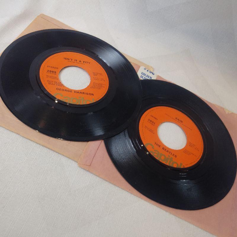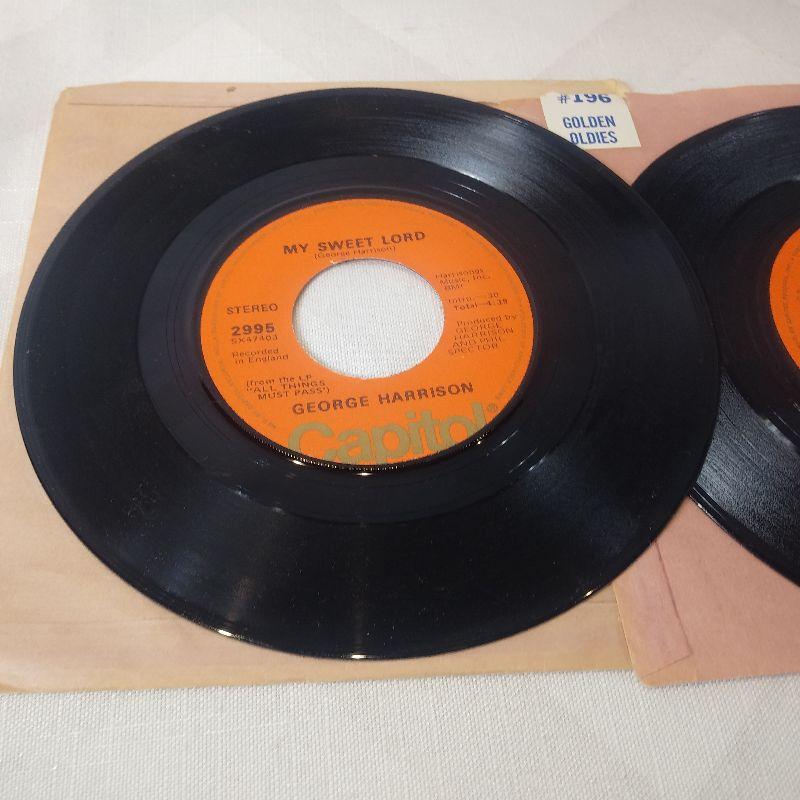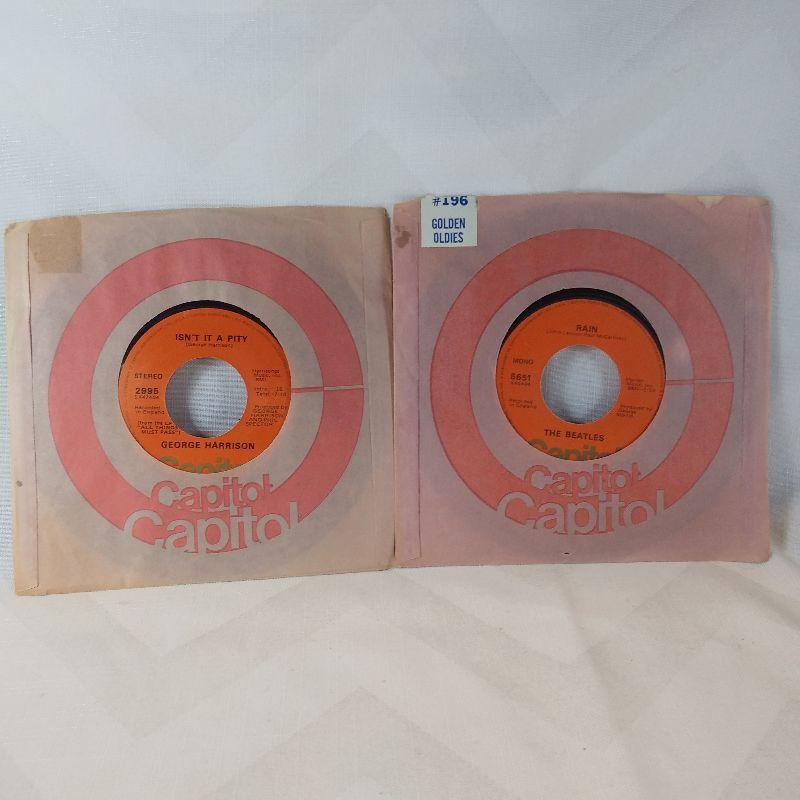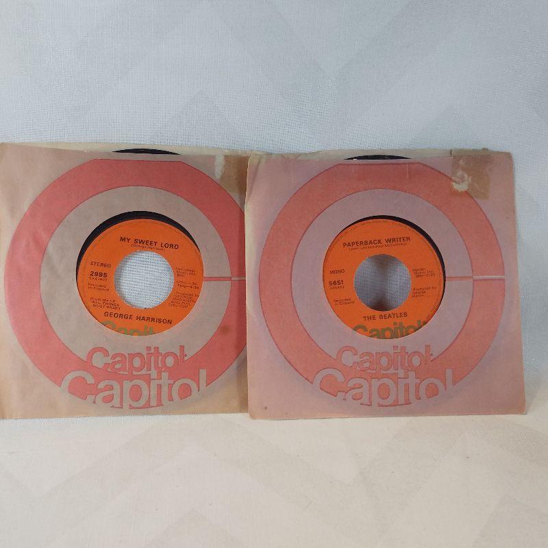 This auction lot is for two records of The Beatles on Capitol Records. The song is Paperback Writer with other side Rain - by the Beatles. The other 45 is by George Harrison - My Sweet Lord and Isn't it a Pity. Both records are in very good condition