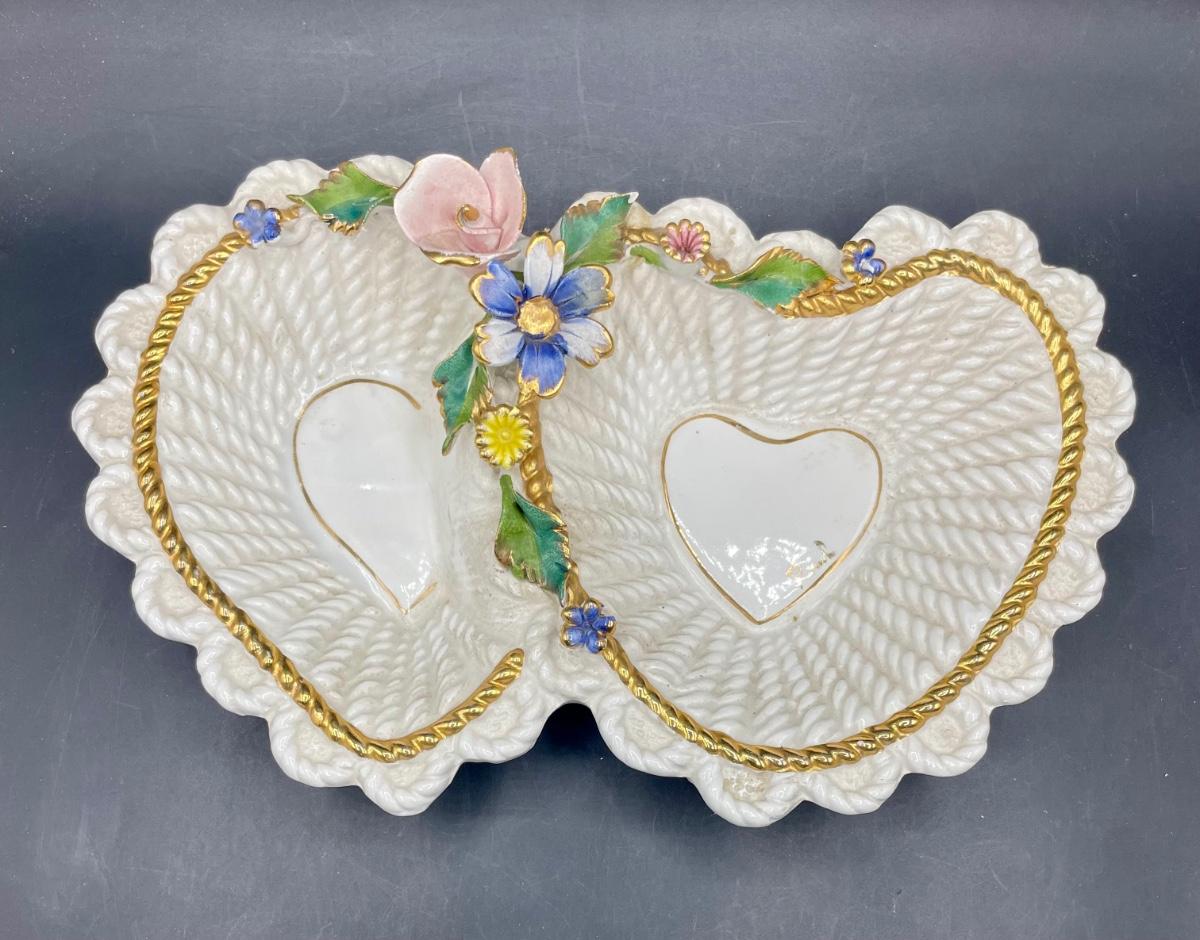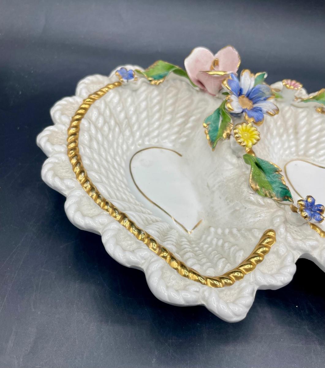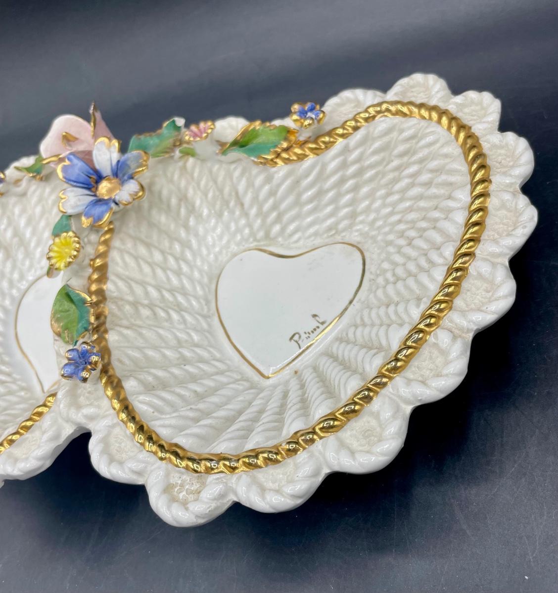 Overlapping Heart-shaped bowls with flower decorations. Approx. 6" x 12".