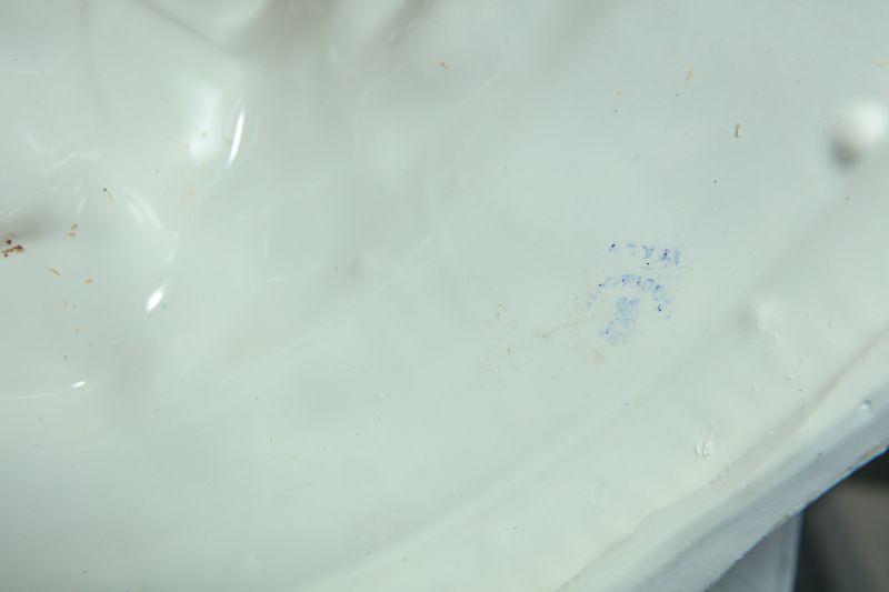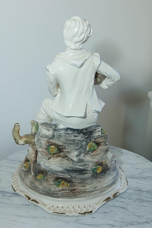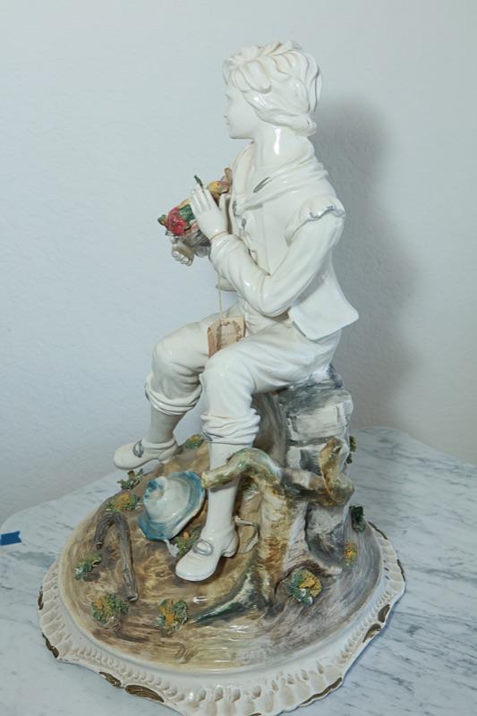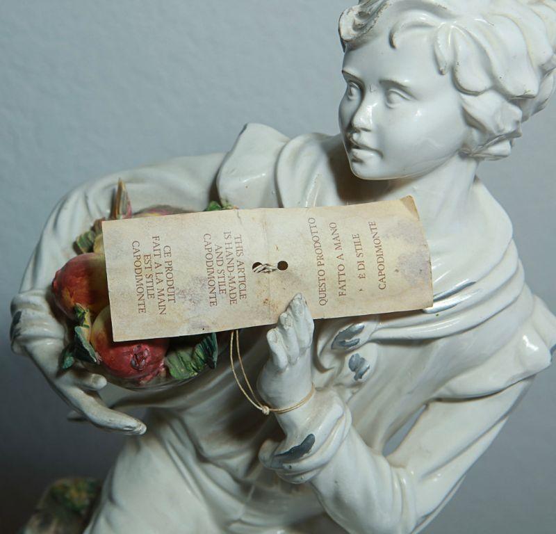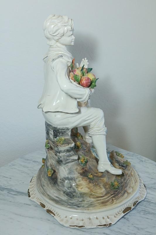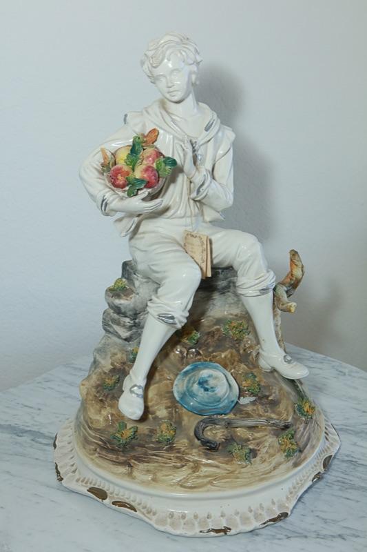 Capodimonte statue figurine of a boy sitting on a rock. The boy is holding a basket of vegetables. Interesting piece. The boy is in a white finish while the basket of food, the rock/base he is sitting on has been done in color. Faint stamp on the bottom and hang tag attached. Good condition. Measures about 22" tall.