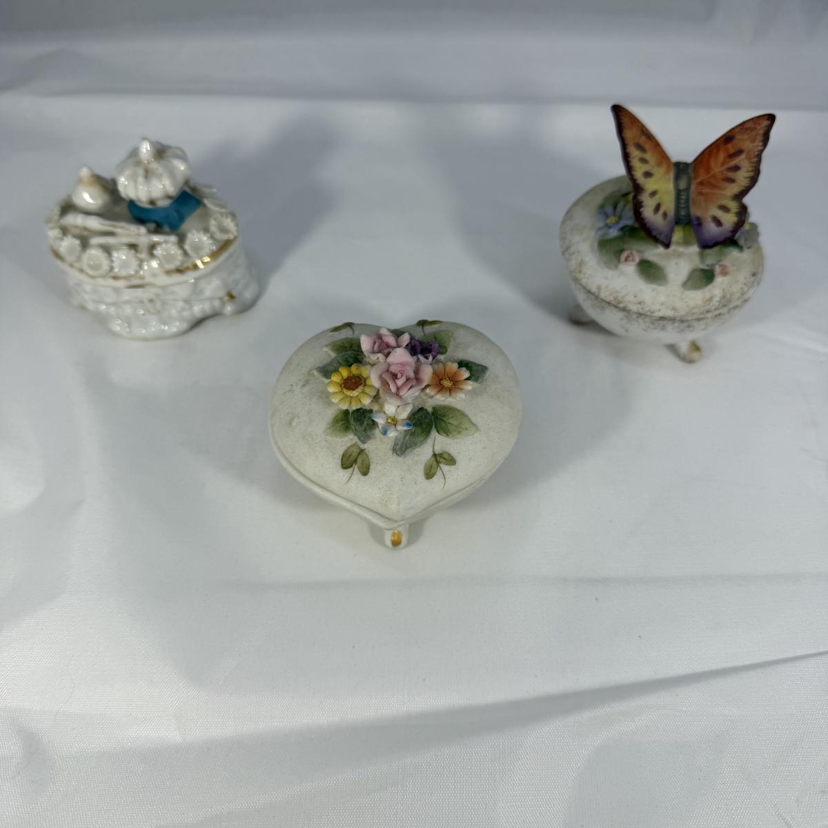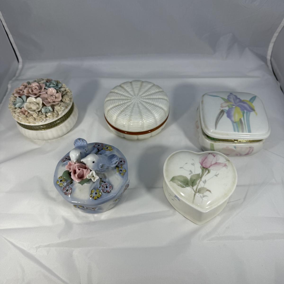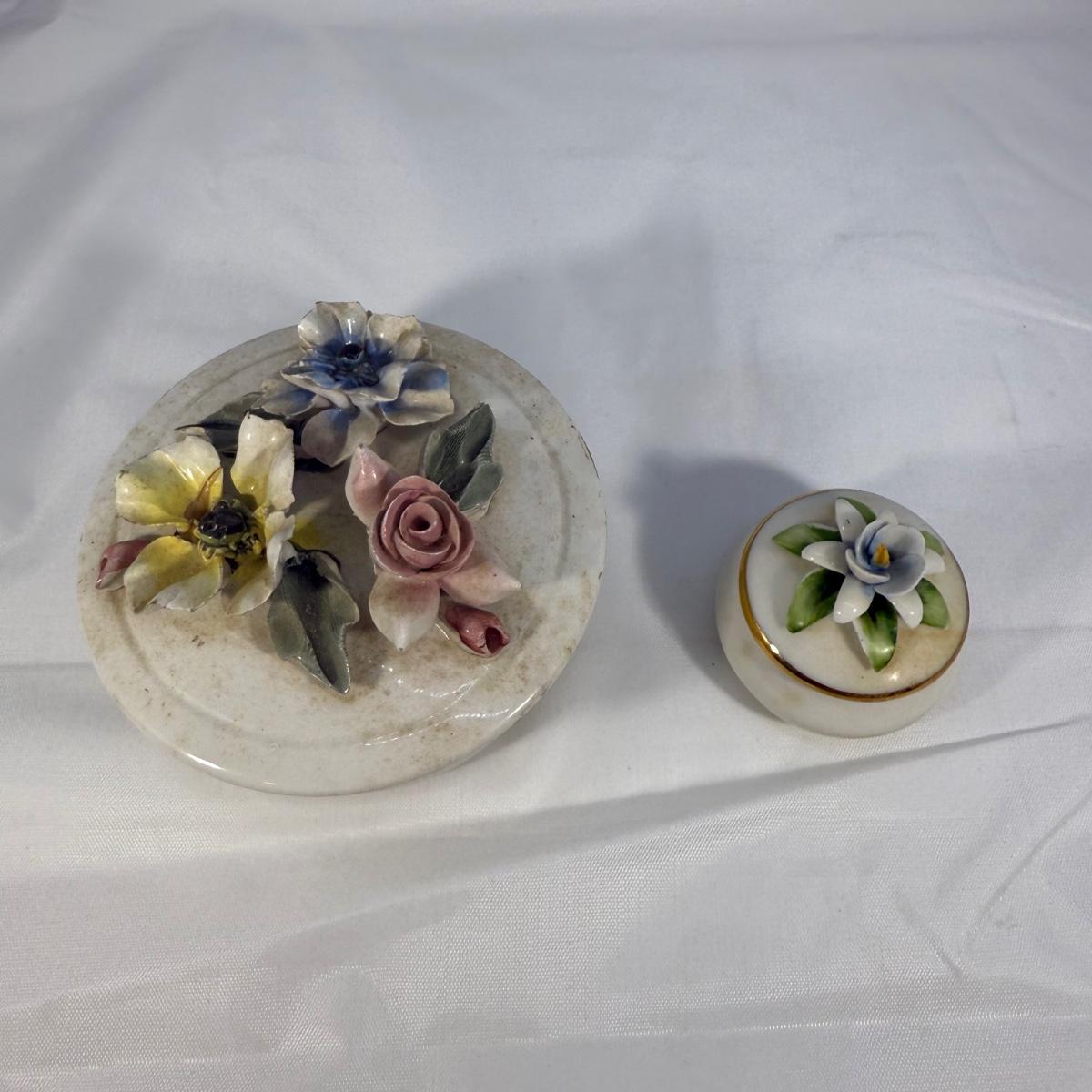 This lot contains 18 trinket boxes, all of which appear to be bone china or porcelain. Included are at least two Capodimonte boxes both with gorgeous petal details. The small one with a single flower measures 2”D x 2”H. The large Capodimonte box has three flowers but there is a petal that chipped off, this piece measures 3.5”D x 3”H. See pictures for full inventory. Some boxes could use some detailed cleaning.
