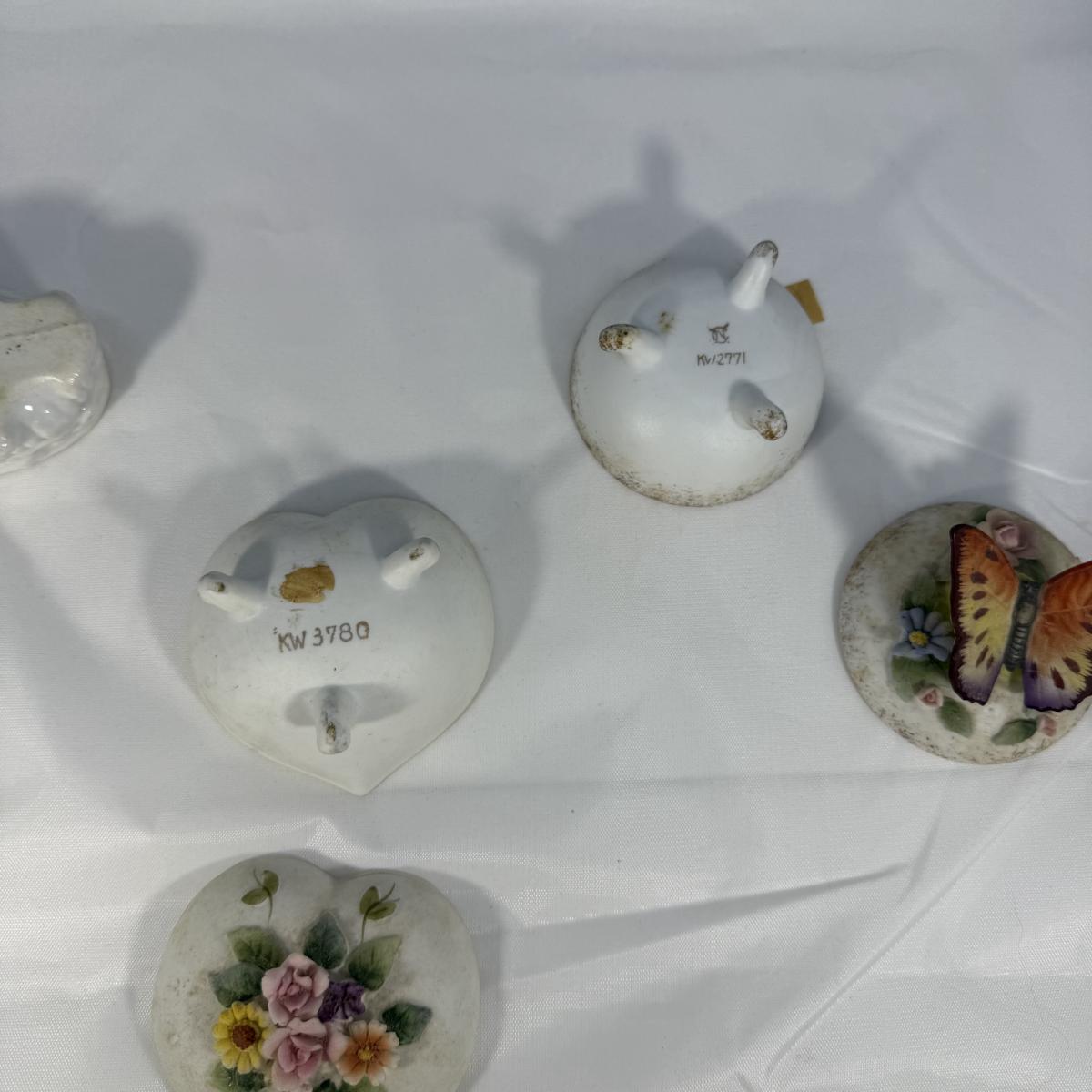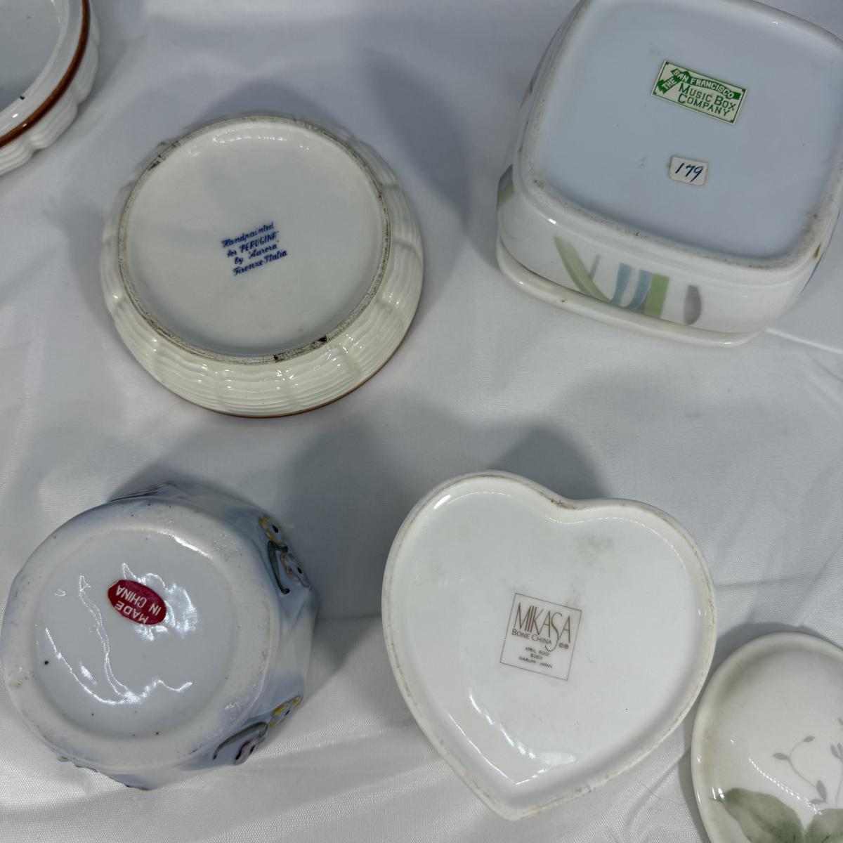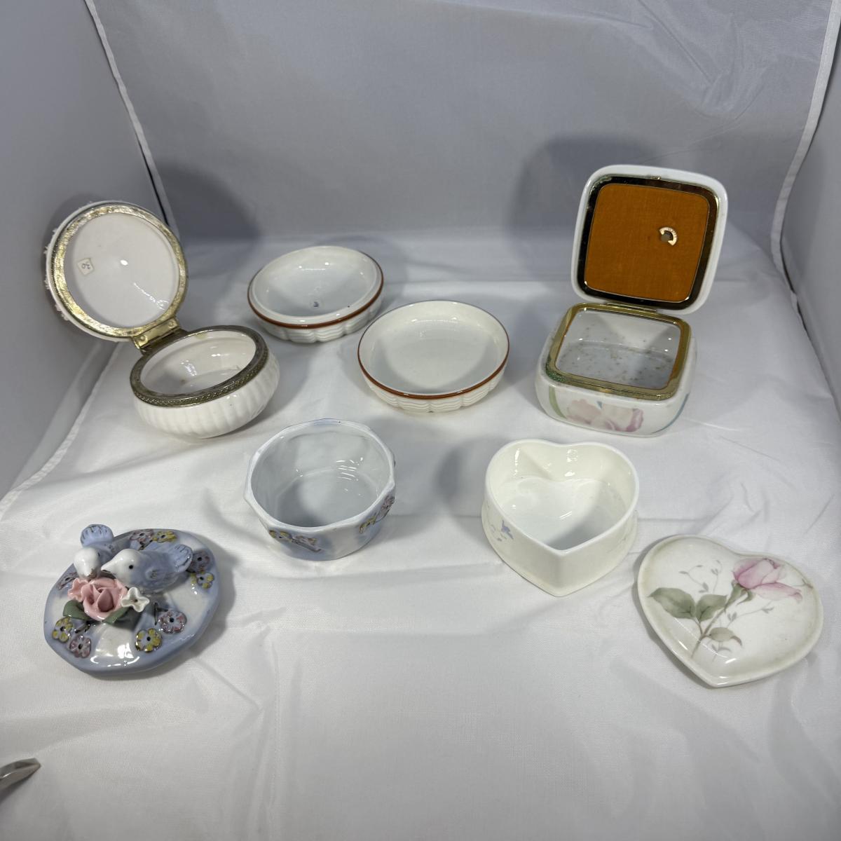 This lot contains 18 trinket boxes, all of which appear to be bone china or porcelain. Included are at least two Capodimonte boxes both with gorgeous petal details. The small one with a single flower measures 2”D x 2”H. The large Capodimonte box has three flowers but there is a petal that chipped off, this piece measures 3.5”D x 3”H. See pictures for full inventory. Some boxes could use some detailed cleaning.