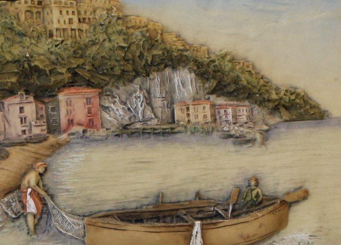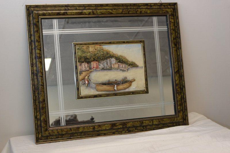 Description: Capodimonte Fishing boat in a inlet 3D mirror like painting signed by Cirant. Measurement approximate: 9.5 H X 13 W framed 25 H X 28 W. Material: Robust plastic. Shipping cost: $80 Excluding California, Alaska & Hawaii.