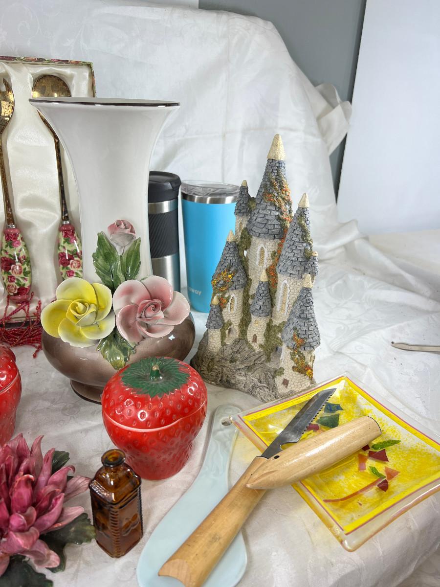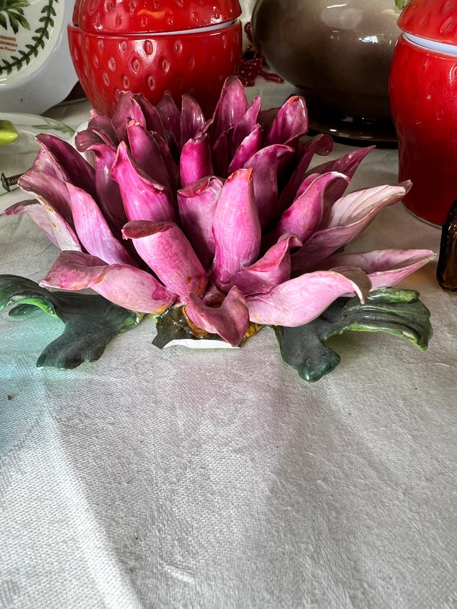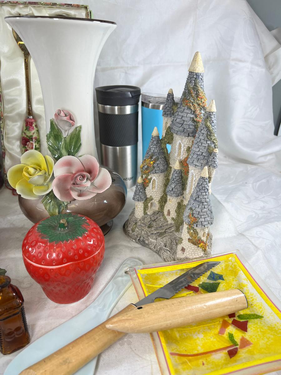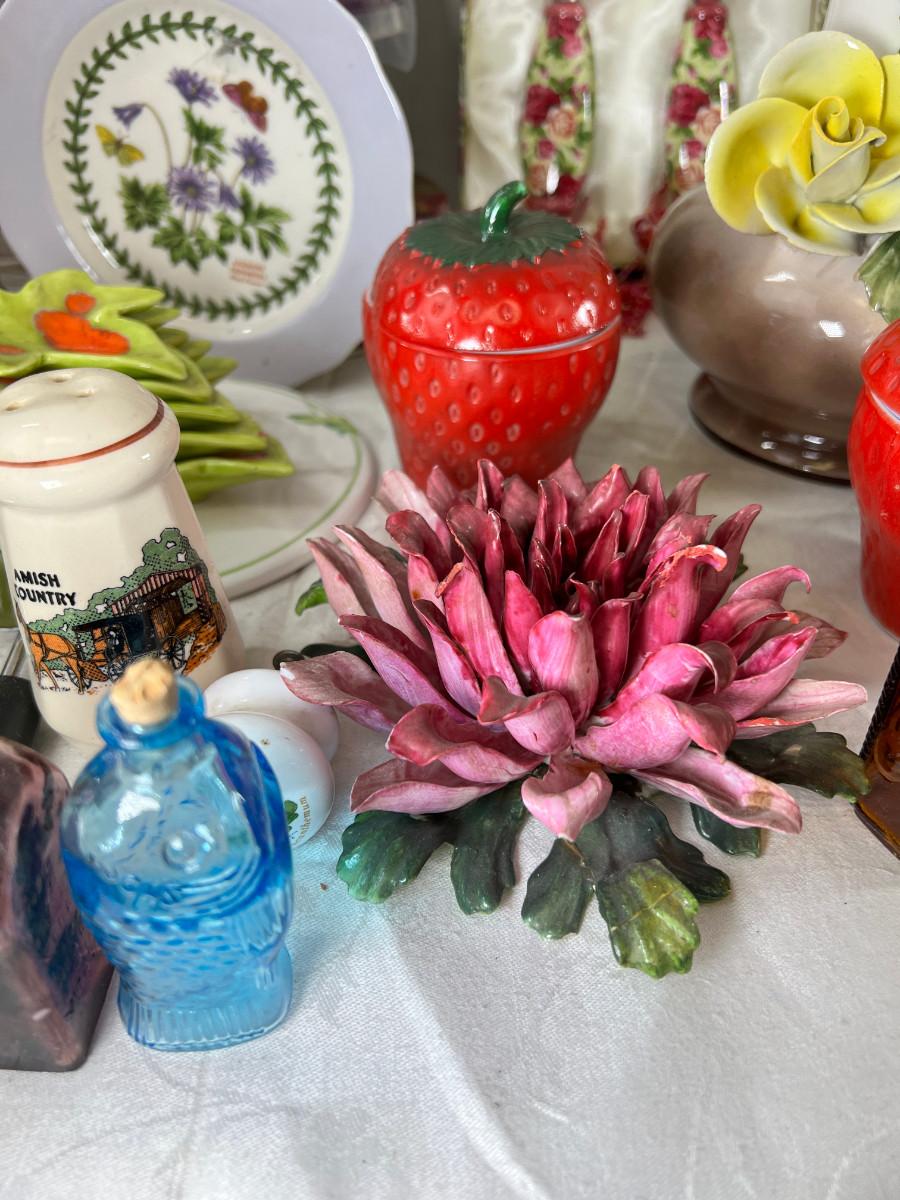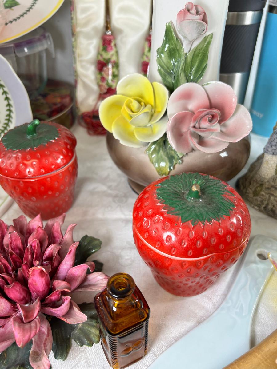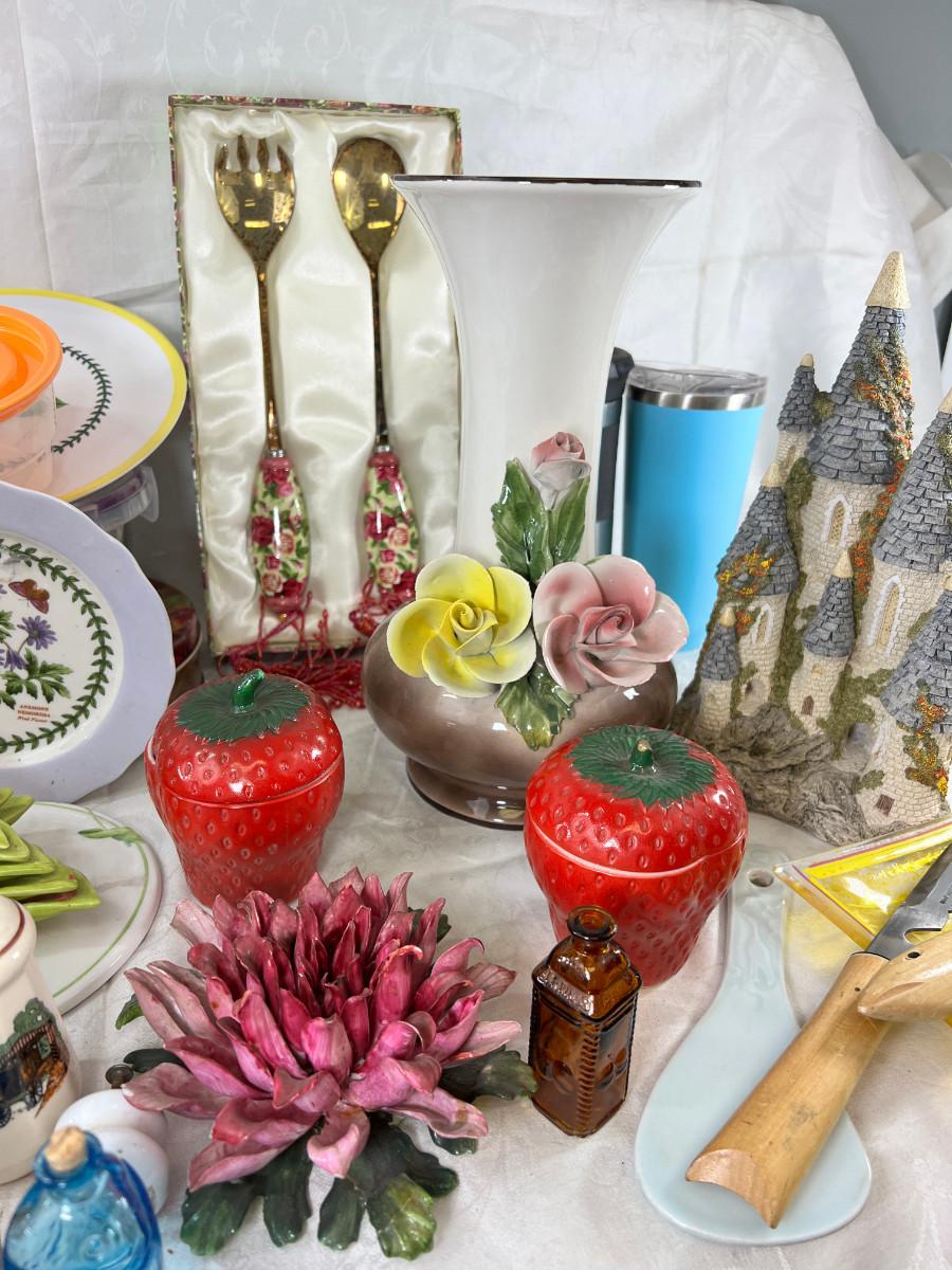 Capodimonte flowers, vases. leaf , vintage glass, fork and spoon salad set. Utensils, strawberry jam pots, perfume bottles.