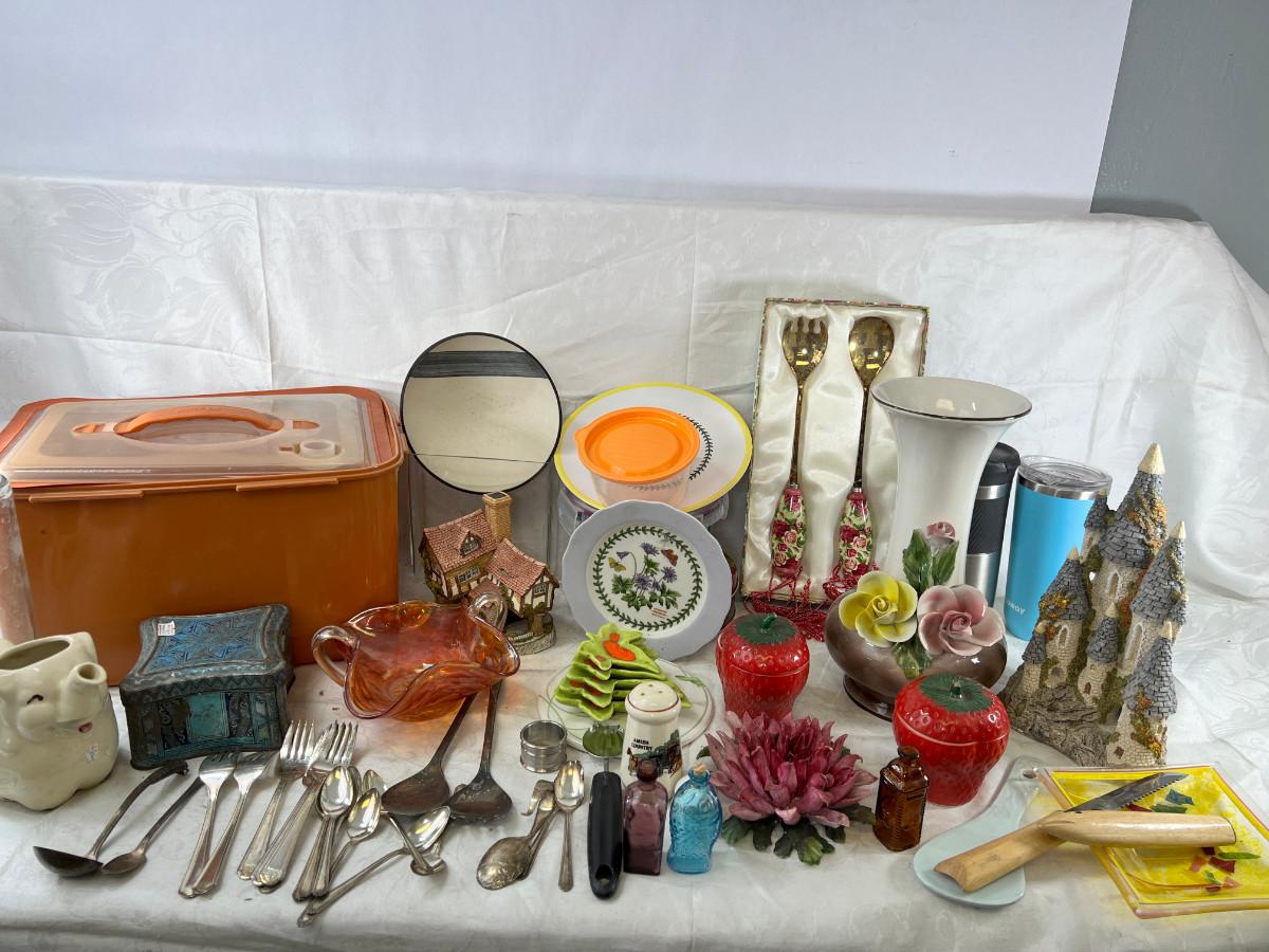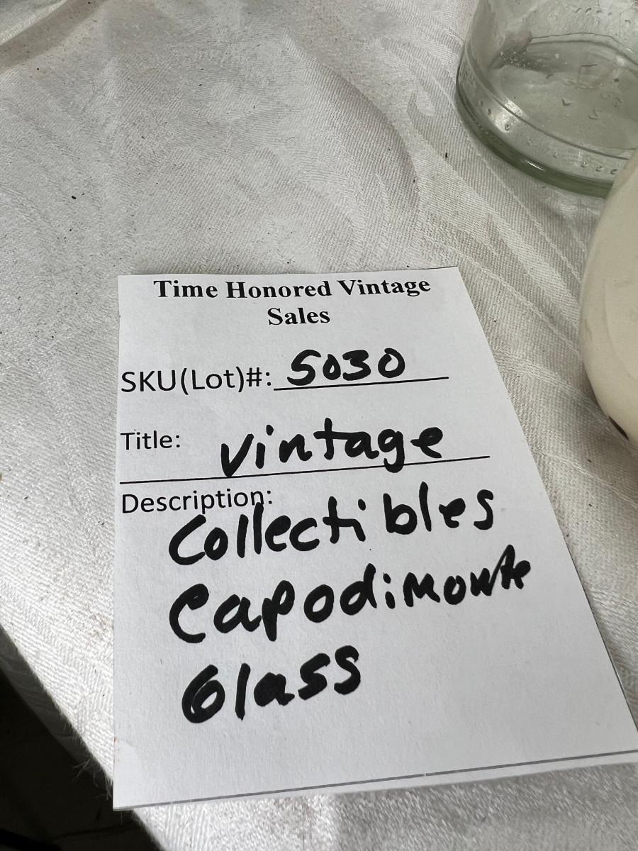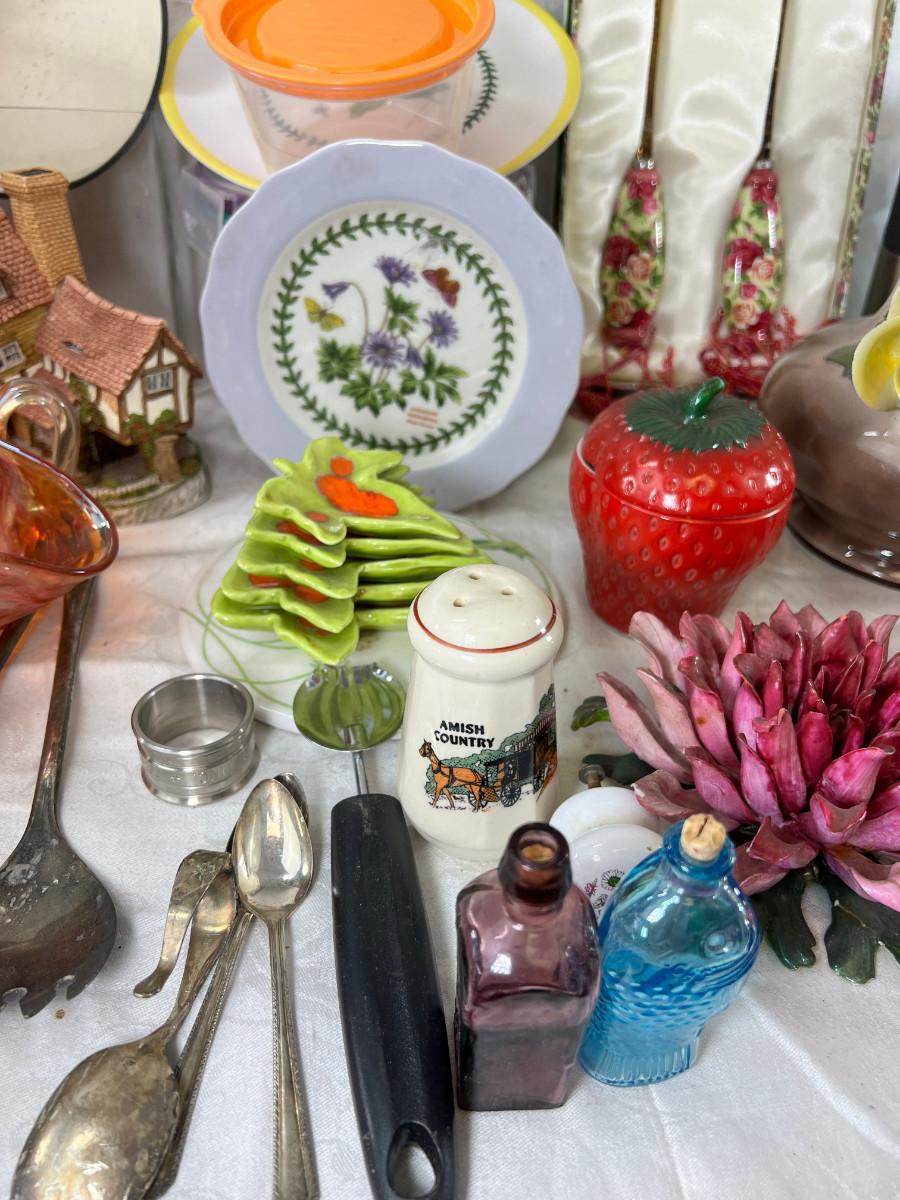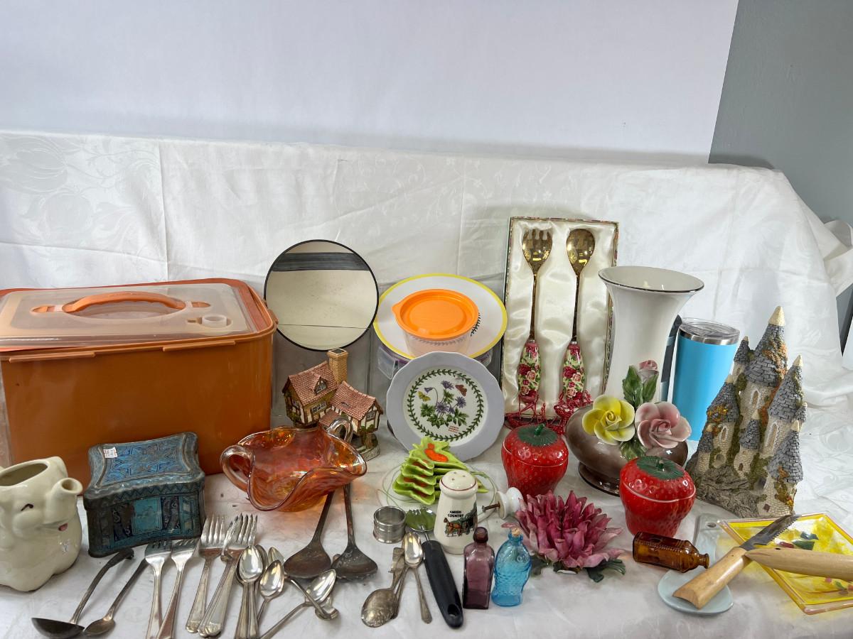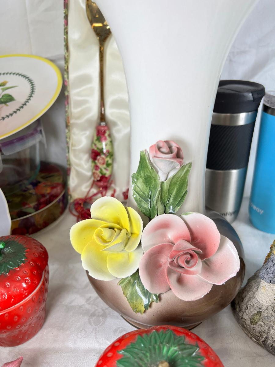 Capodimonte flowers, vases. leaf , vintage glass, fork and spoon salad set. Utensils, strawberry jam pots, perfume bottles.