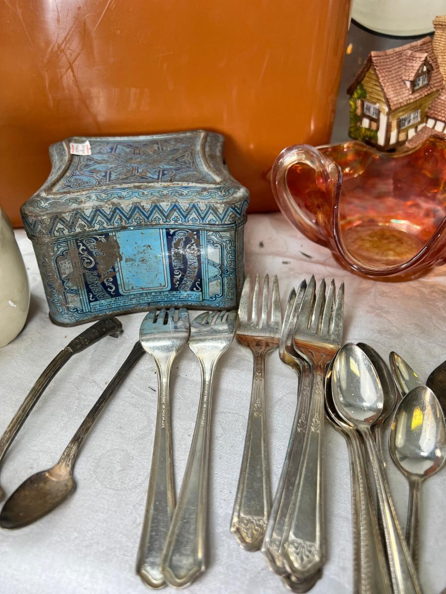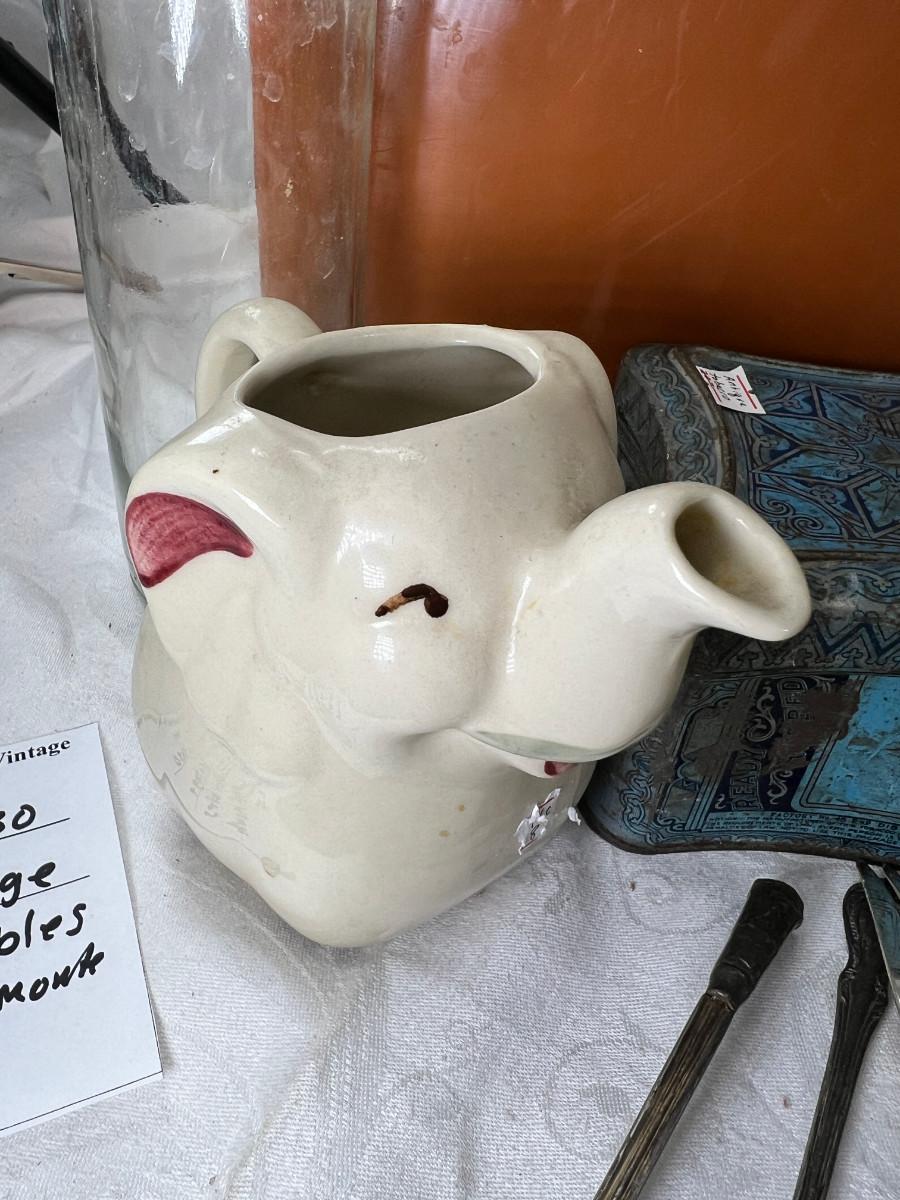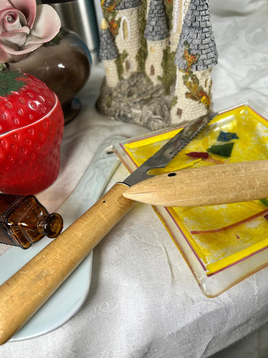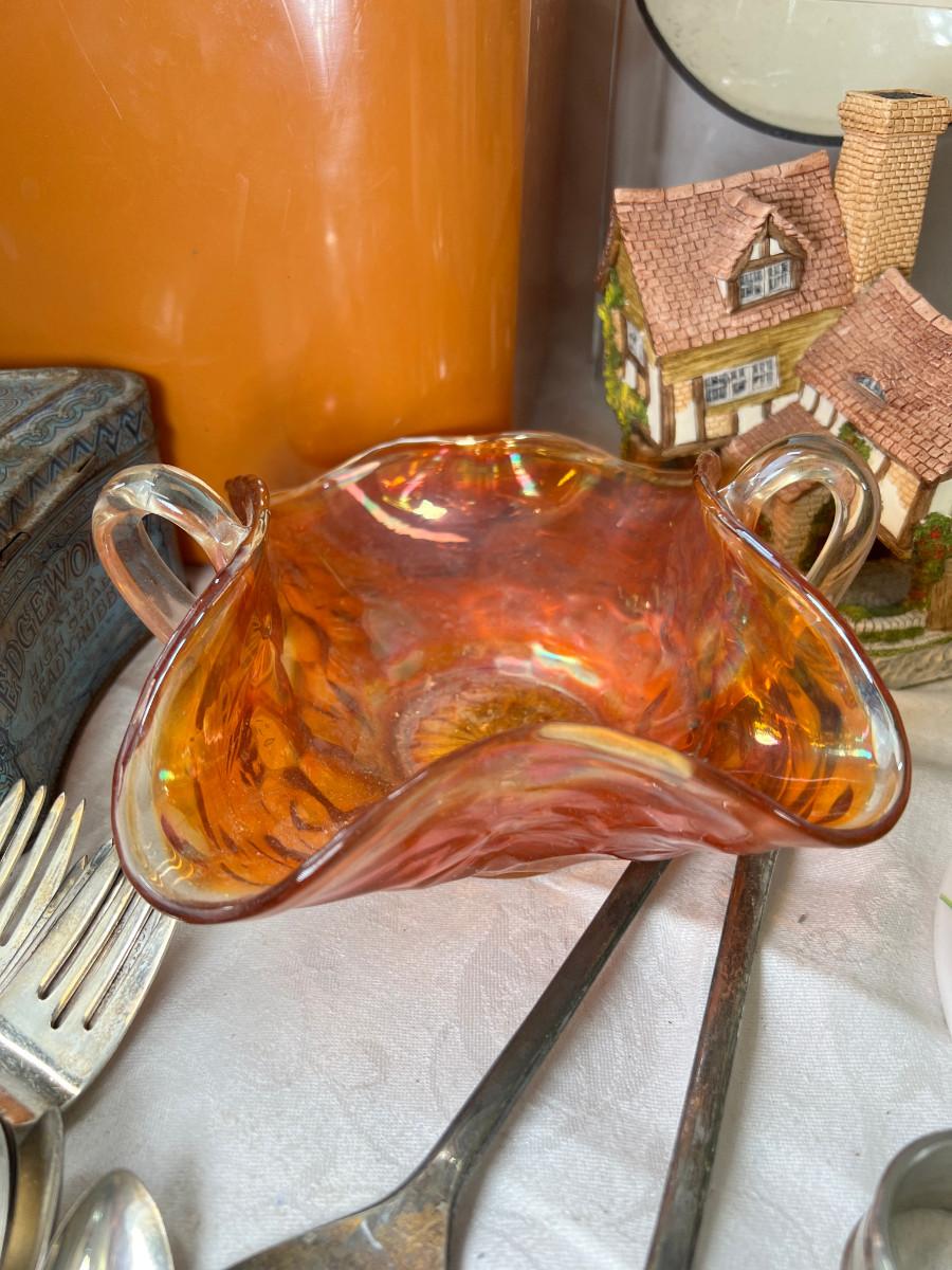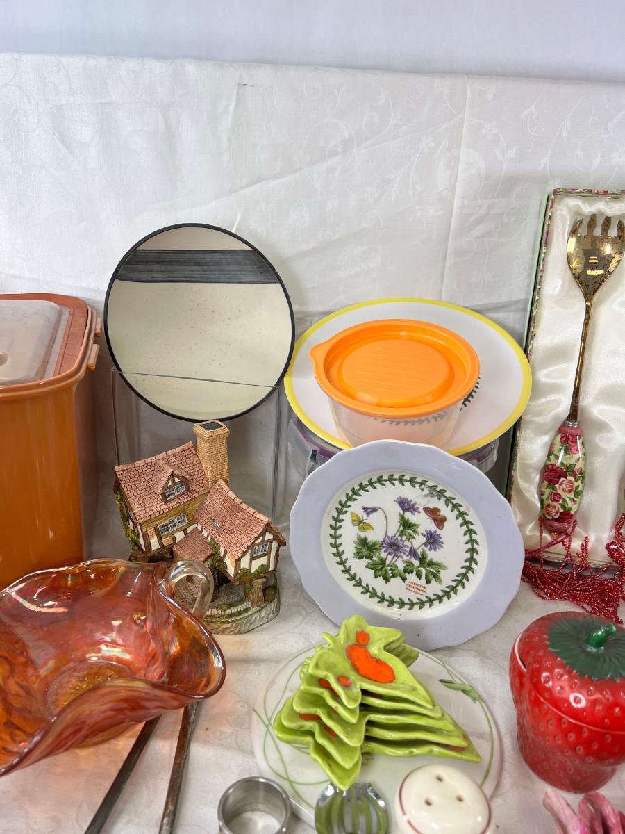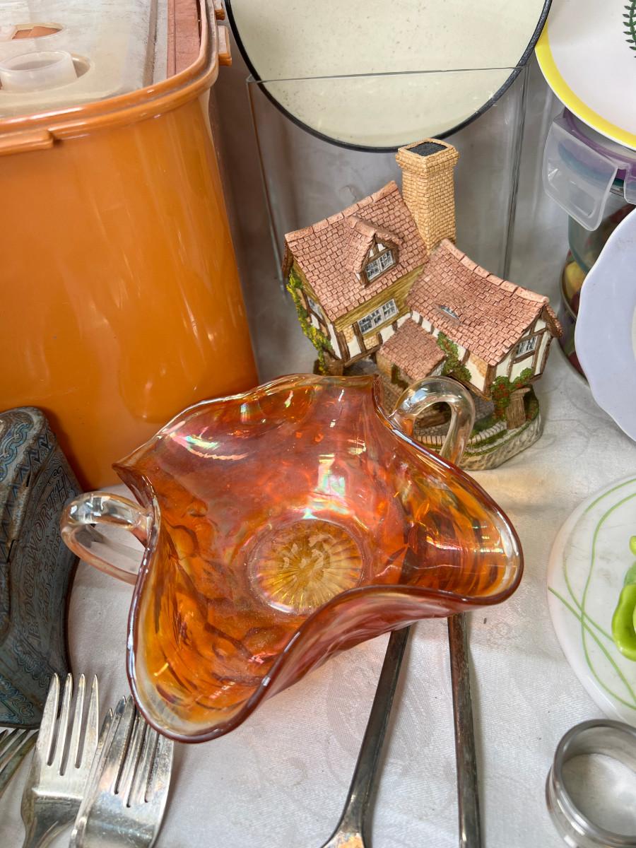 Capodimonte flowers, vases. leaf , vintage glass, fork and spoon salad set. Utensils, strawberry jam pots, perfume bottles.