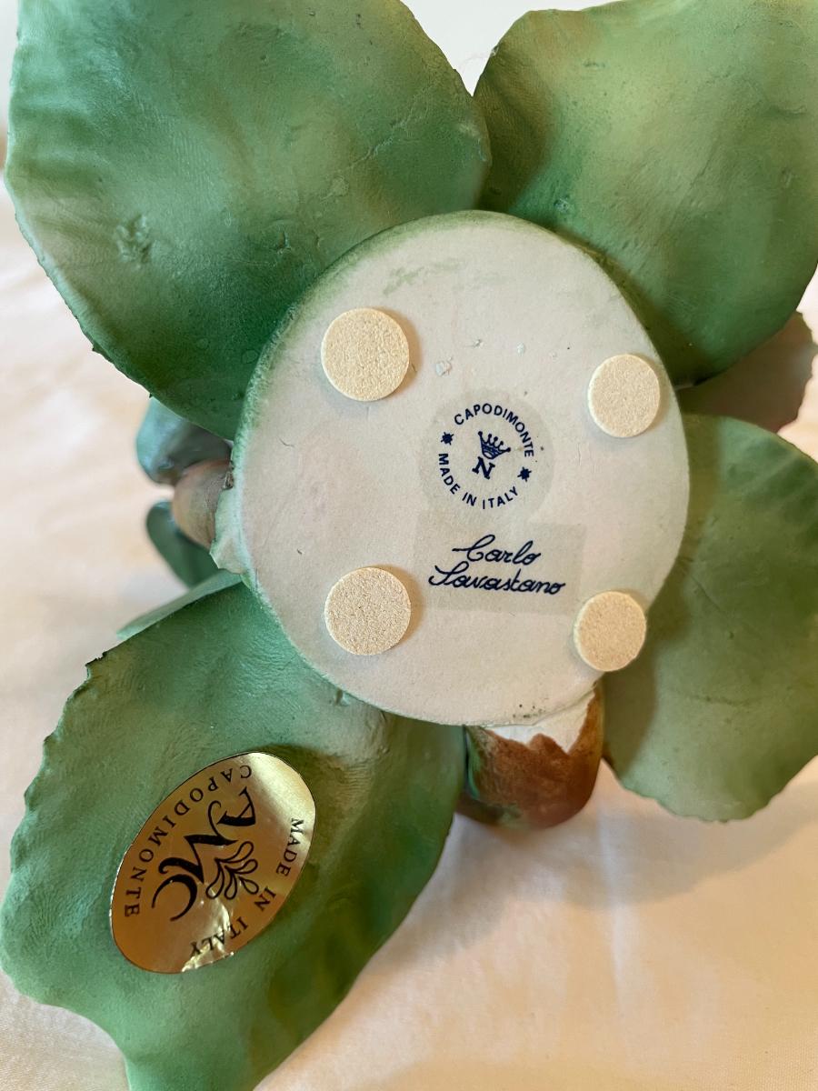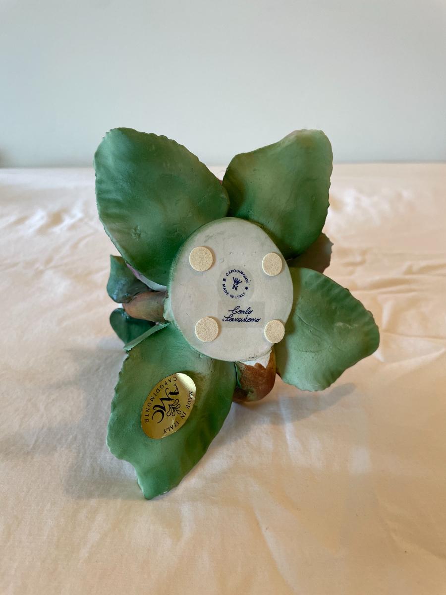 Capodimonte porcelain sculpture featuring a detailed floral design with pink flowers and green leaves. Handmade in Italy by artist Carla Lavatore. Includes the Capodimonte hallmark and original sticker on the underside. Item measures approximately 5.5 inches in diameter. Excellent condition with no visible chips or cracks.