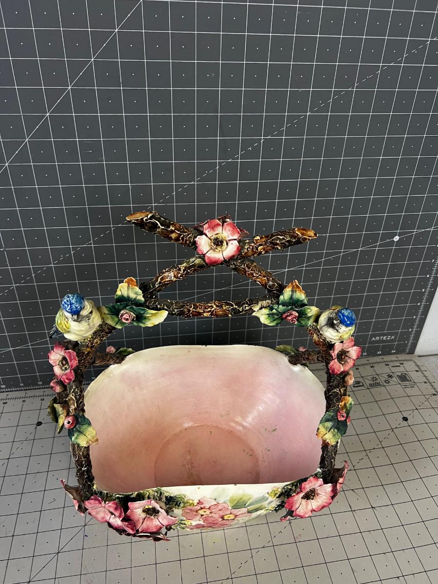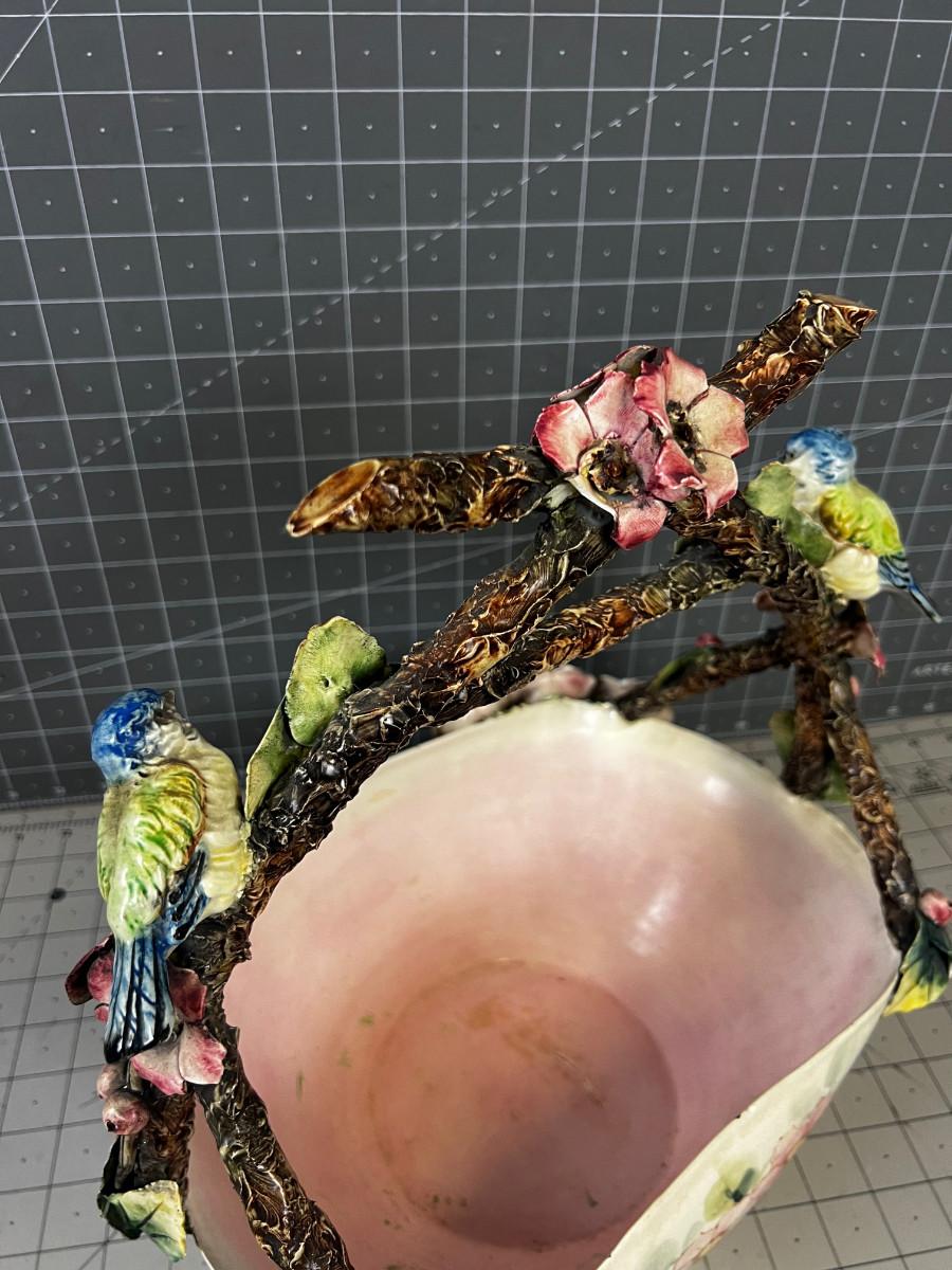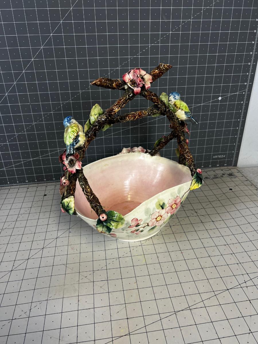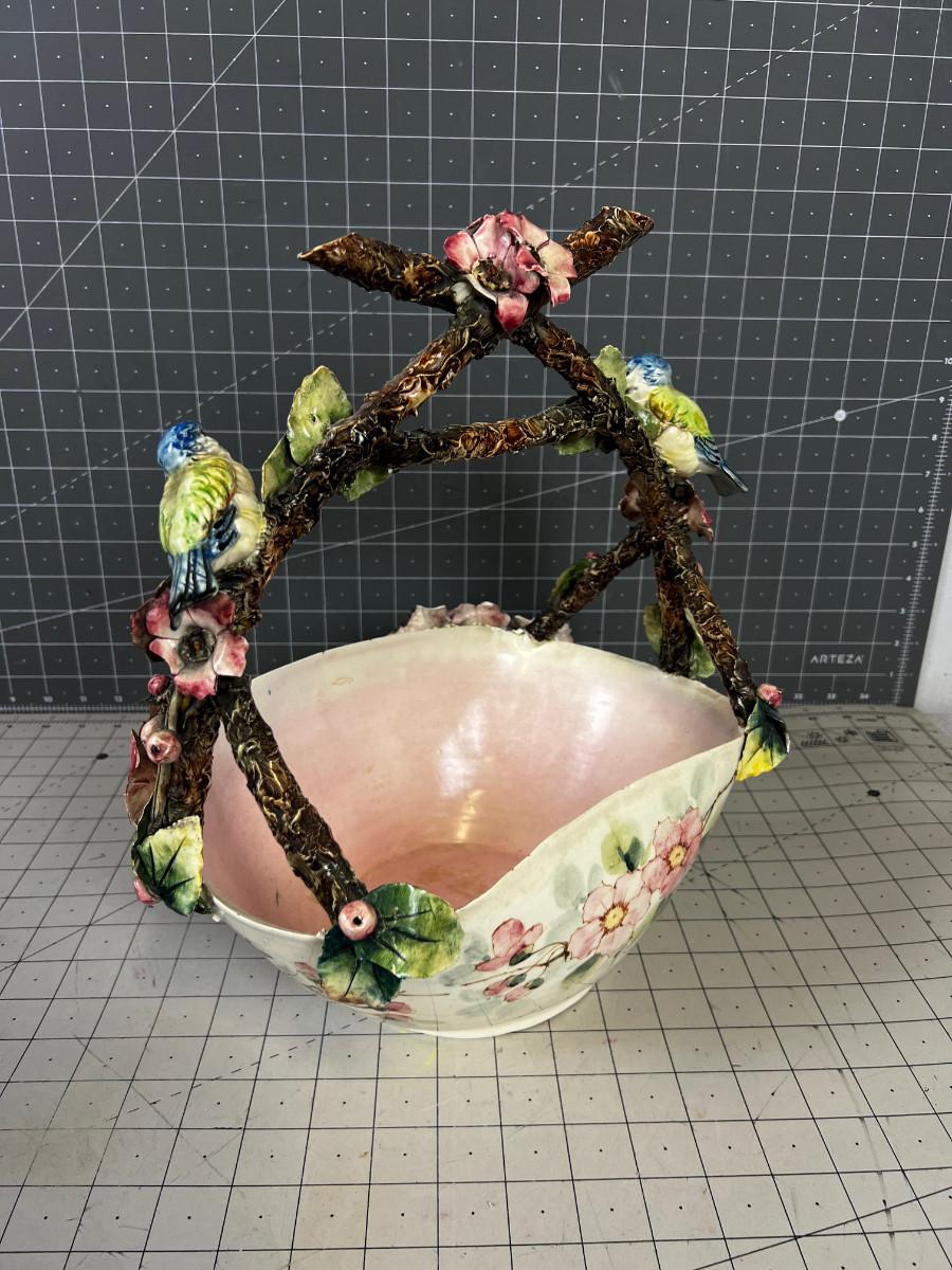 Capodimonte Italian Majolica Hand Painted Floral Bowl with Twigs and Birds