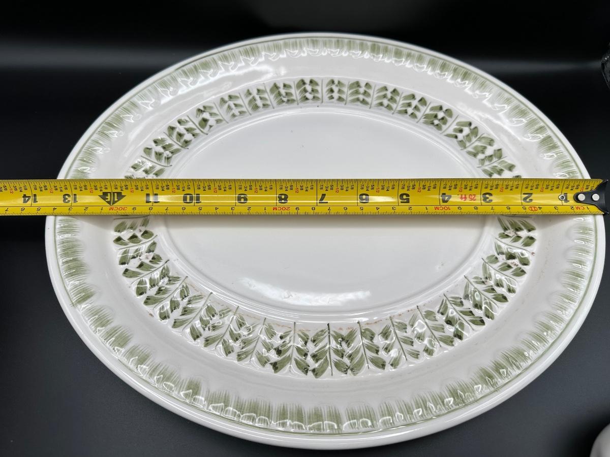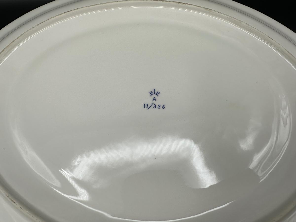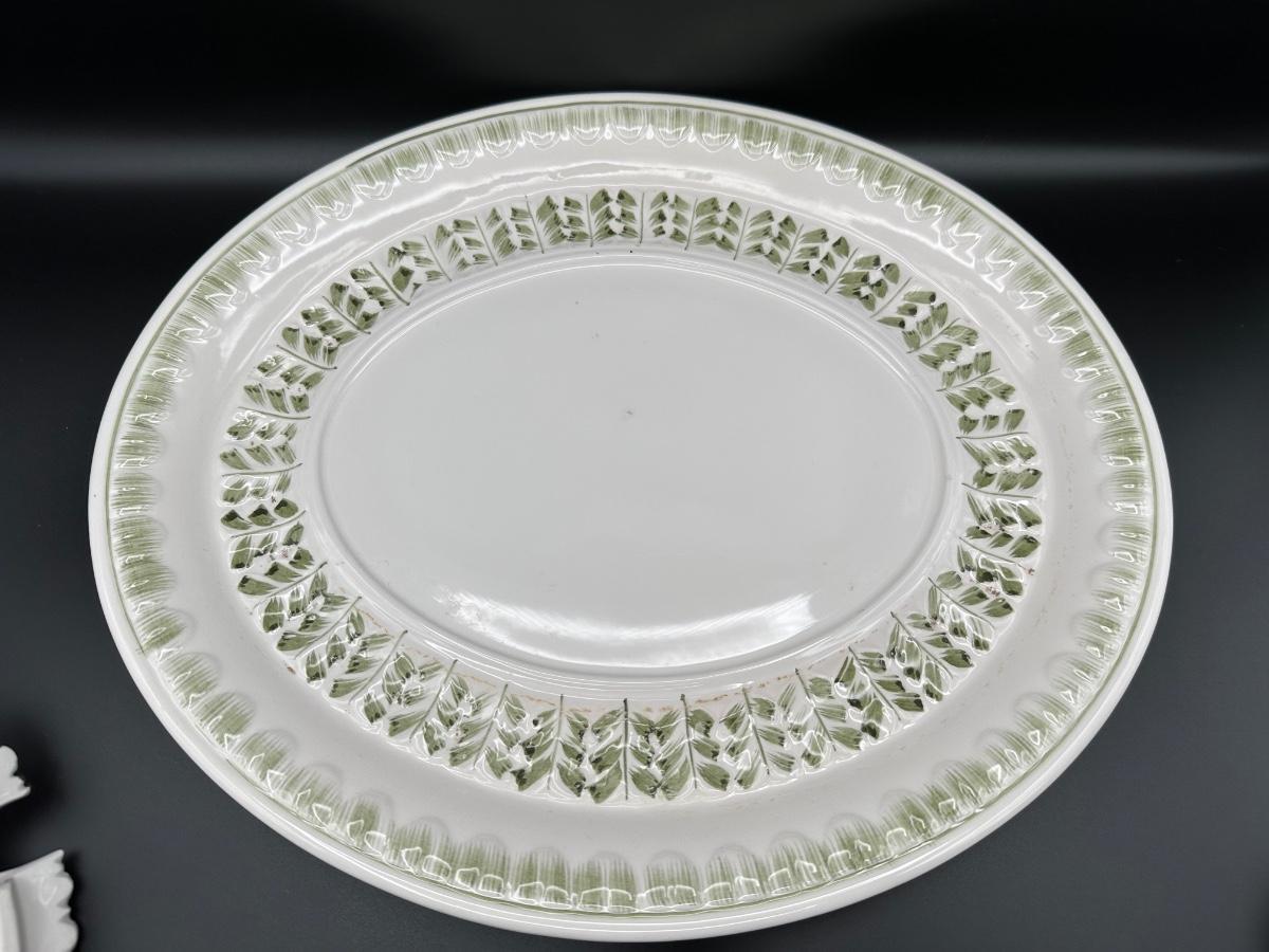 Very Nice Tureen, Ladle, And Underplate. This piece has raised various fruit around the top of the lid and around the body of the tureen. There are textured designs around the bottom half of the tureen with green accents and a textured laurel style around the top rim and top of the lid. The underplate has a textured rim and inside border with green accents.