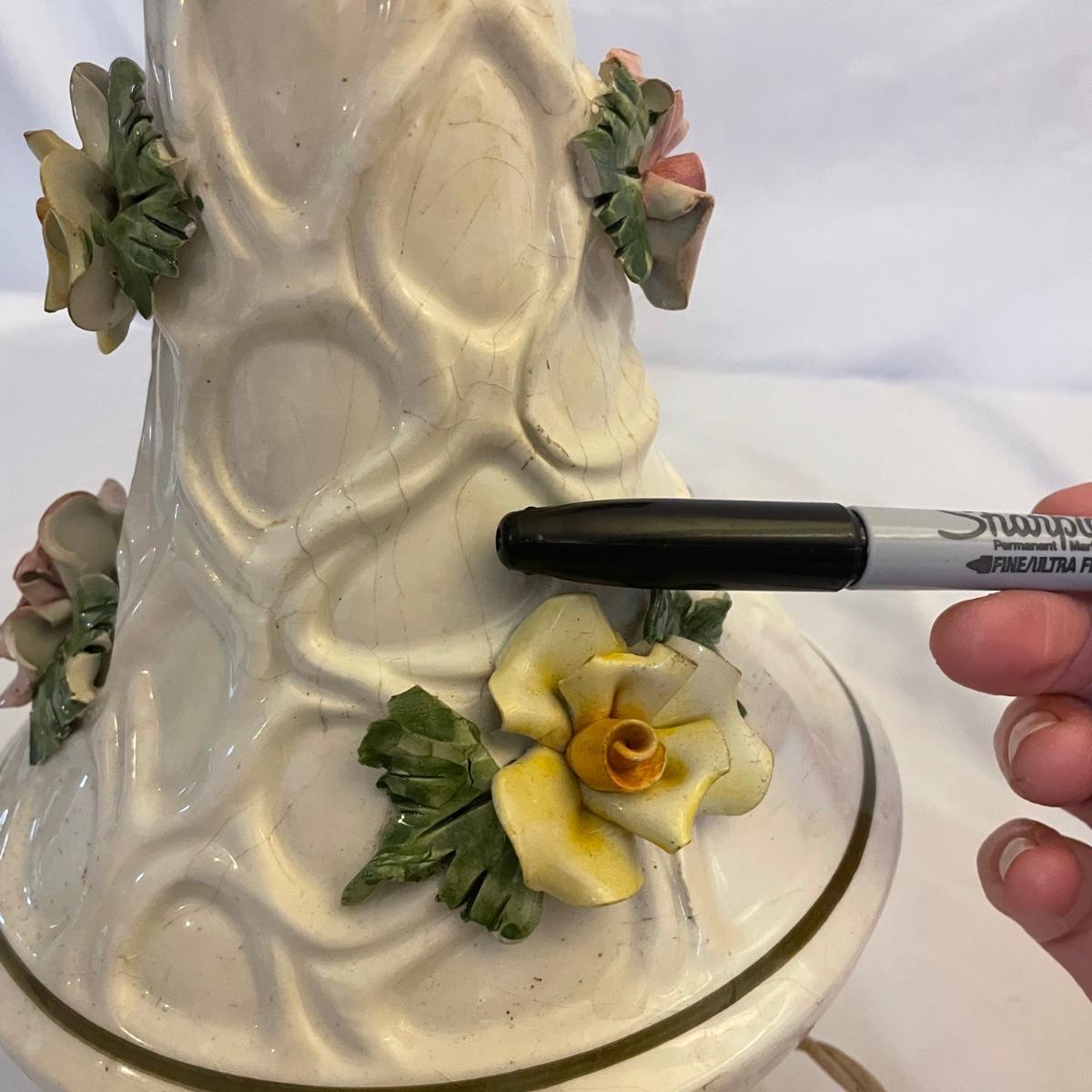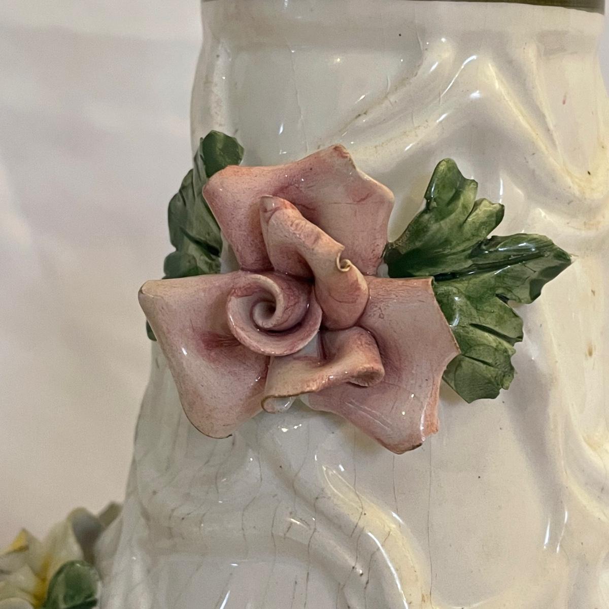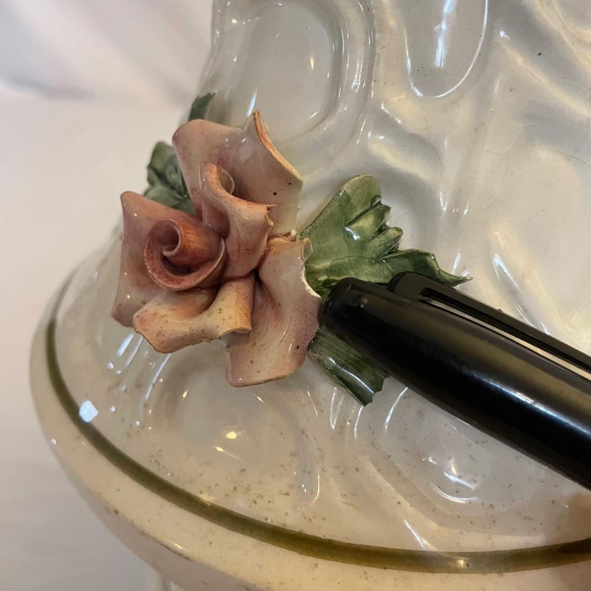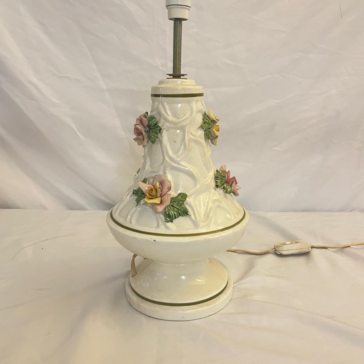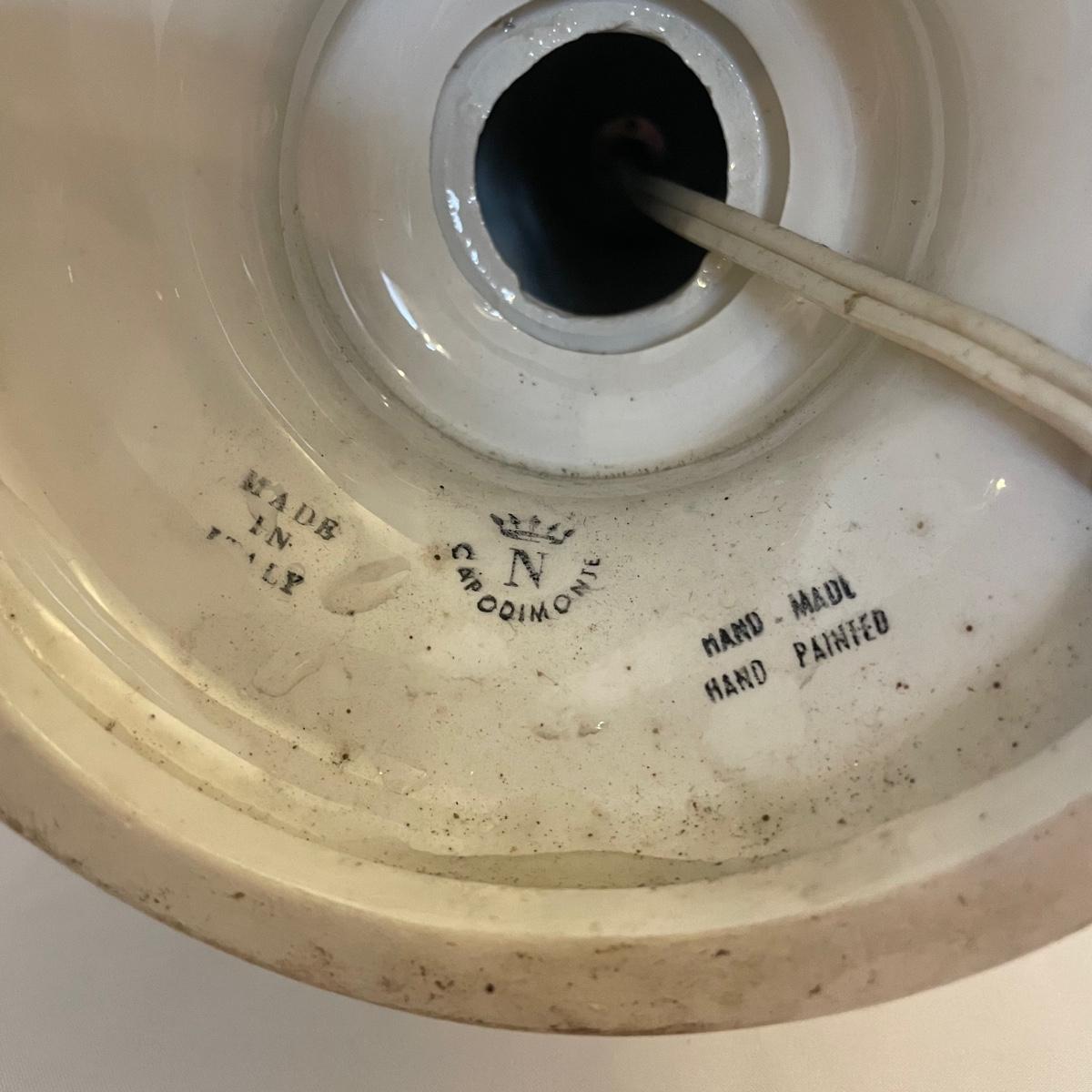 This hand painted Capodimonte porcelain lamp with in-line switch stands 15” tall with a 5” d base. It takes an E12 bulb and was not tested. There are a few small chips and some minor glaze crazing shown in images.