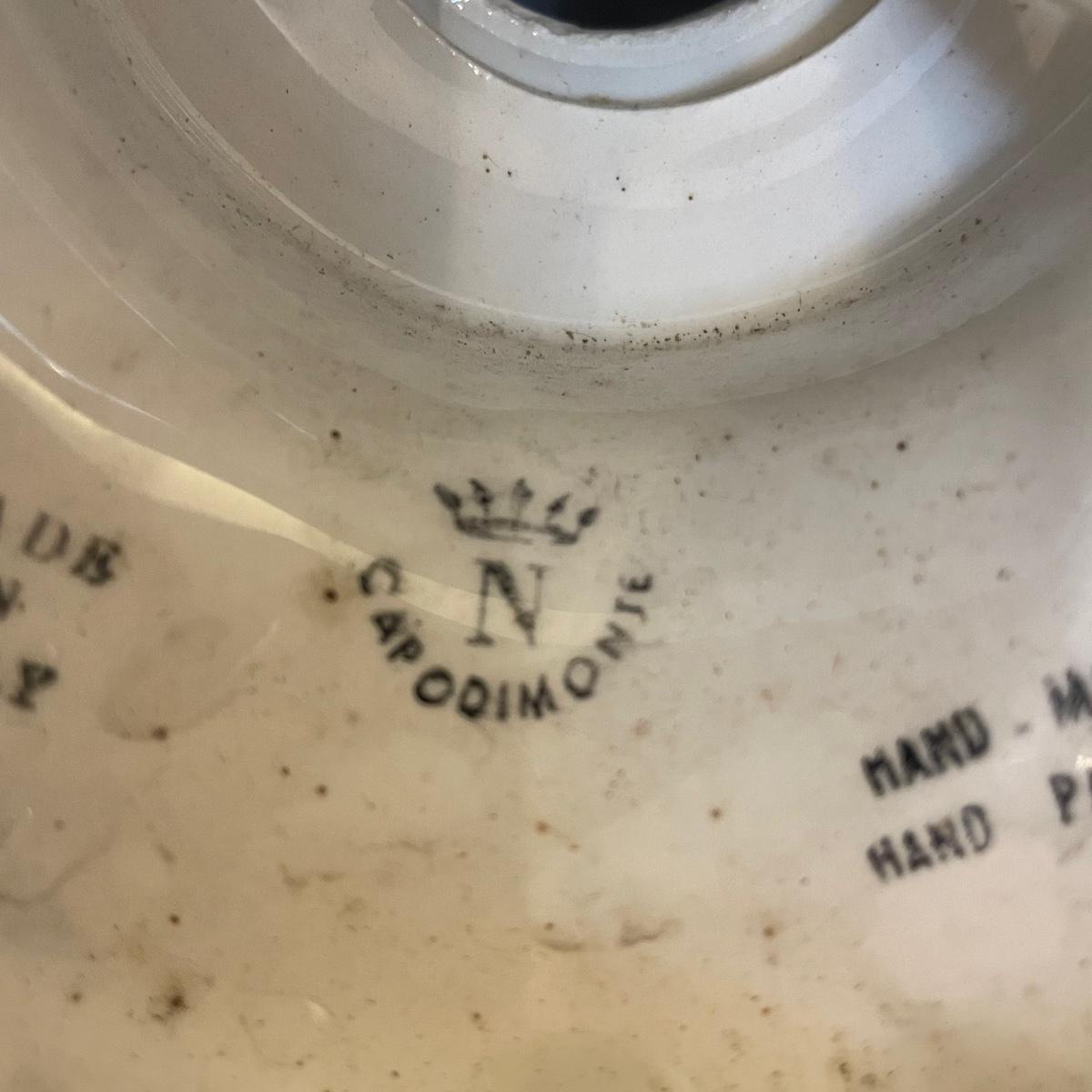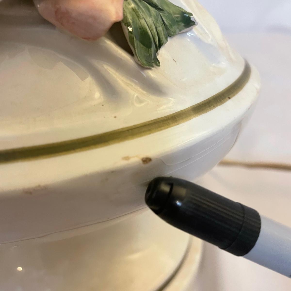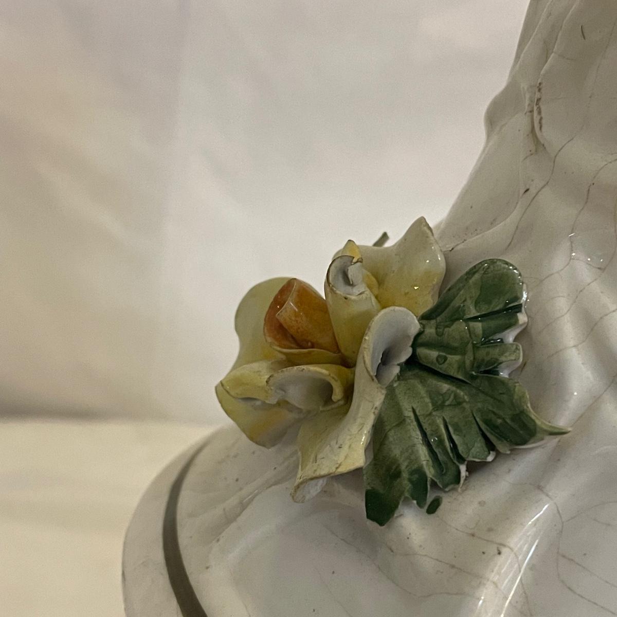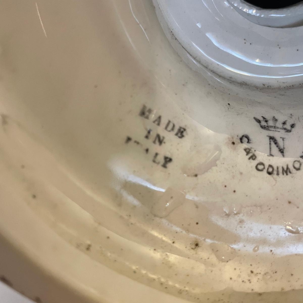 This hand painted Capodimonte porcelain lamp with in-line switch stands 15” tall with a 5” d base. It takes an E12 bulb and was not tested. There are a few small chips and some minor glaze crazing shown in images.