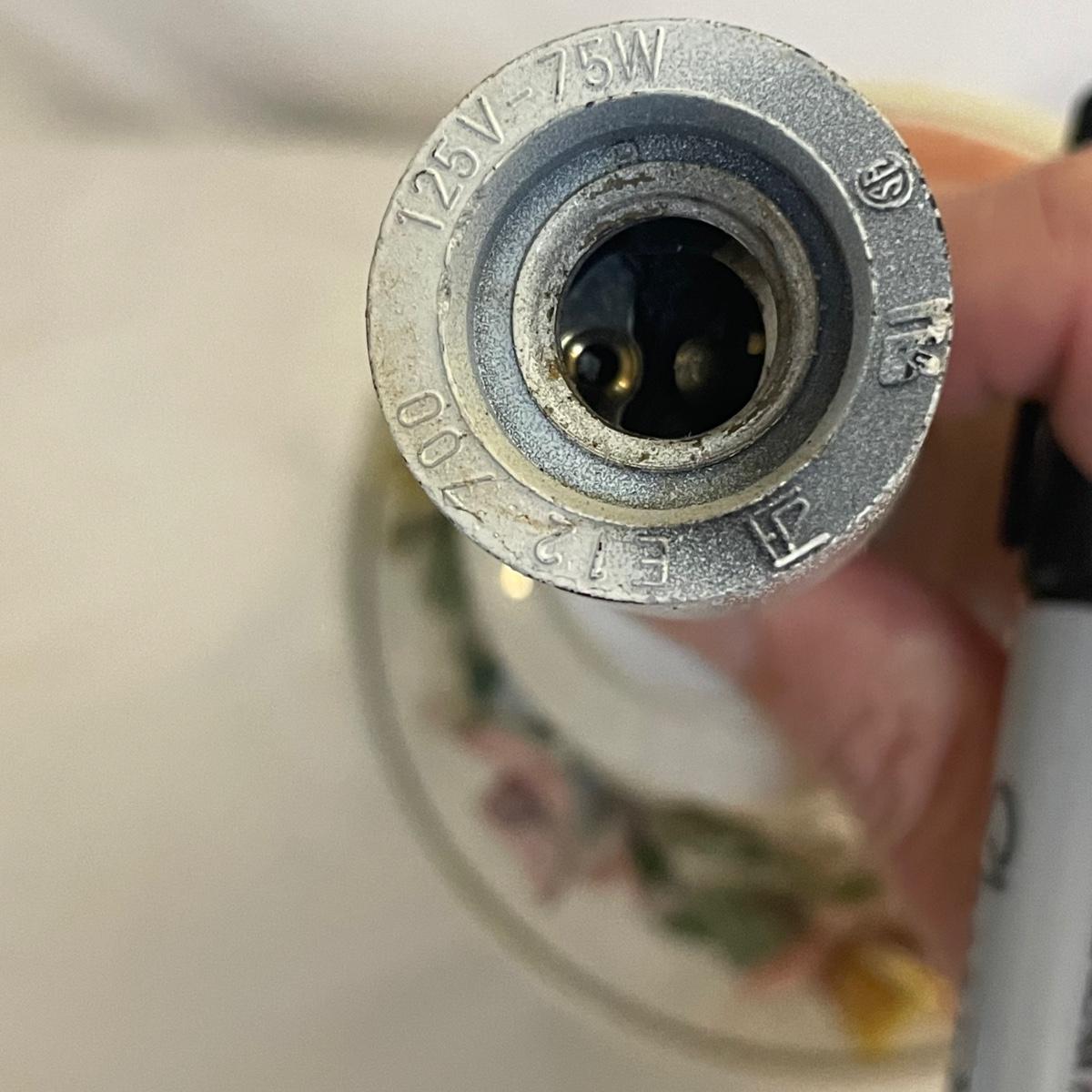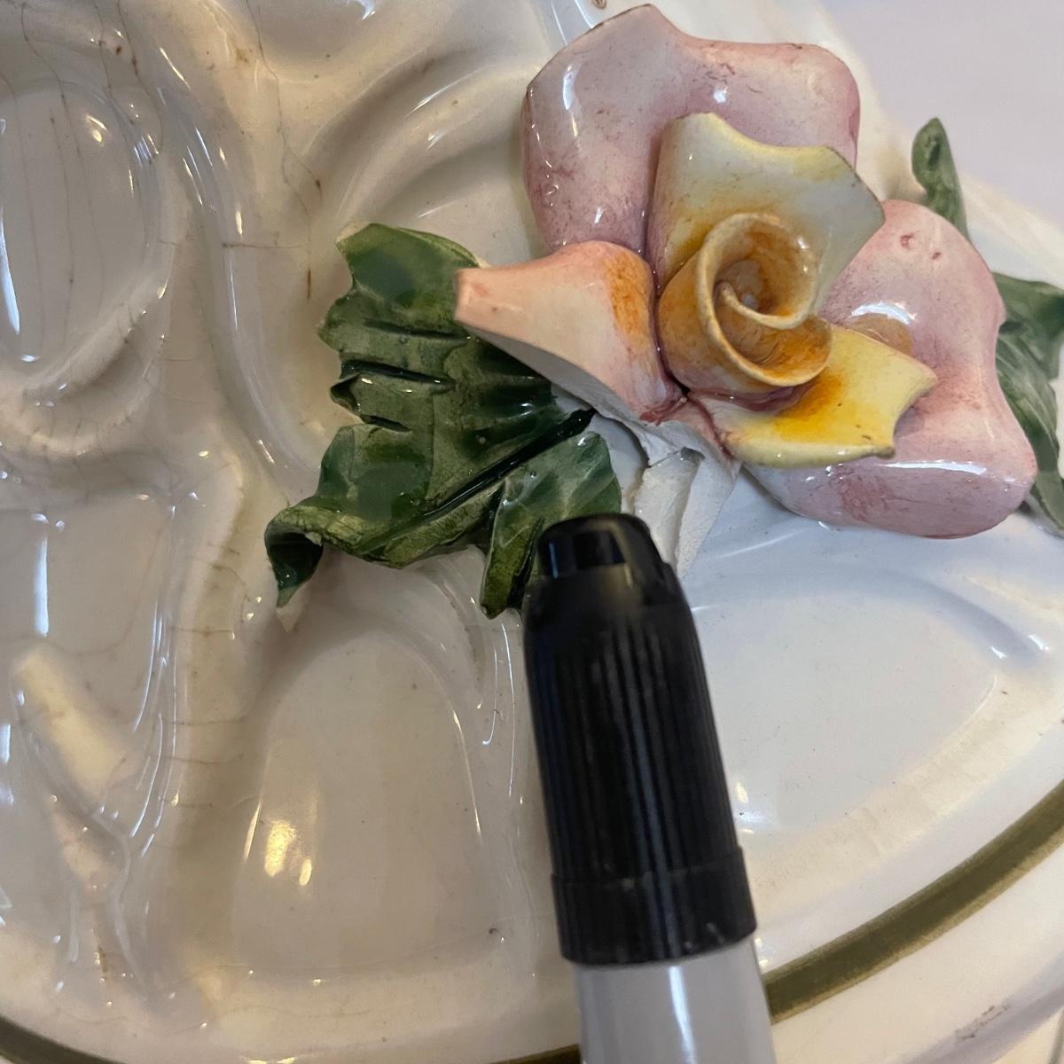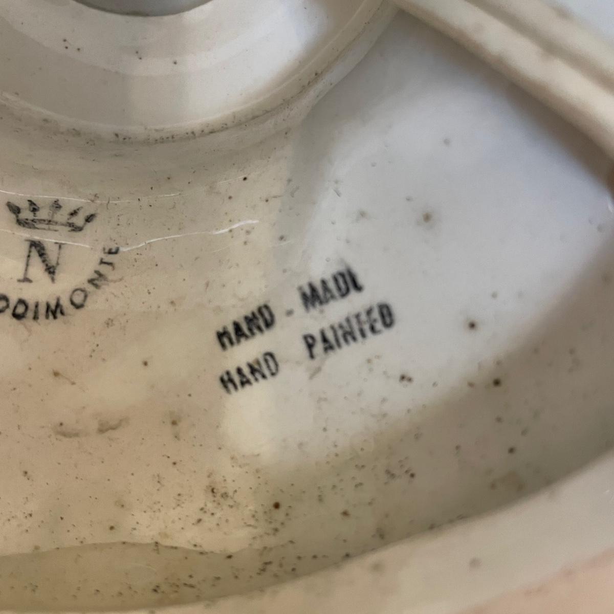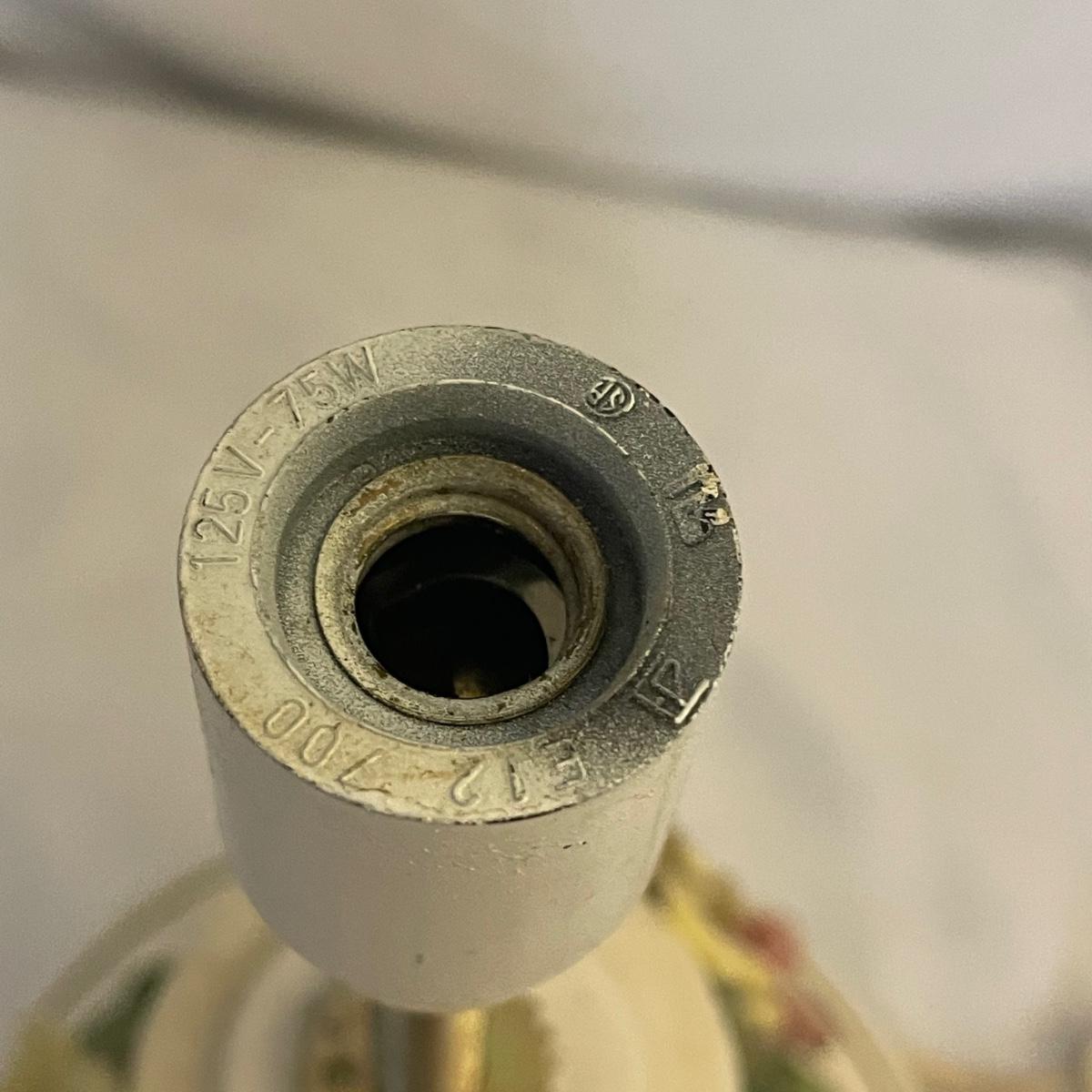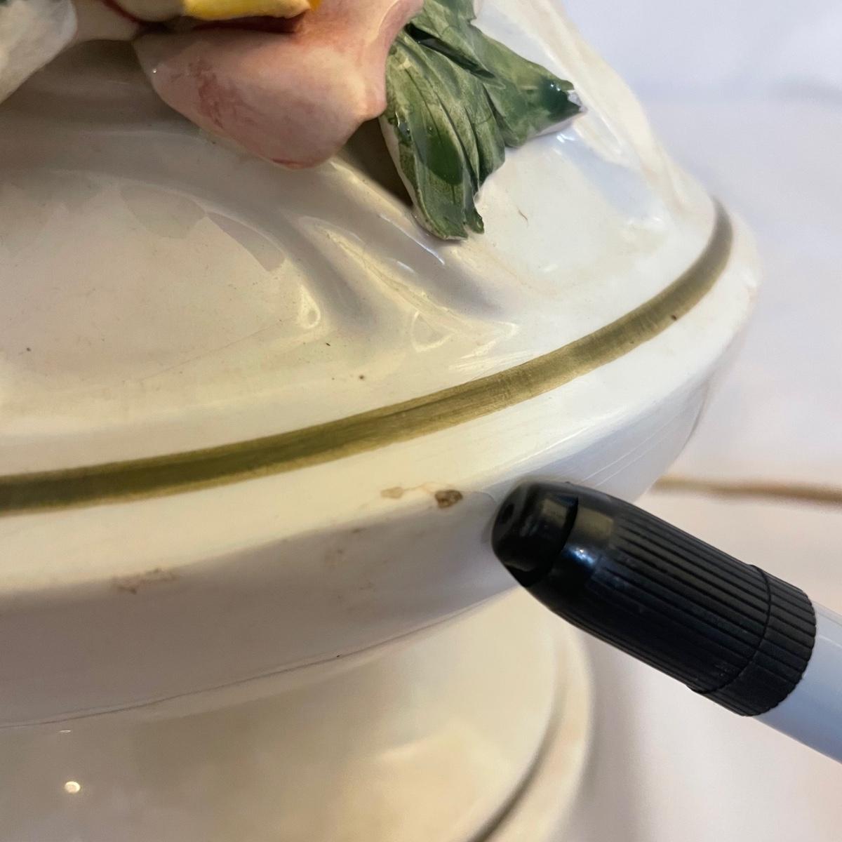 This hand painted Capodimonte porcelain lamp with in-line switch stands 15” tall with a 5” d base. It takes an E12 bulb and was not tested. There are a few small chips and some minor glaze crazing shown in images.