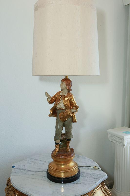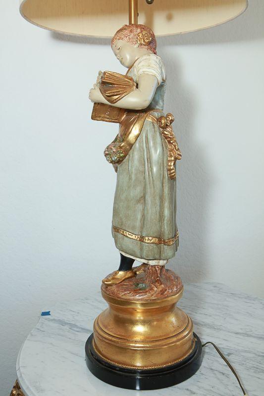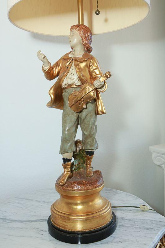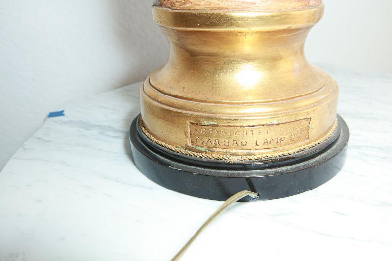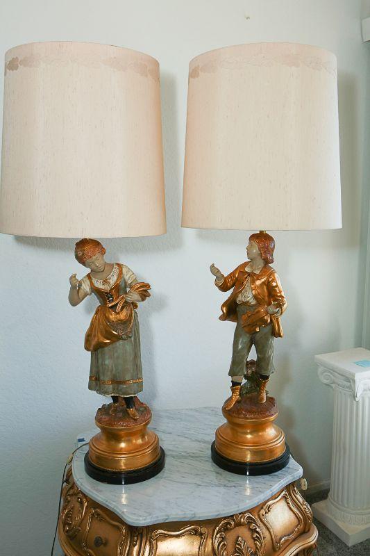 Vintage Marbro Lamp Co figural table lamps. A boy and girl matching pair. Gold paint accents. Heavy. Very little wear, there is a crack in the boys neck. Matching shades included.