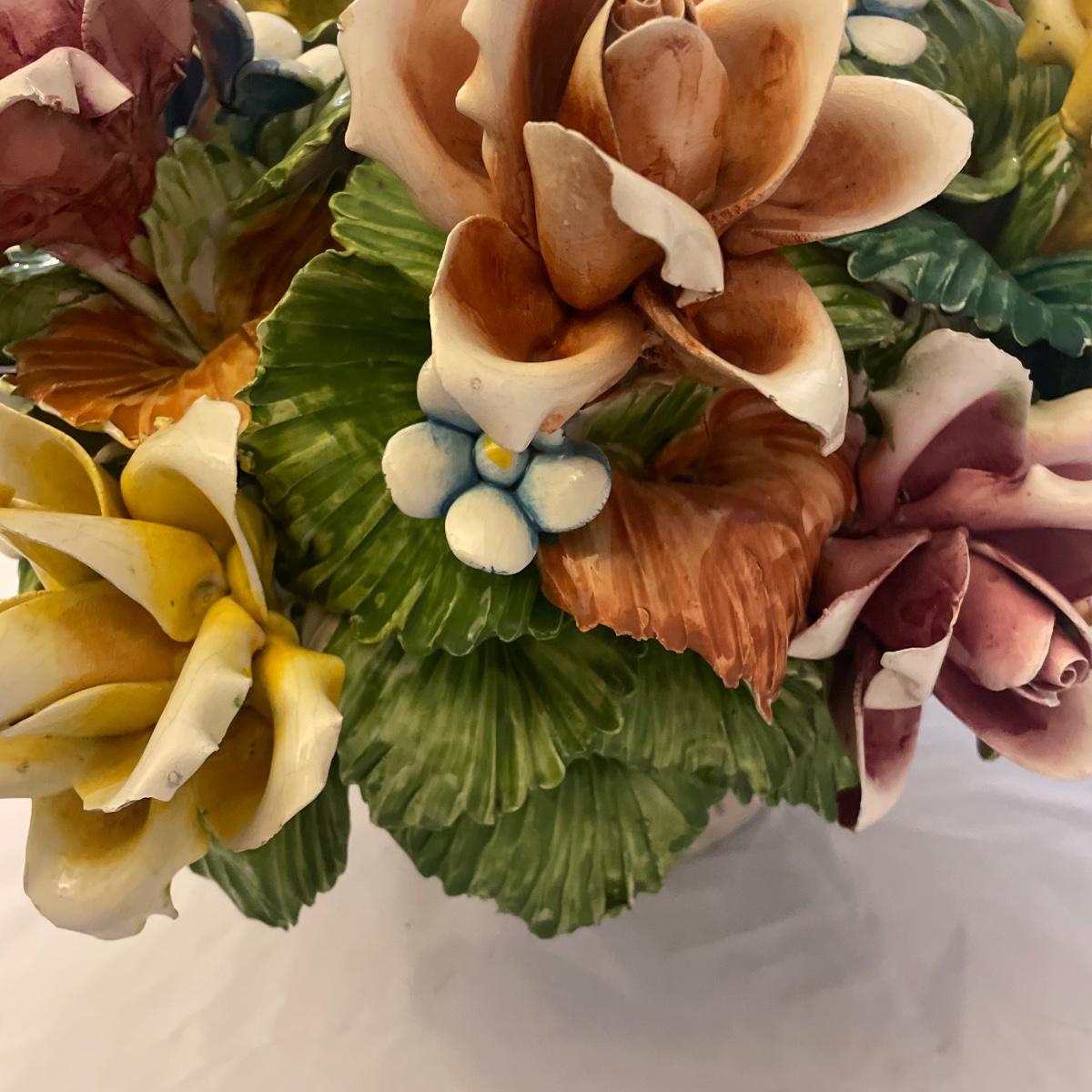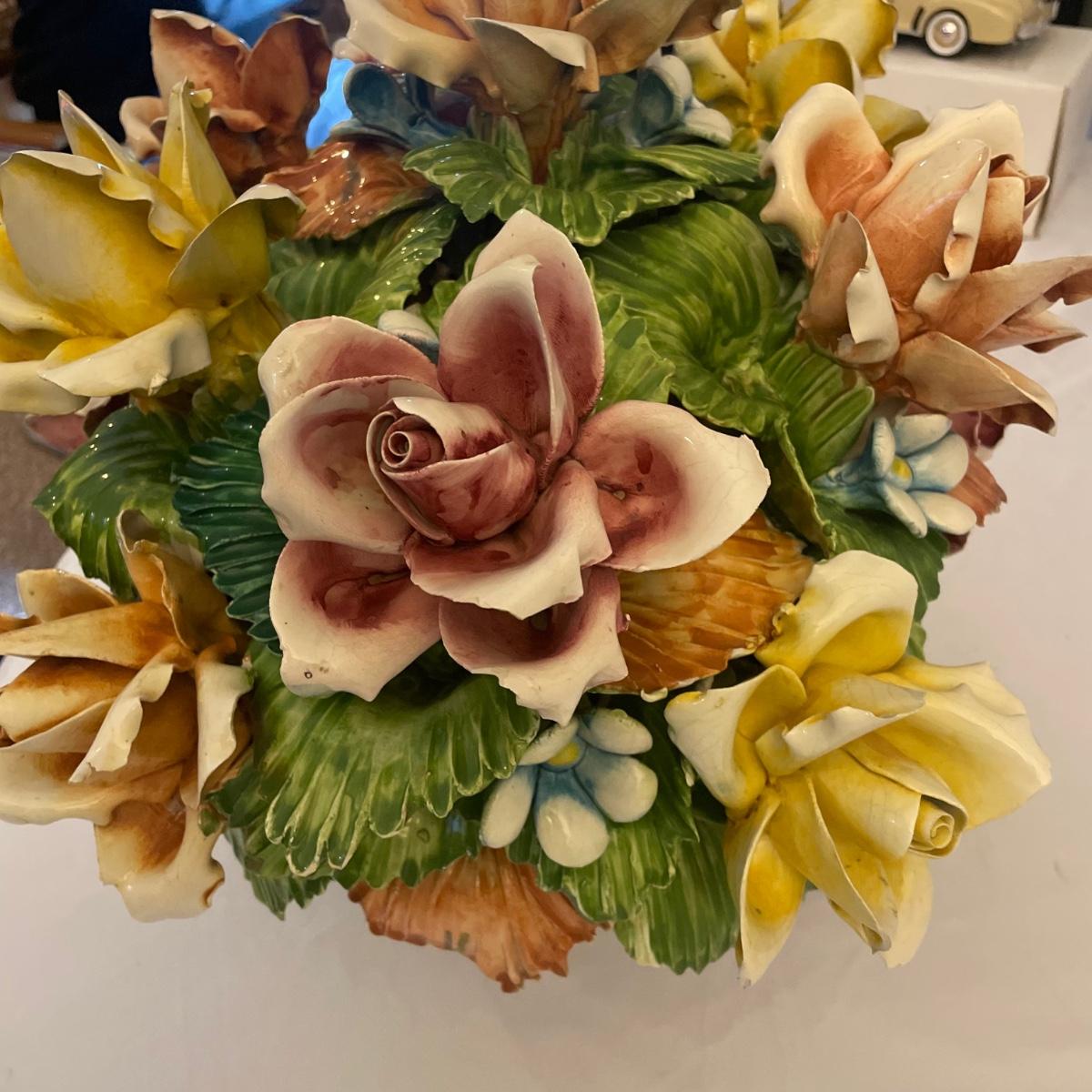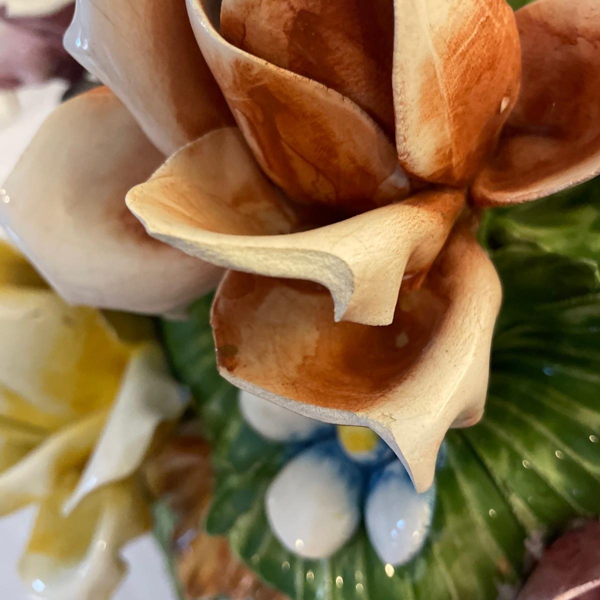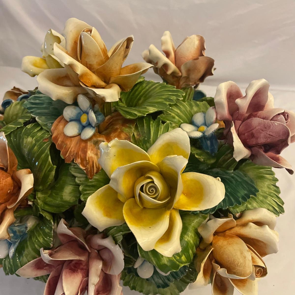 This large porcelain floral arrangement has the makers stamp but it is quite faint so we cannot guarantee that it is an authentic Capodimonte? There are some chips on flowers that are shown in images and some minor crazing, all of which do not affect the overall beauty of this piece as you have to look quite hard to find the chips; see images.