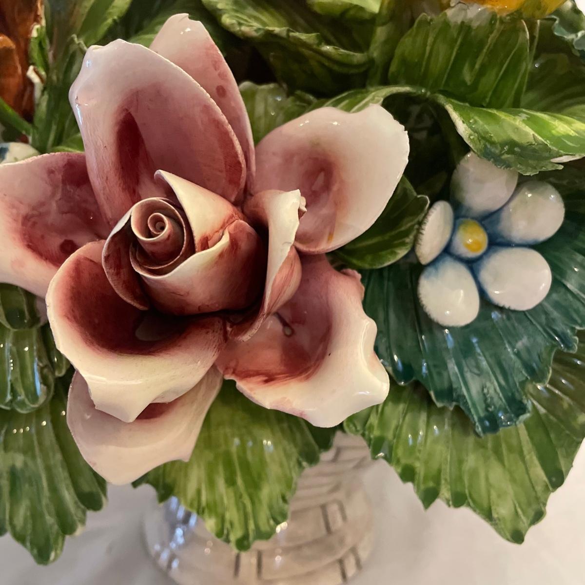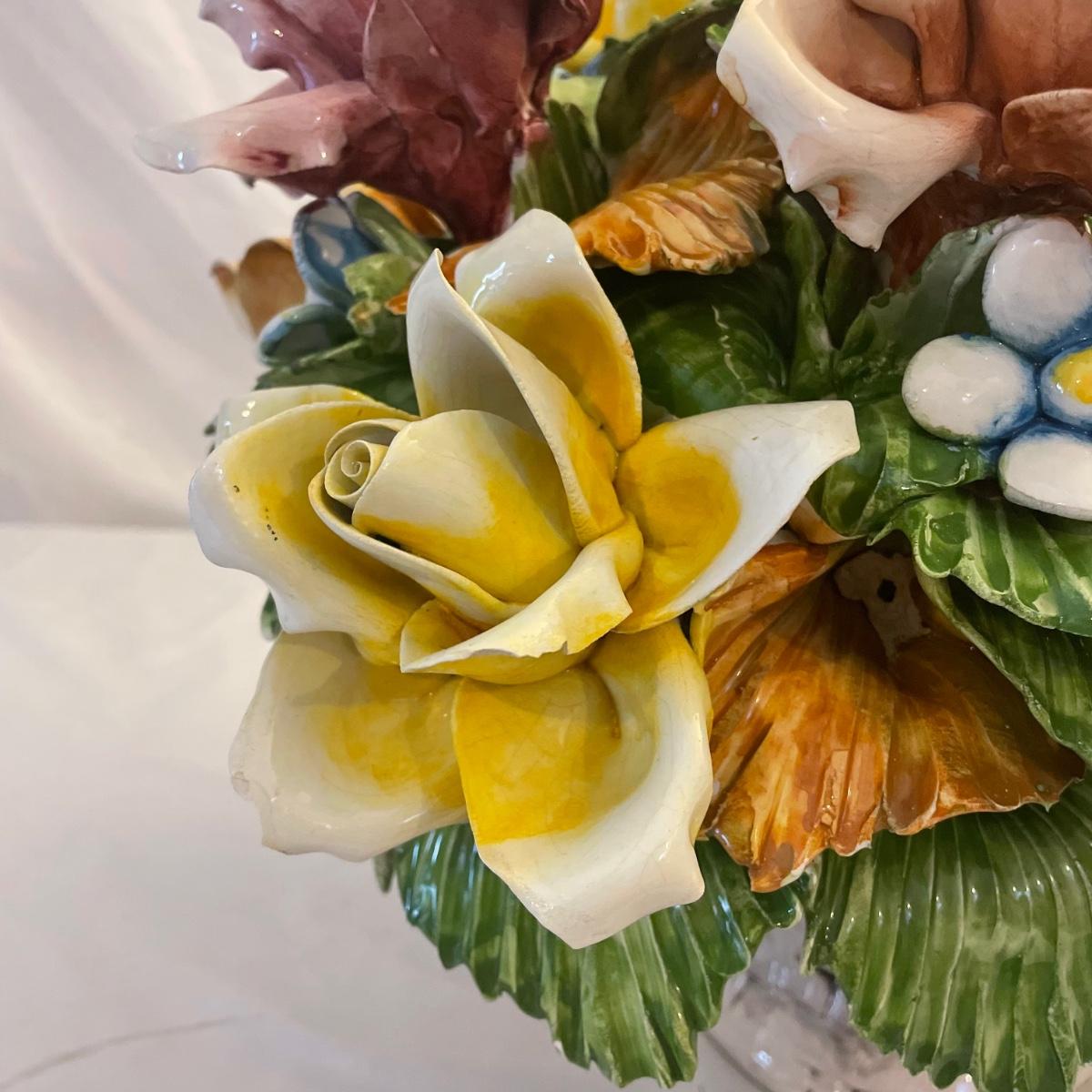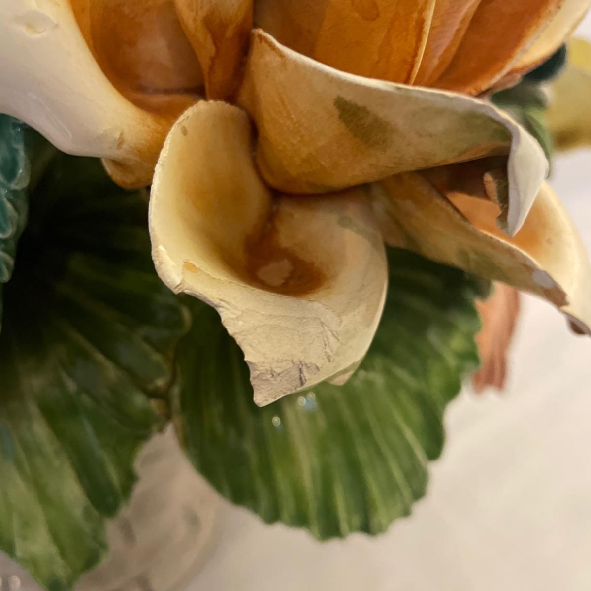 This large porcelain floral arrangement has the makers stamp but it is quite faint so we cannot guarantee that it is an authentic Capodimonte? There are some chips on flowers that are shown in images and some minor crazing, all of which do not affect the overall beauty of this piece as you have to look quite hard to find the chips; see images.