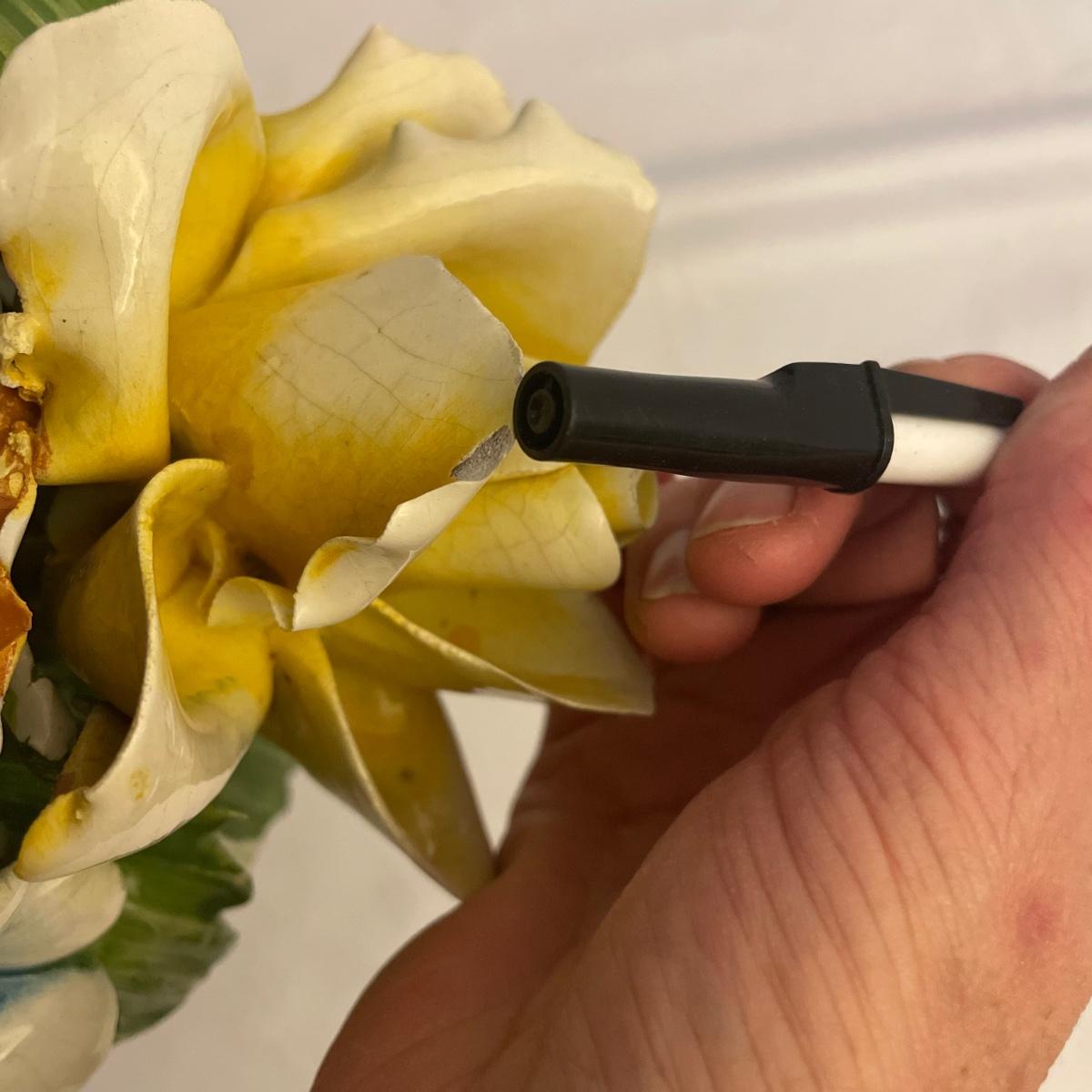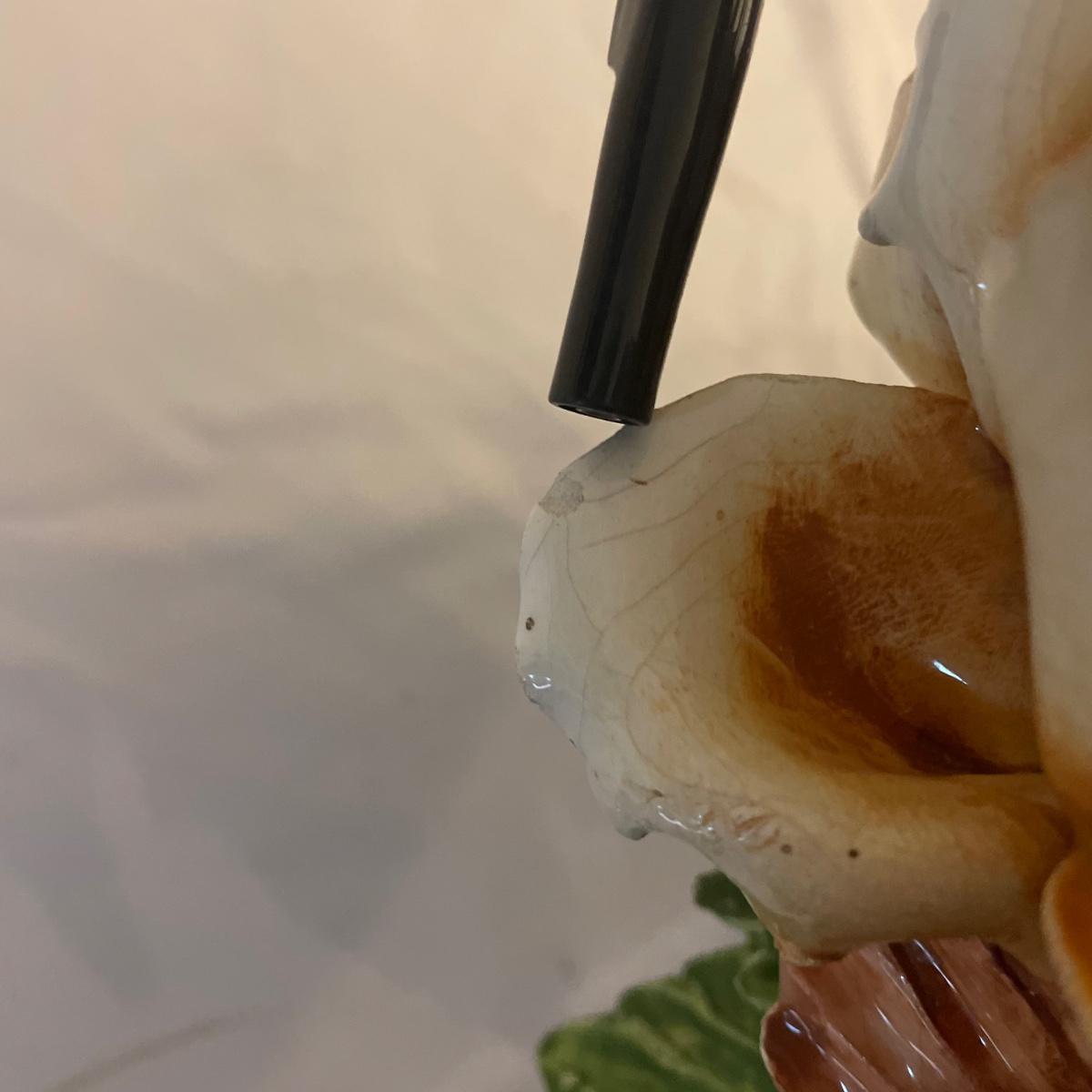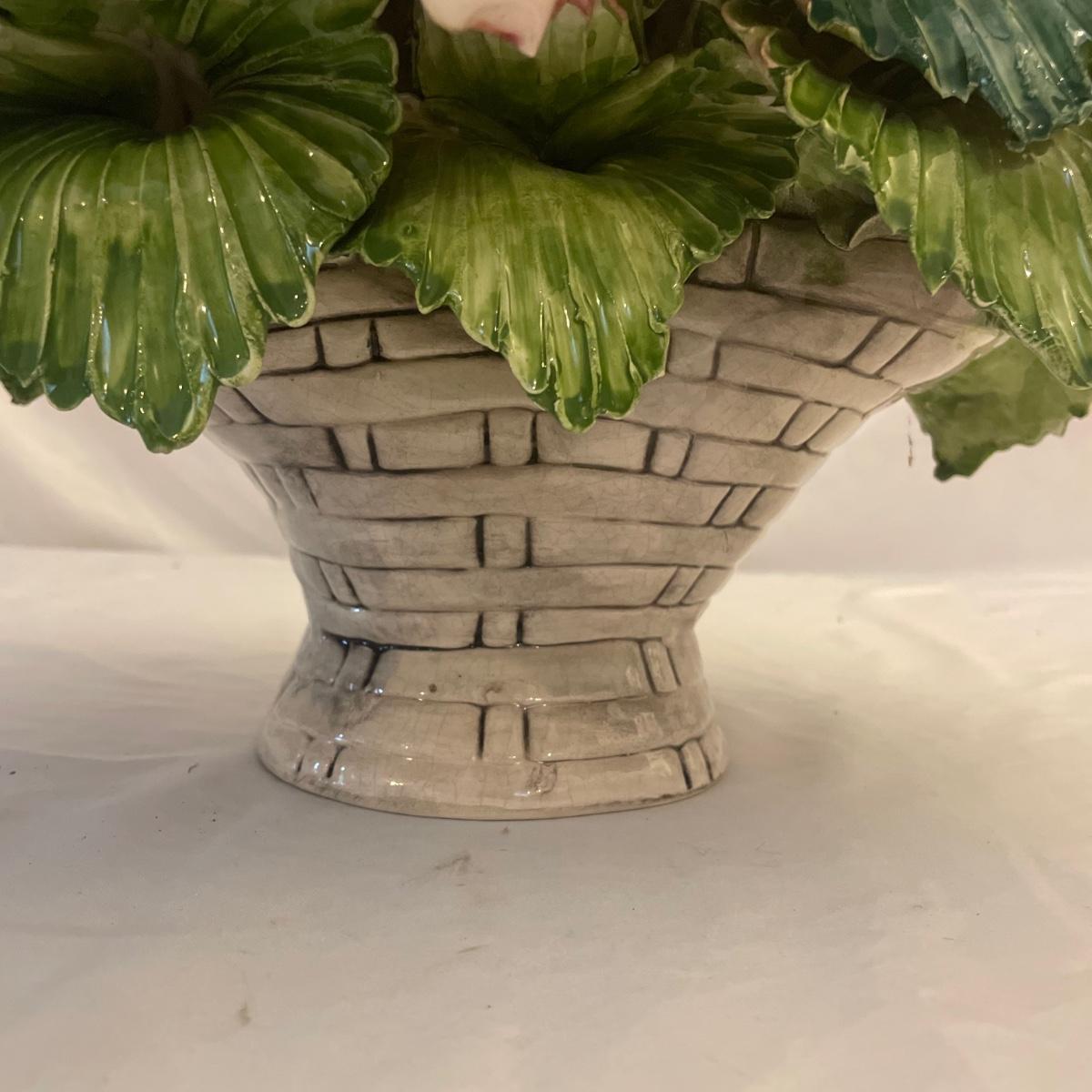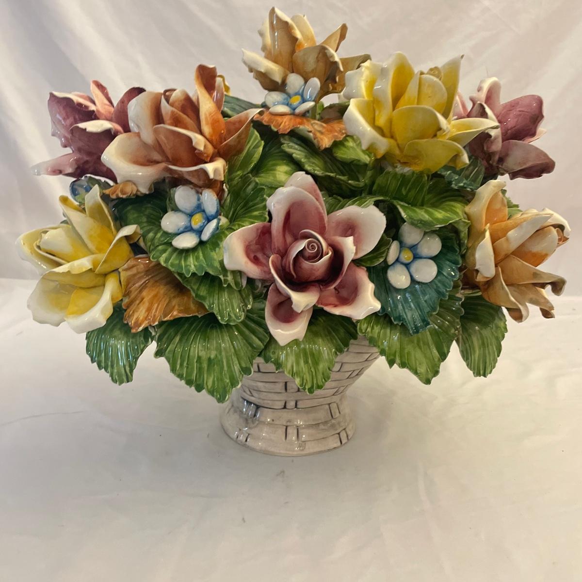 This large porcelain floral arrangement has the makers stamp but it is quite faint so we cannot guarantee that it is an authentic Capodimonte? There are some chips on flowers that are shown in images and some minor crazing, all of which do not affect the overall beauty of this piece as you have to look quite hard to find the chips; see images.