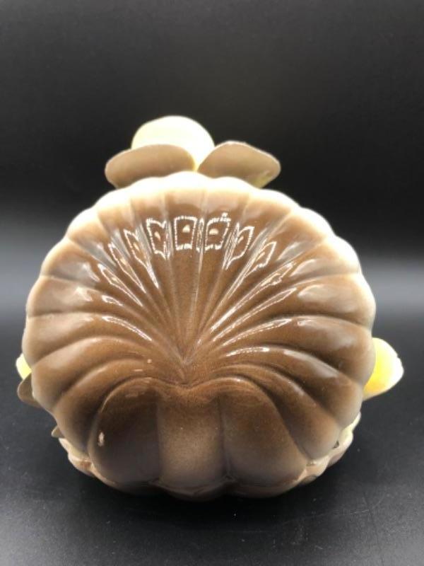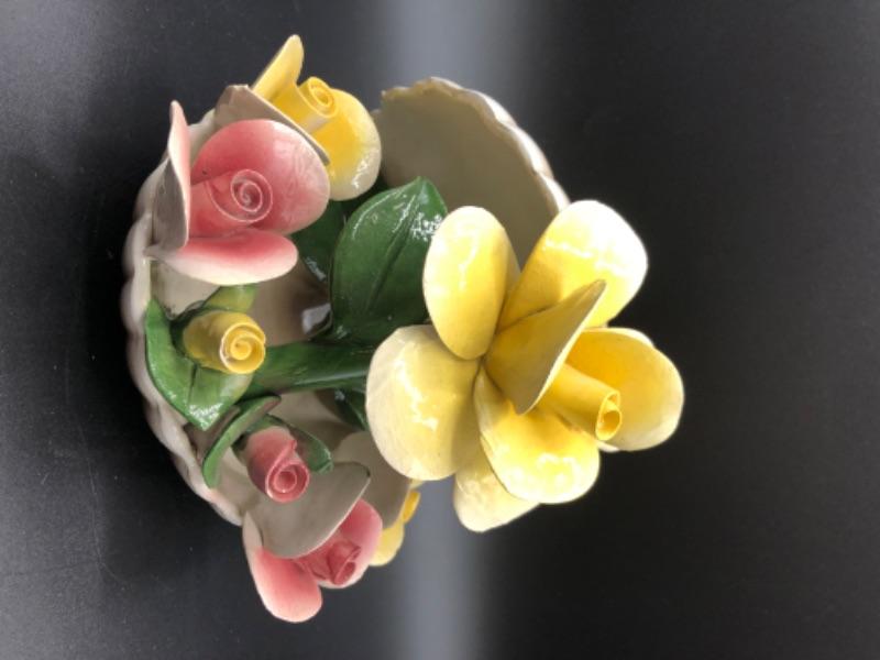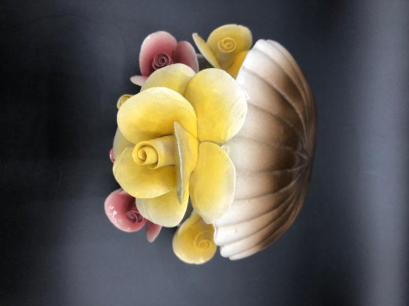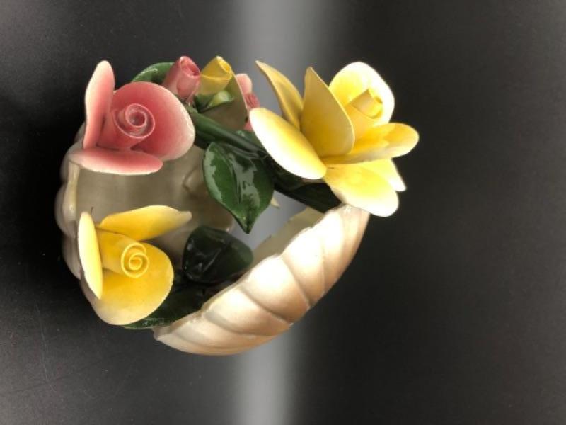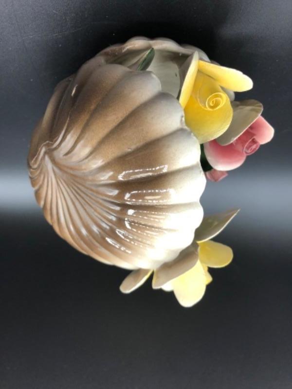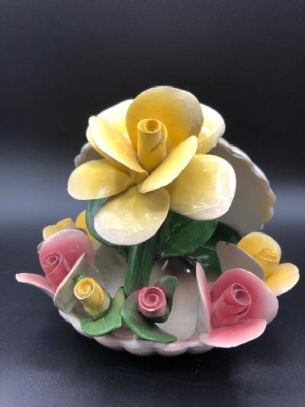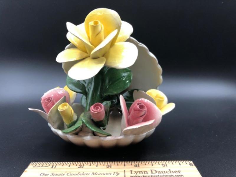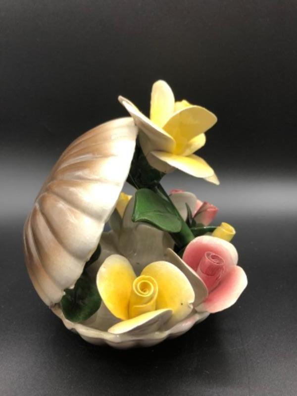 Capodimonte porcelain flowers in ceramic clam shell Italian pottery