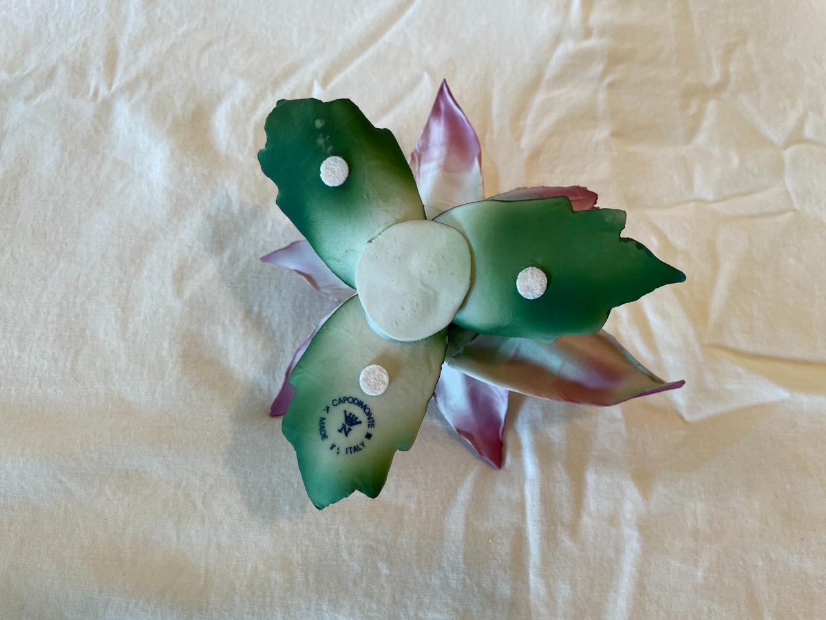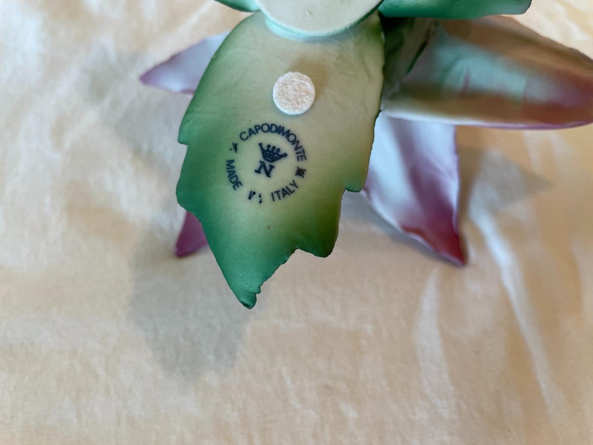 Capodimonte porcelain lily flower figurine featuring detailed petals in soft pink and green hues. The underside is stamped with 'Capodimonte Made in Italy' and the distinctive crown and 'N' mark. In good condition with no visible chips or cracks.