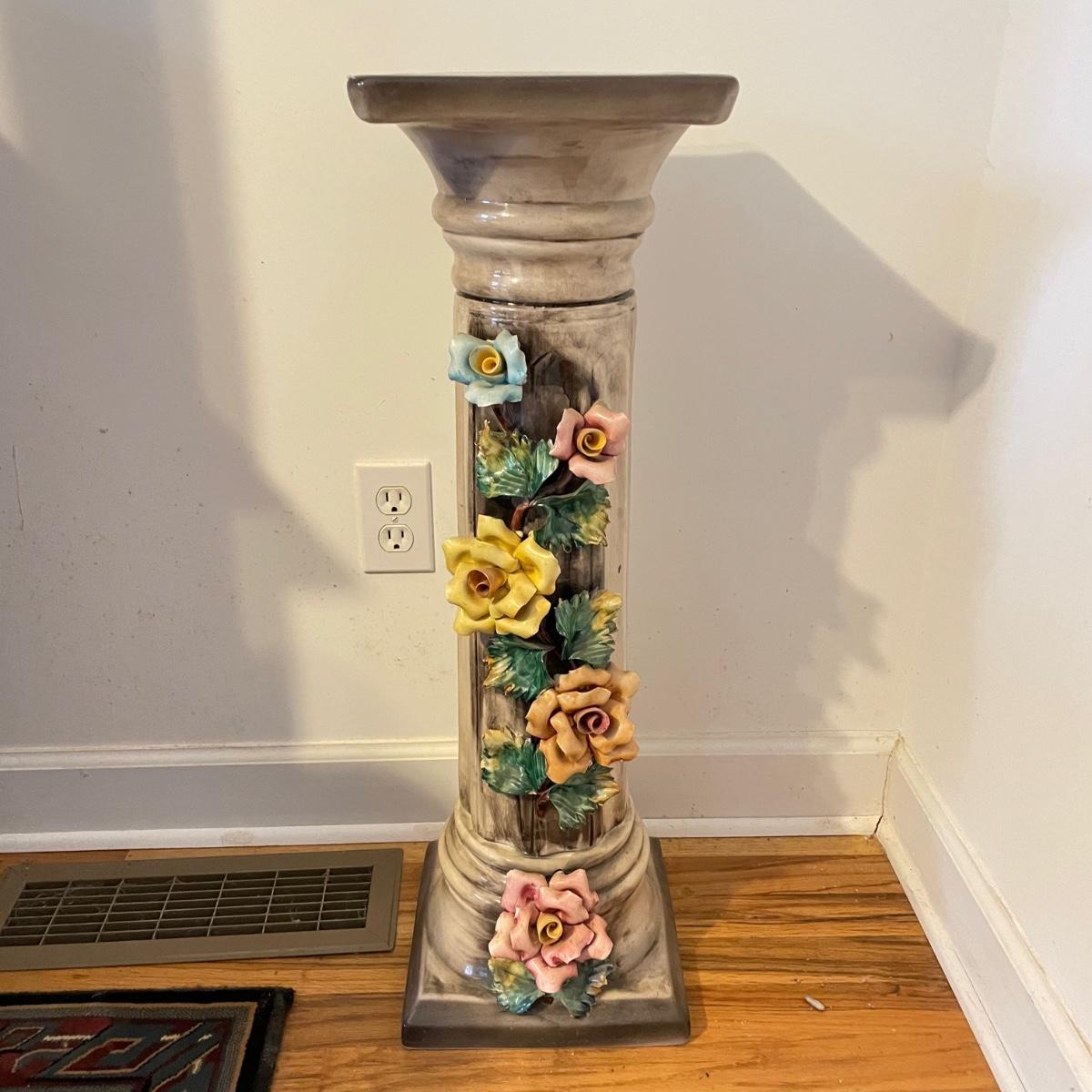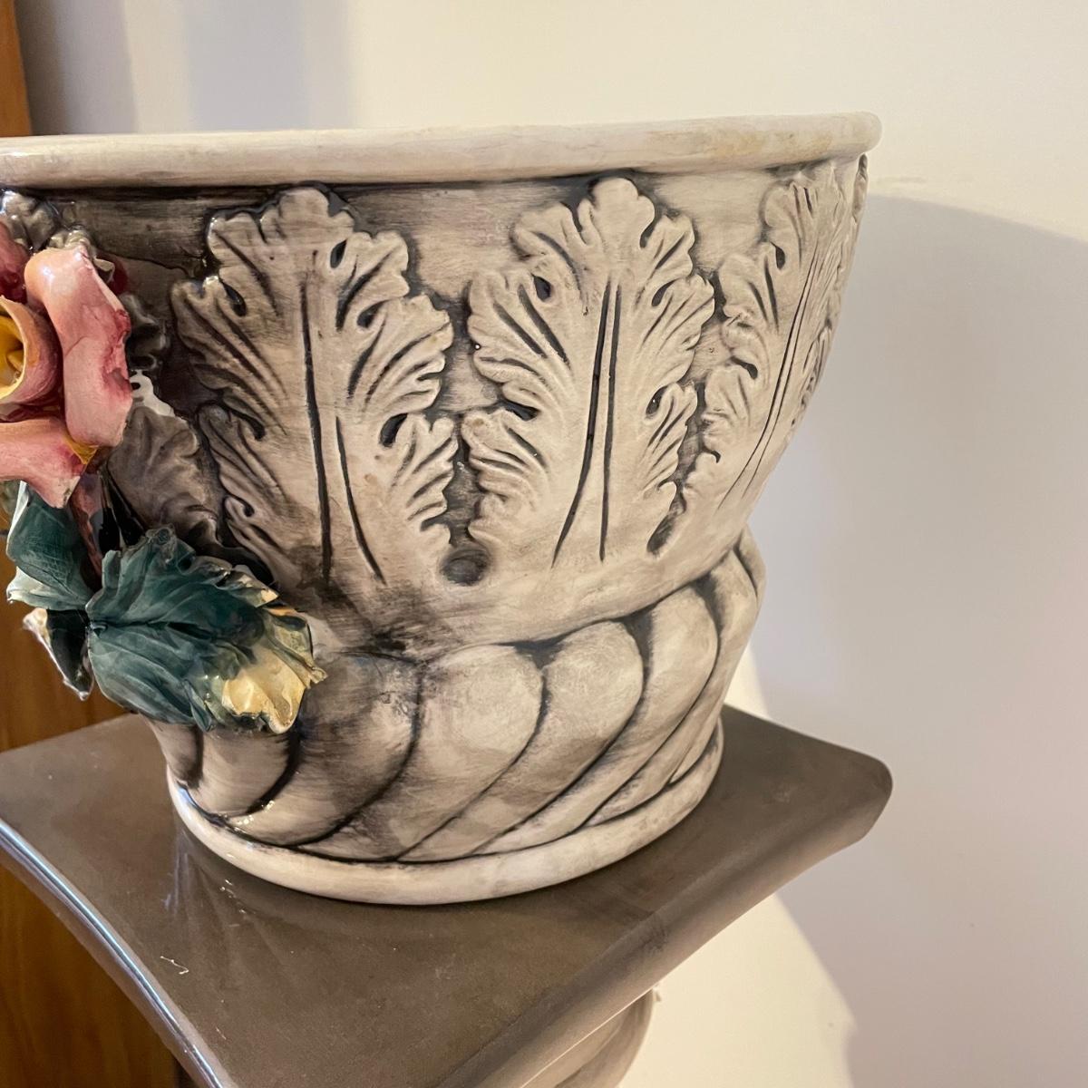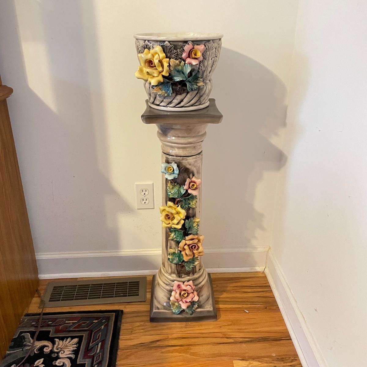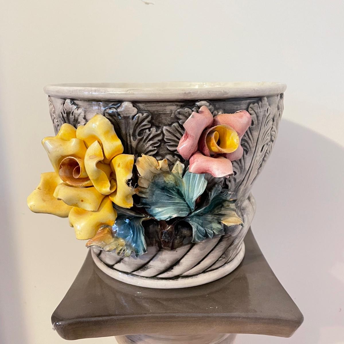 Capodimonte porcelain pedestal plant stand and planter. These stunning pieces have aged well, and appear in great shape. The pedestal is lightweight, it seems to be hollow inside, it measures 9”sq x 30”. The complementing planter is 10”d at its widest and 8” tall. The stand has a very tiny chip on the green leaf and the planter has a tiny chip on the yellow flower. (See last two pictures.) Shipping available. Please call UPS with dimensions at 828-252-6930 for a shipping quote prior to bidding.