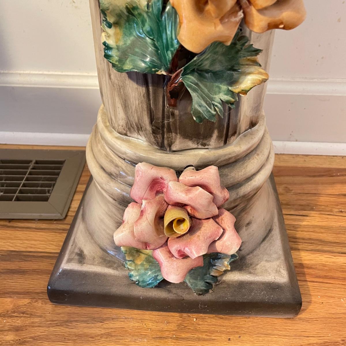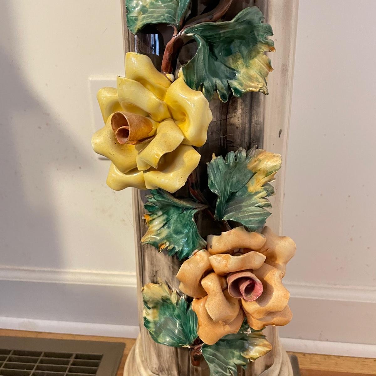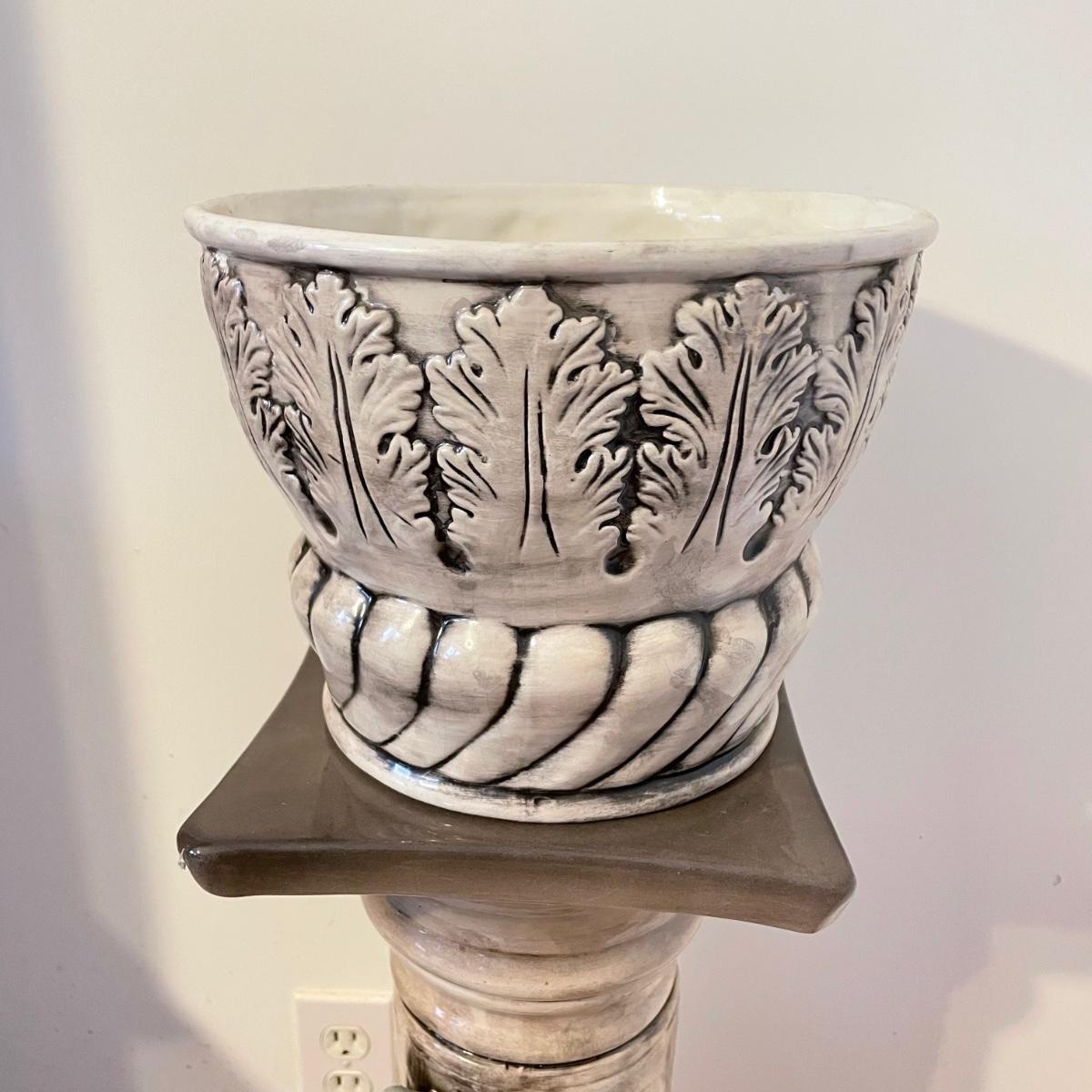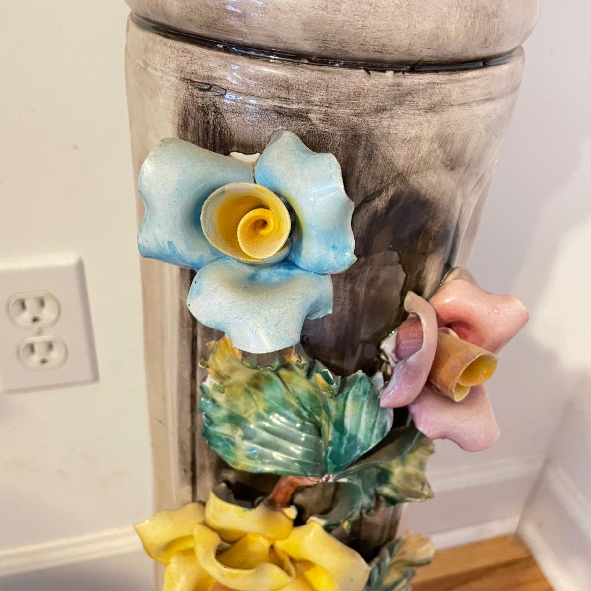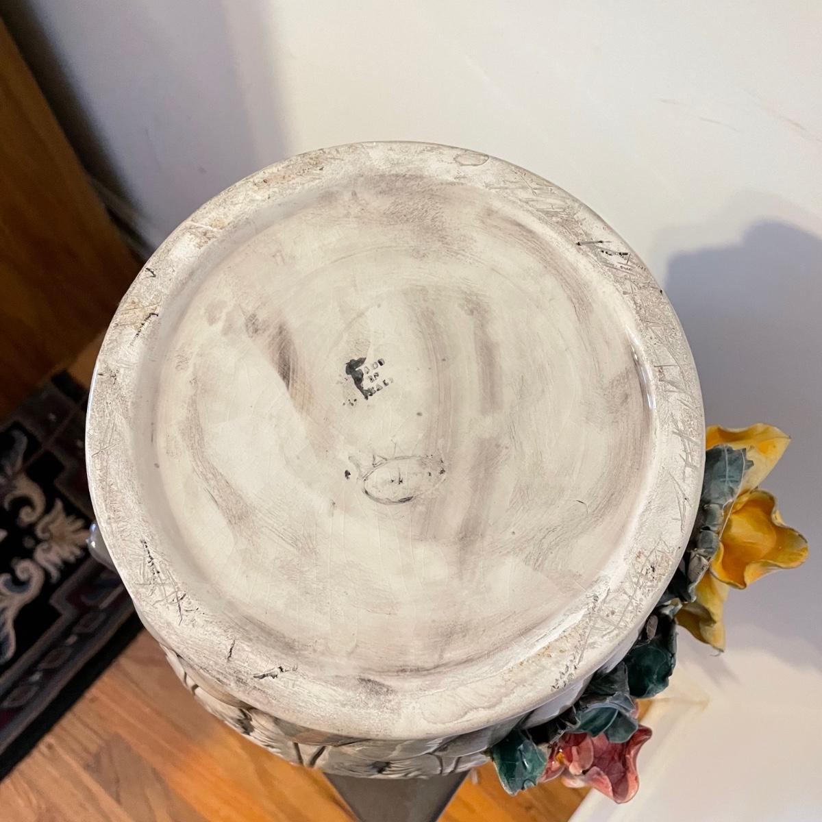 Capodimonte porcelain pedestal plant stand and planter. These stunning pieces have aged well, and appear in great shape. The pedestal is lightweight, it seems to be hollow inside, it measures 9”sq x 30”. The complementing planter is 10”d at its widest and 8” tall. The stand has a very tiny chip on the green leaf and the planter has a tiny chip on the yellow flower. (See last two pictures.) Shipping available. Please call UPS with dimensions at 828-252-6930 for a shipping quote prior to bidding.