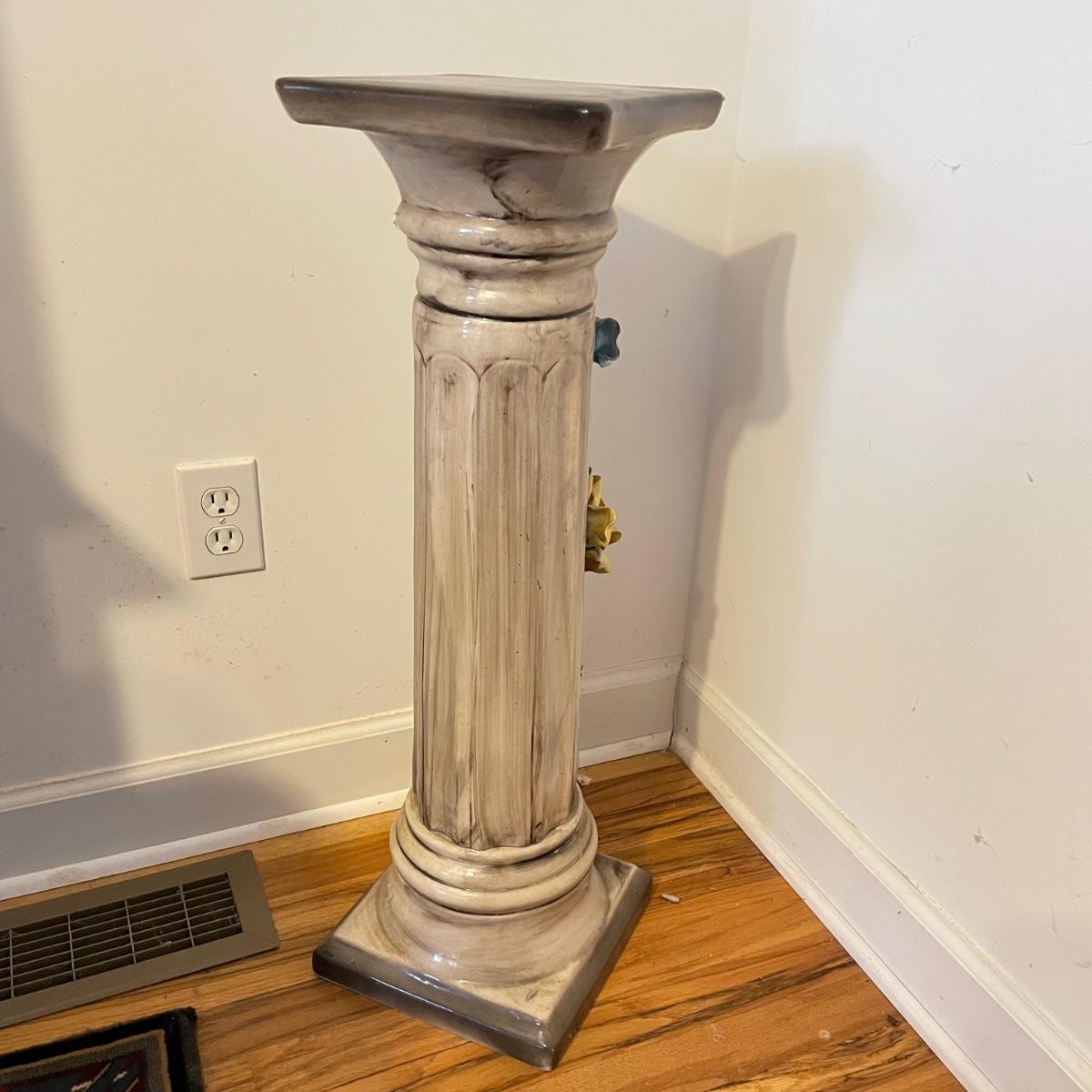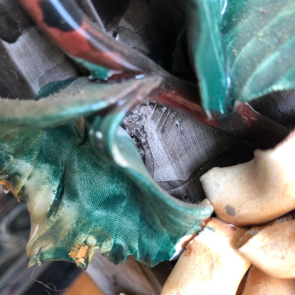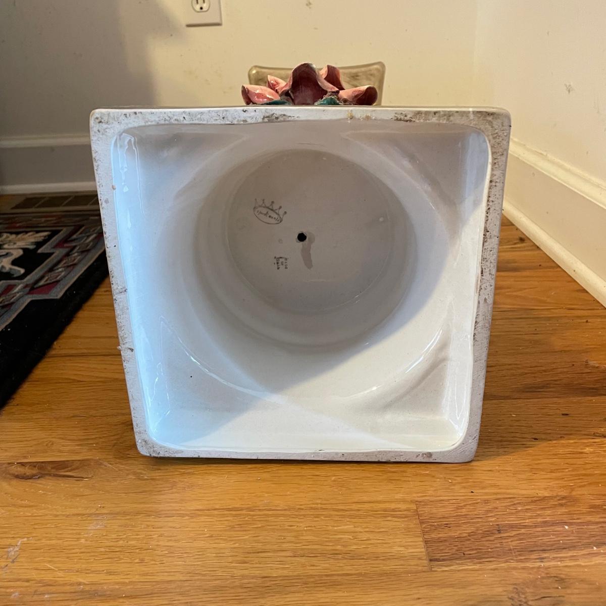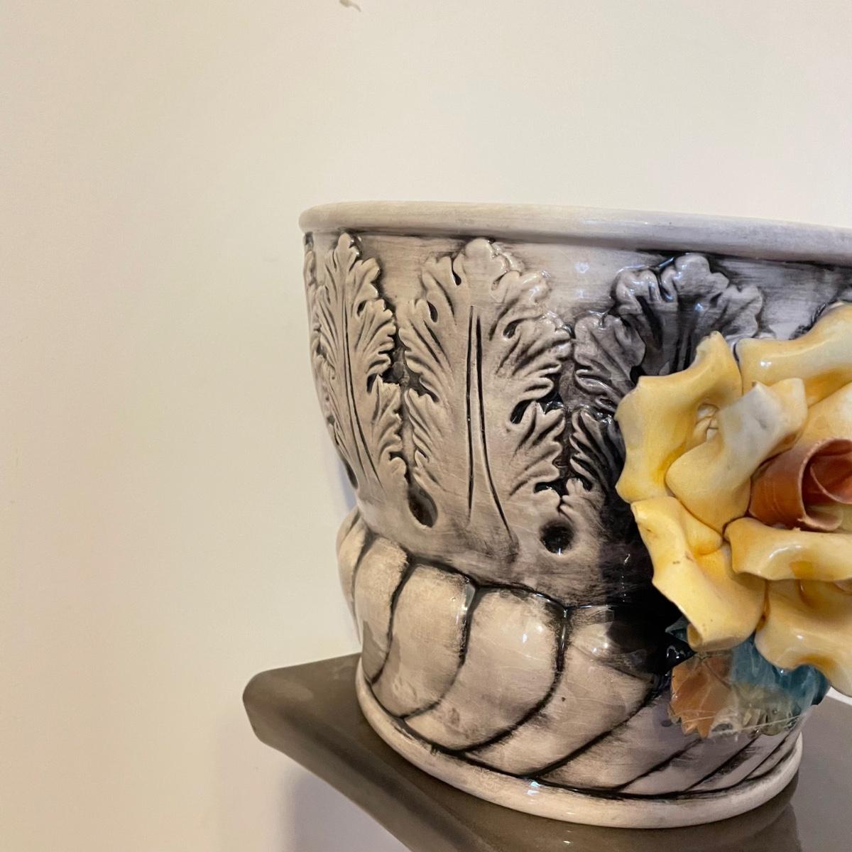 Capodimonte porcelain pedestal plant stand and planter. These stunning pieces have aged well, and appear in great shape. The pedestal is lightweight, it seems to be hollow inside, it measures 9”sq x 30”. The complementing planter is 10”d at its widest and 8” tall. The stand has a very tiny chip on the green leaf and the planter has a tiny chip on the yellow flower. (See last two pictures.) Shipping available. Please call UPS with dimensions at 828-252-6930 for a shipping quote prior to bidding.