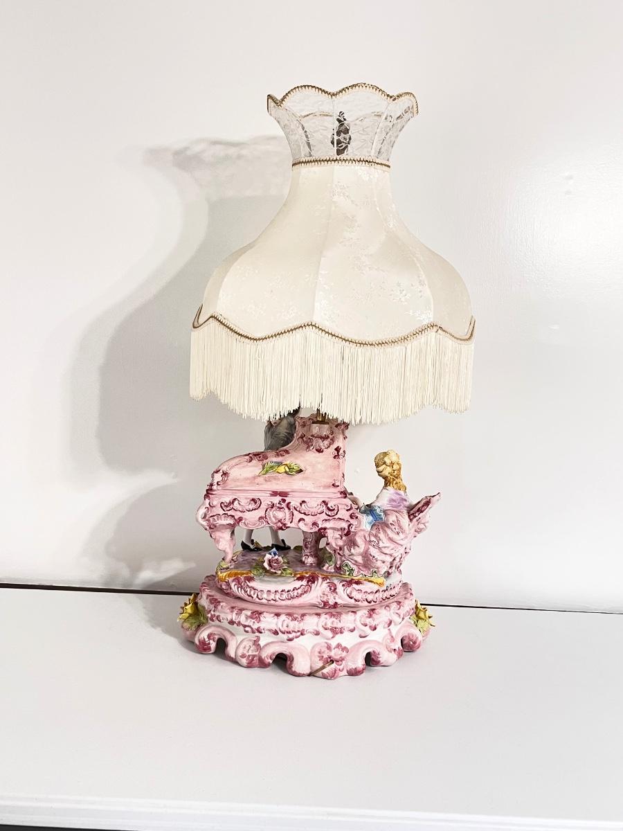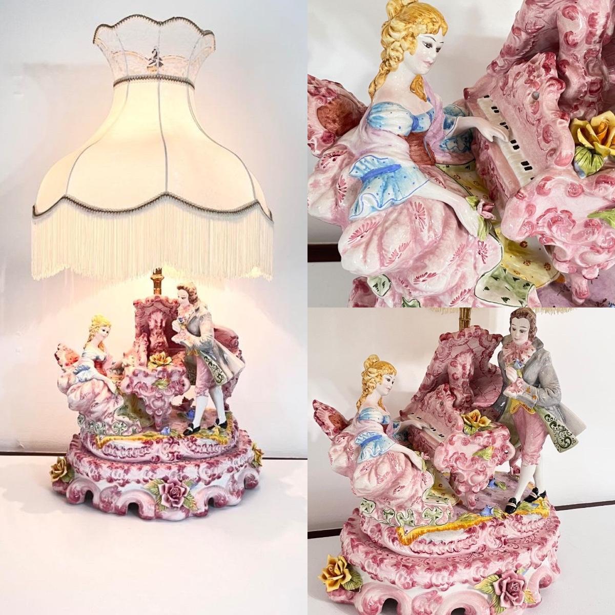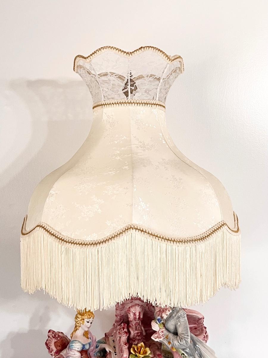 CAPODIMONTE ~ Vtg. Italian 39” Porcelain Table Lamp ~ With 20” Lace & Fringe Shade
