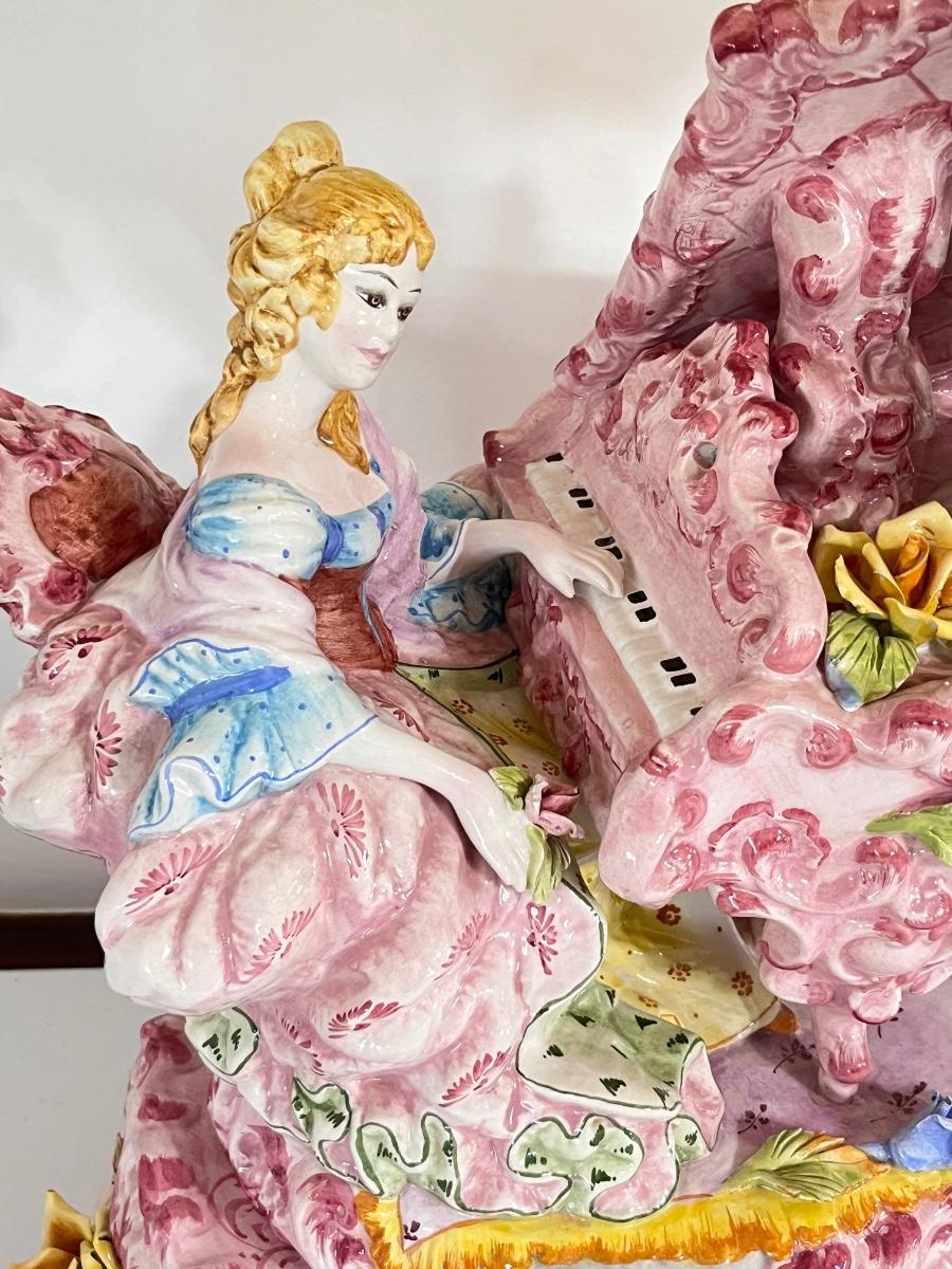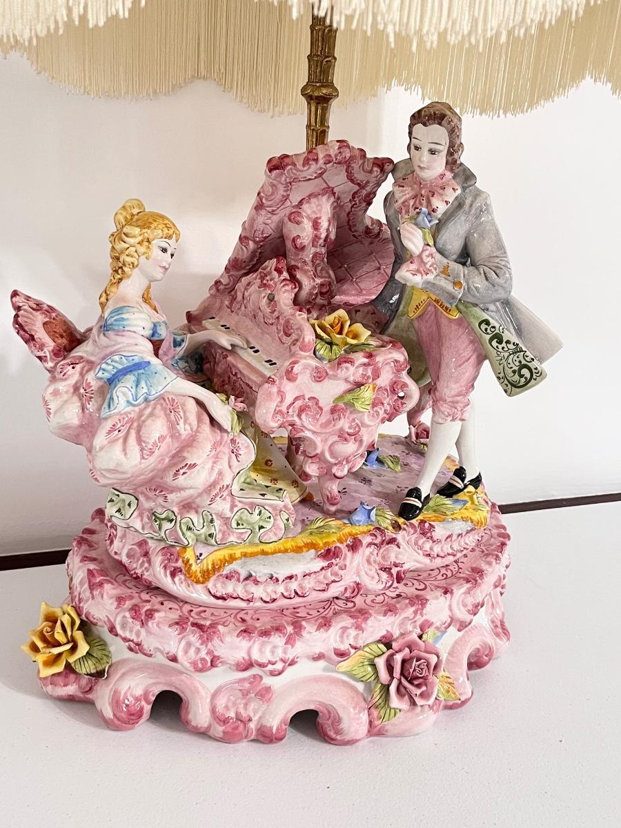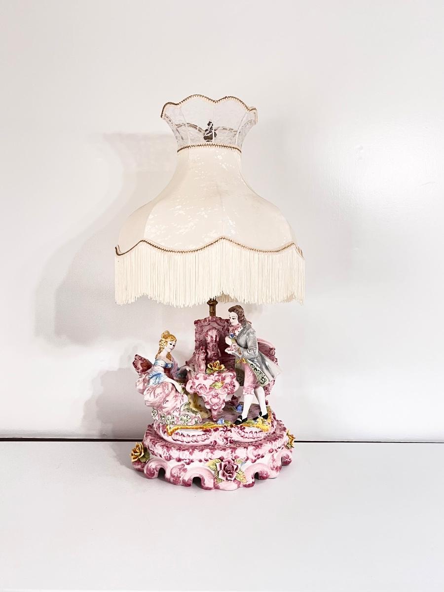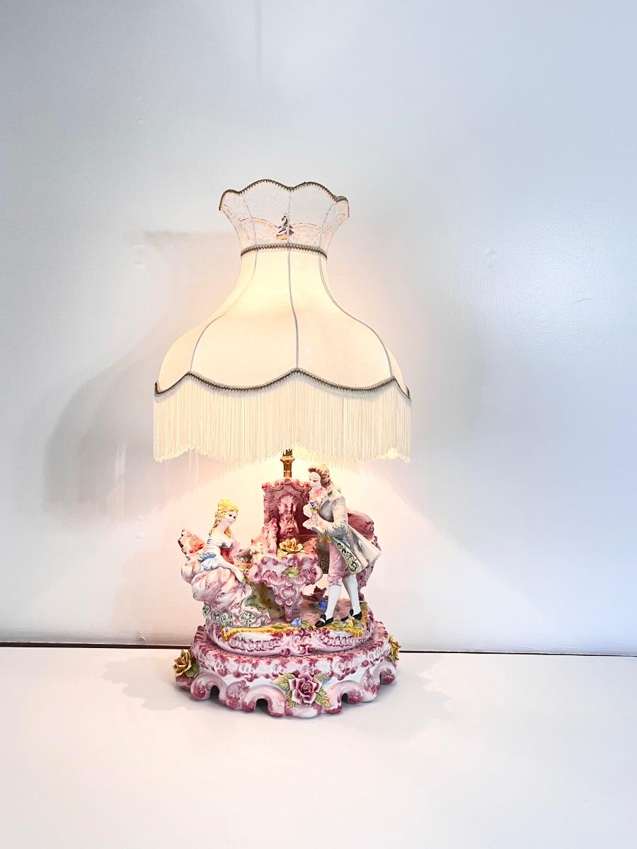 CAPODIMONTE ~ Vtg. Italian 39” Porcelain Table Lamp ~ With 20” Lace & Fringe Shade