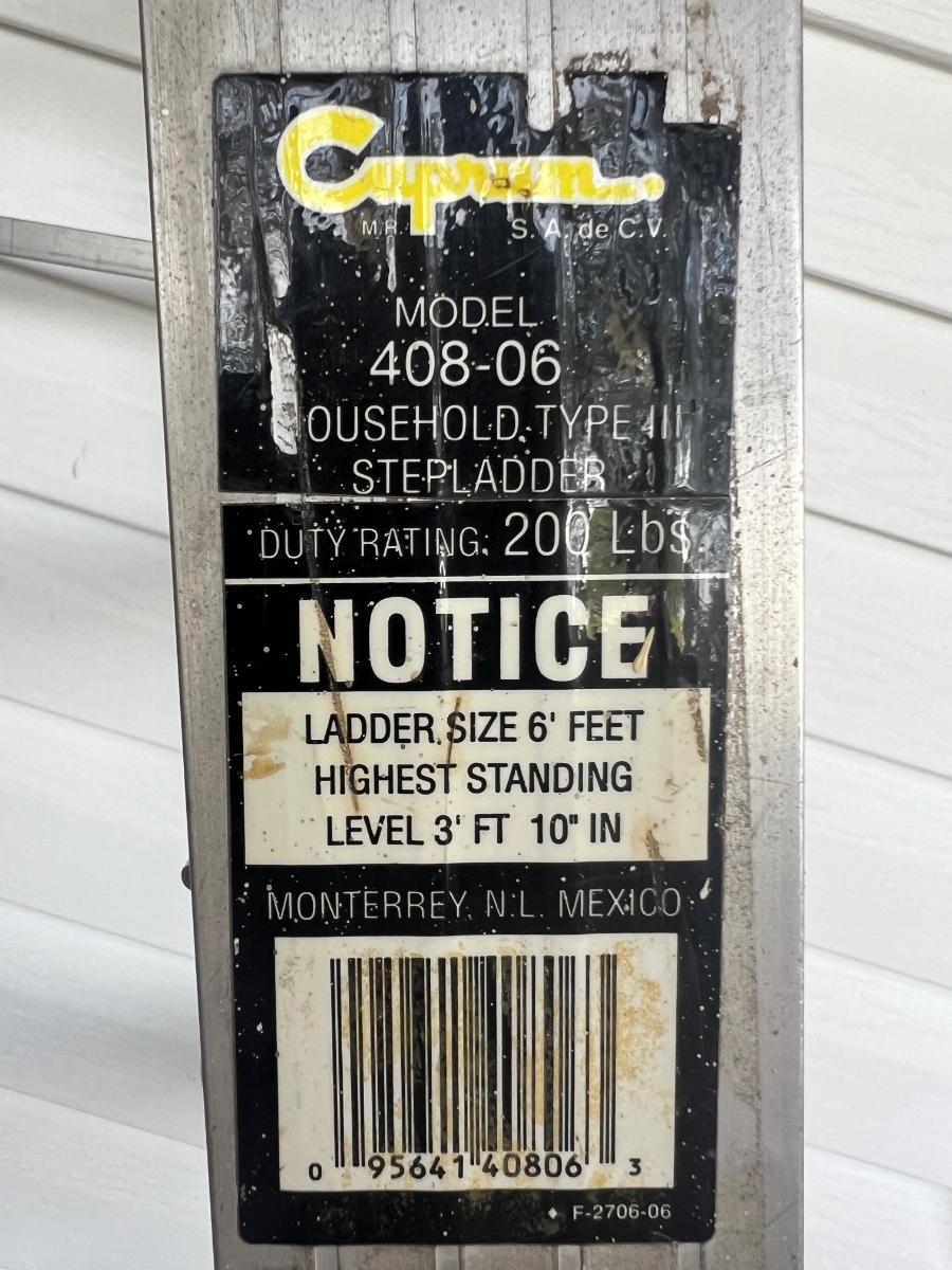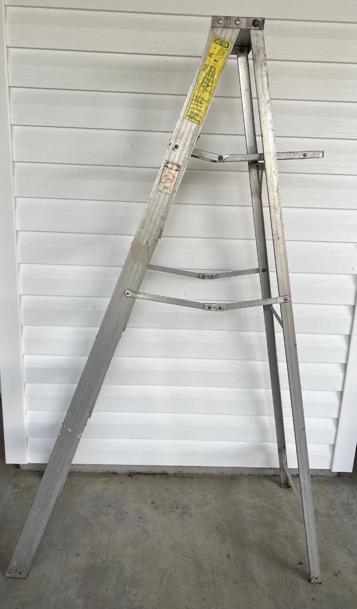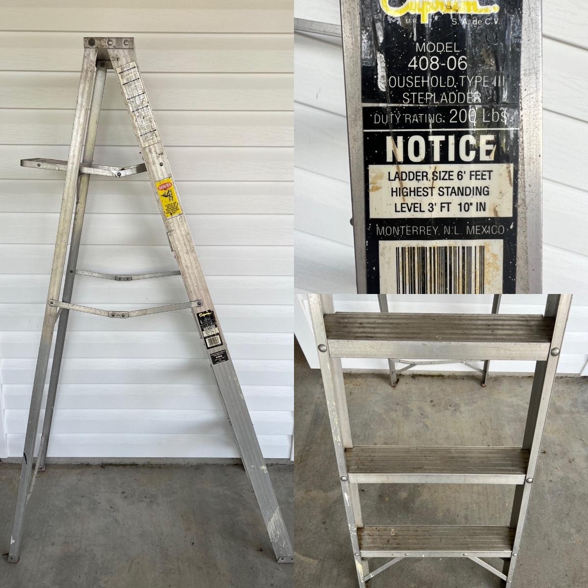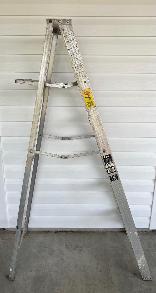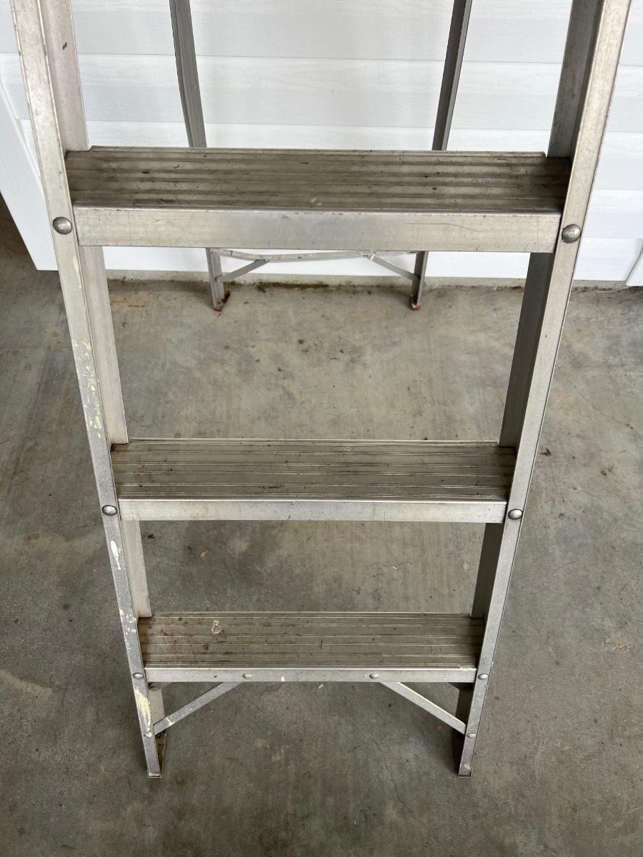 6’ Aluminum ladder. Used but still in good shape. Notice in picture 1 piece has a little bend in it. See pictures for condition.