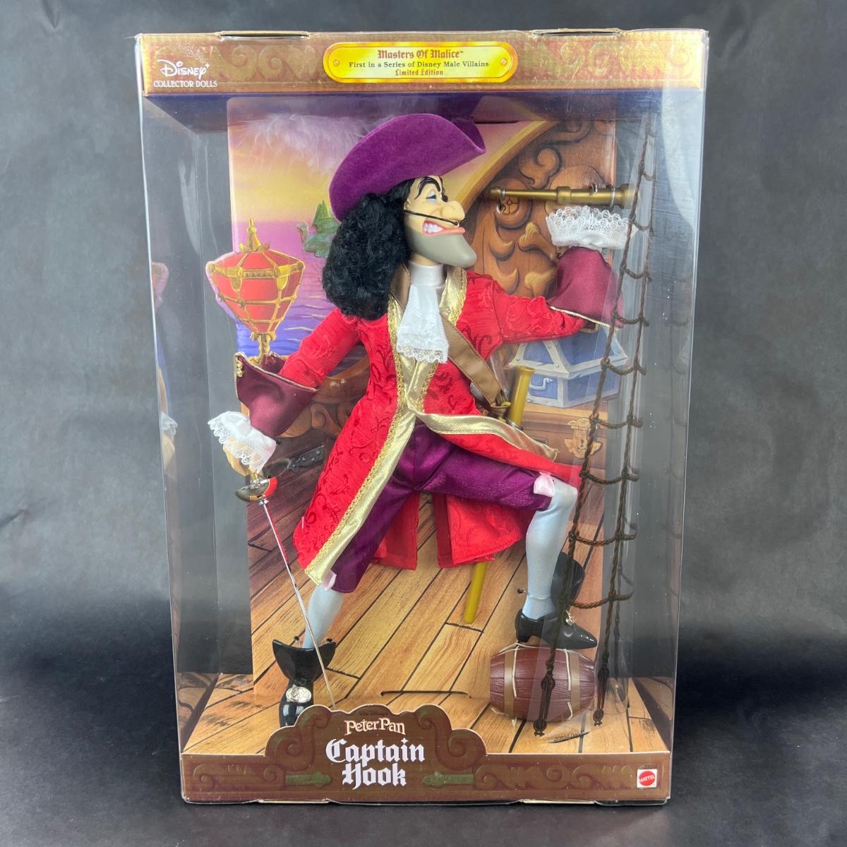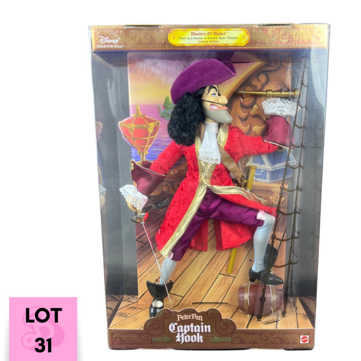 This Captain Hook doll was part of the Masters of Malice Collection, produced in 1999 by Mattel. Box is in exceptional condition. Doll has not been out of its box. **|** Please see photos for details and condition. ::: Shipping is available on this lot. If you require shipping you must let us know at the close of the auction. We will coordinate with you after the item has been won. Shipping fees will include insurance up to or exceeding the value of all items being mailed. If you have any questions regarding this lot please contact the auctioneer either via this website, by direct email or by phone. PICK UP TIMES and other important information can be found in the TERMS and DESCRIPTION of the auction. Please take a look for pertinent information. Thanks!
