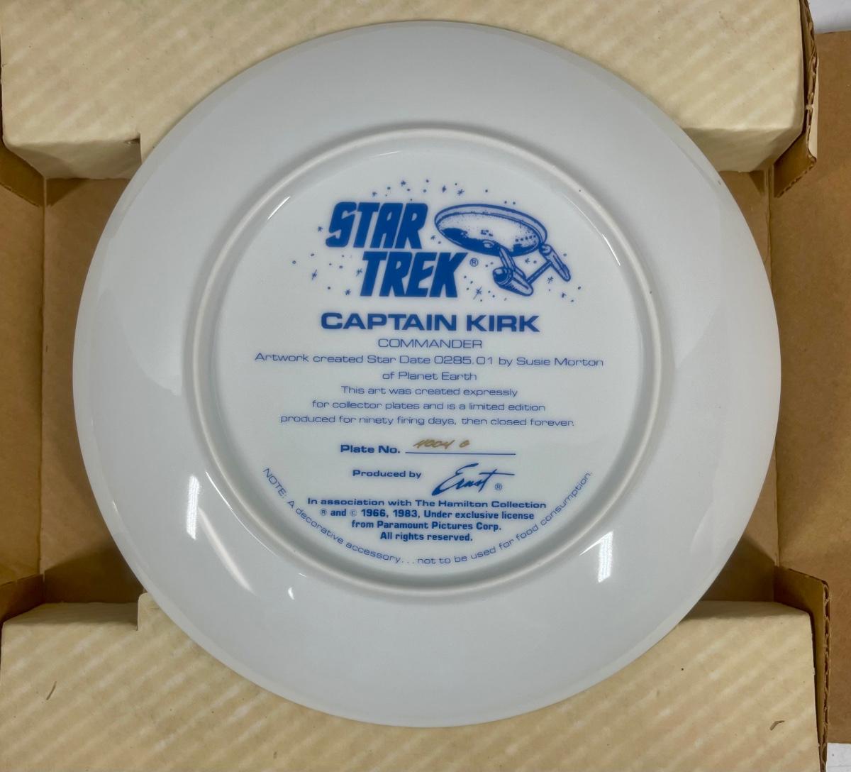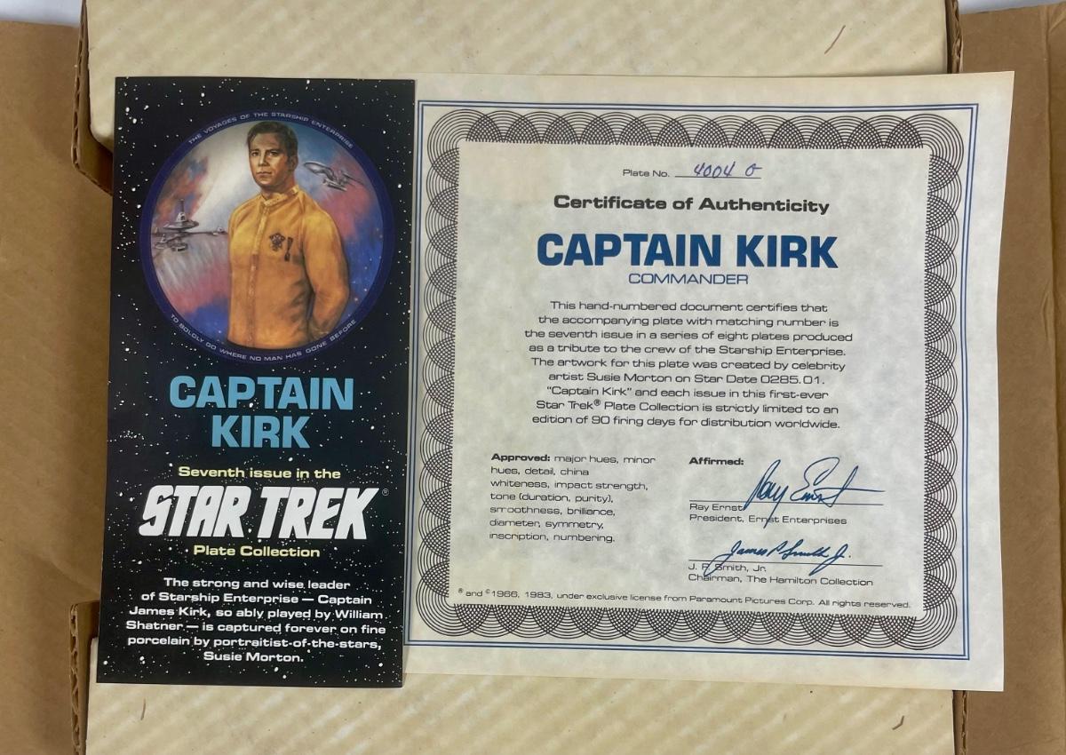 8 1/2” Star Trek Collector plate from 1984. Image of Captain Kirk in his Dress Uniform. With certificate of authenticity, In original shipping box. Part of a set of 9, see other auctions for more.