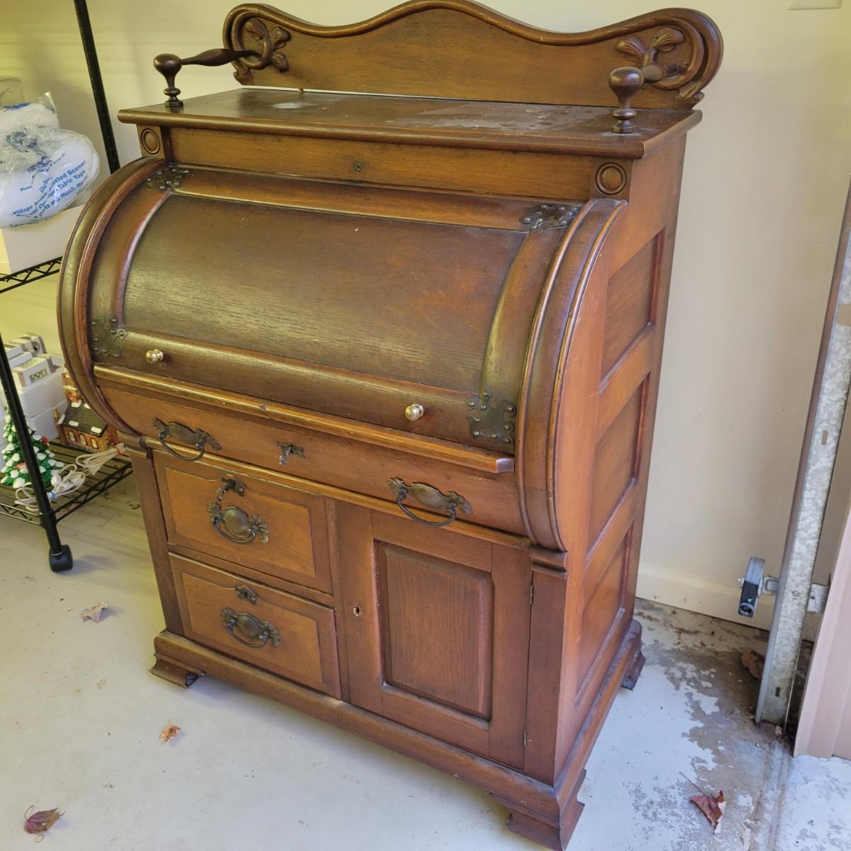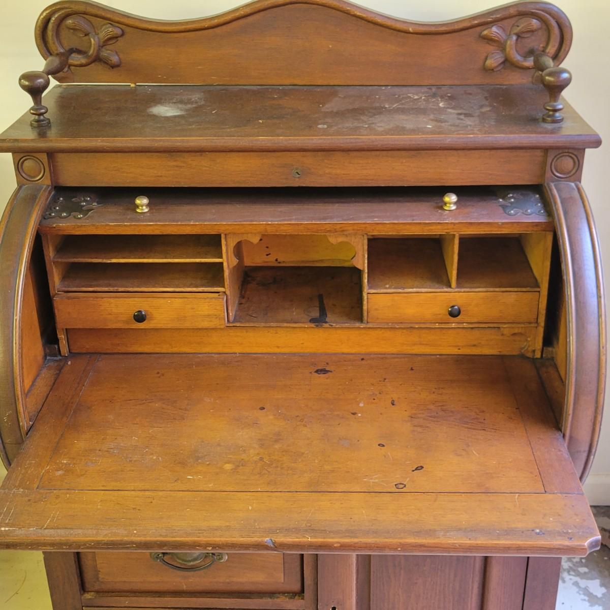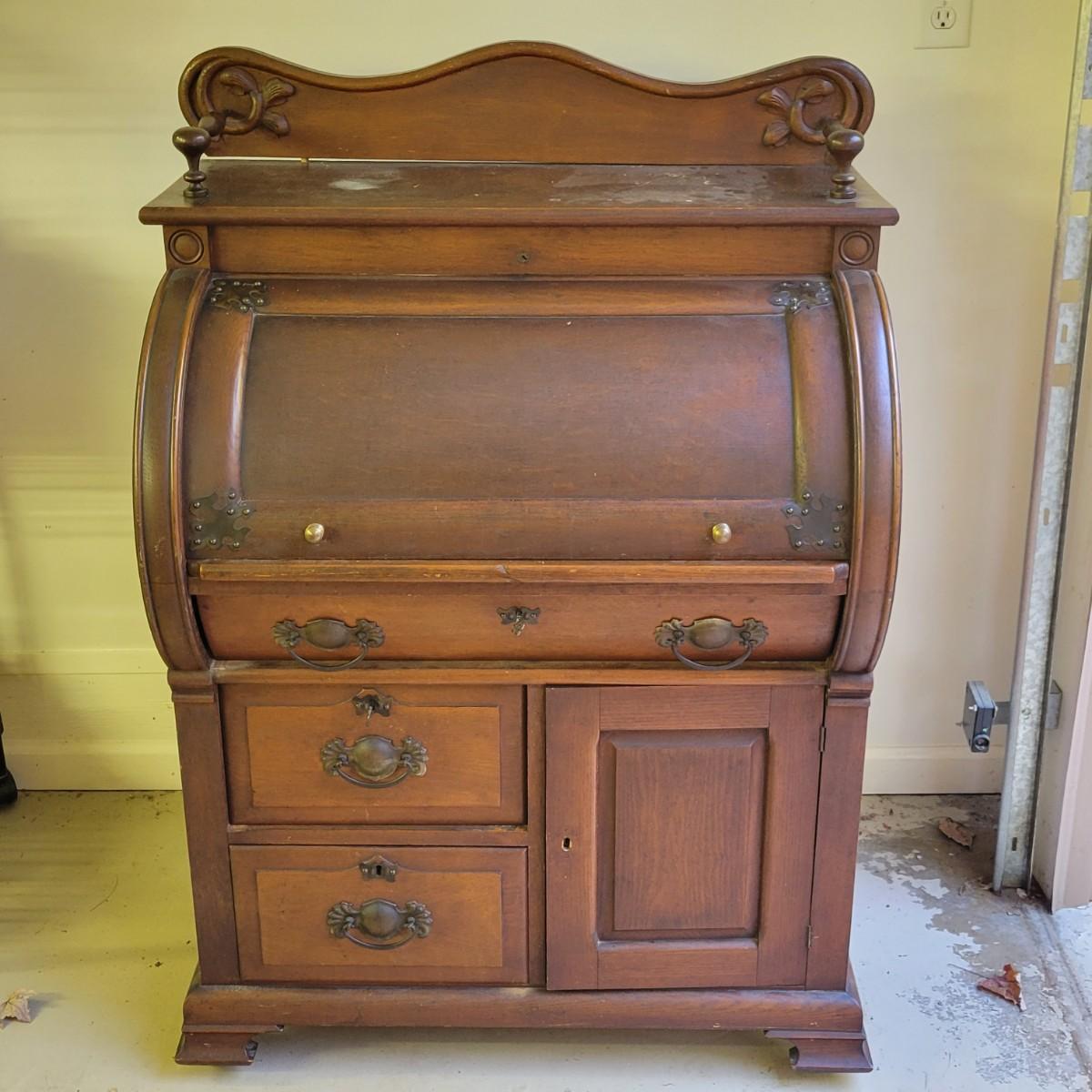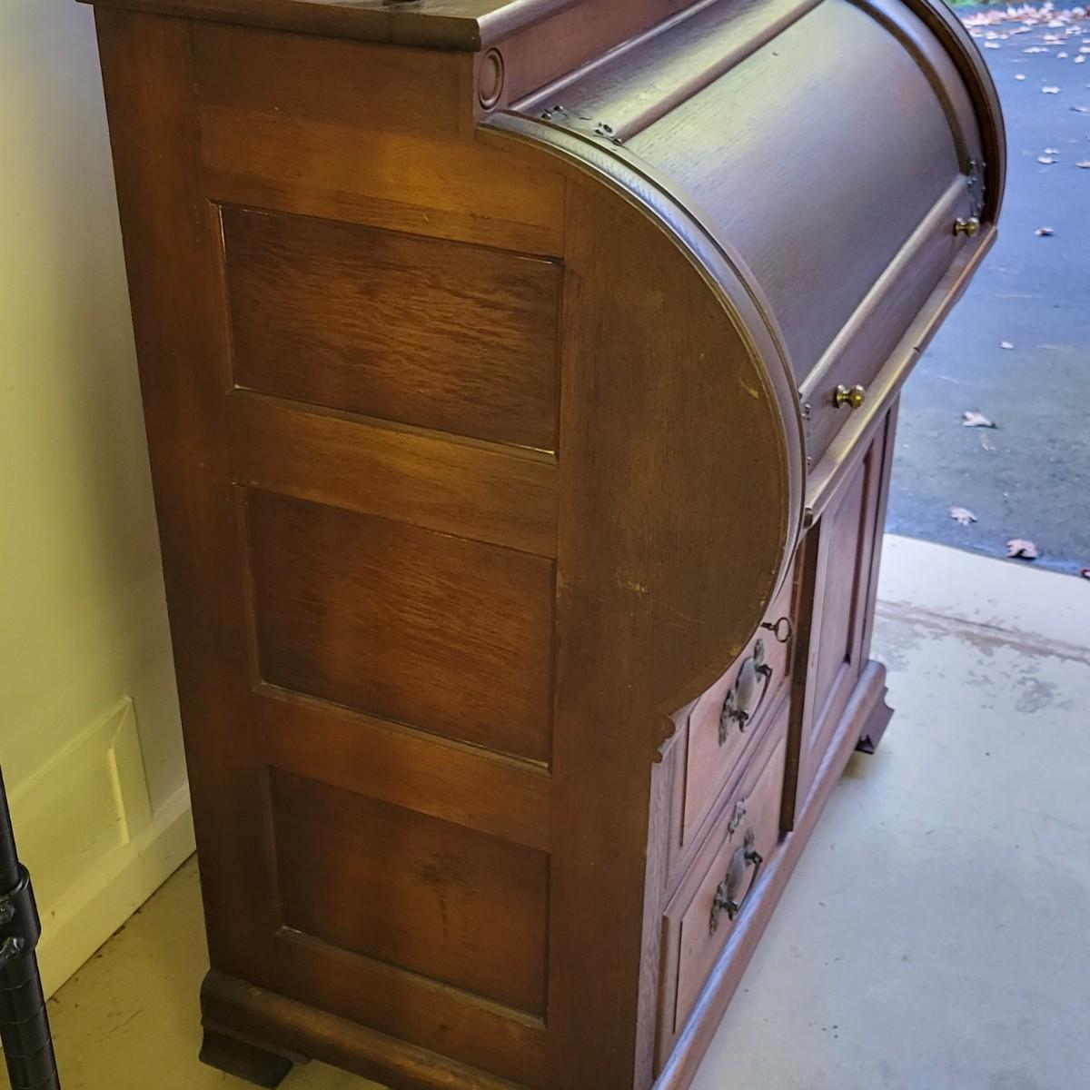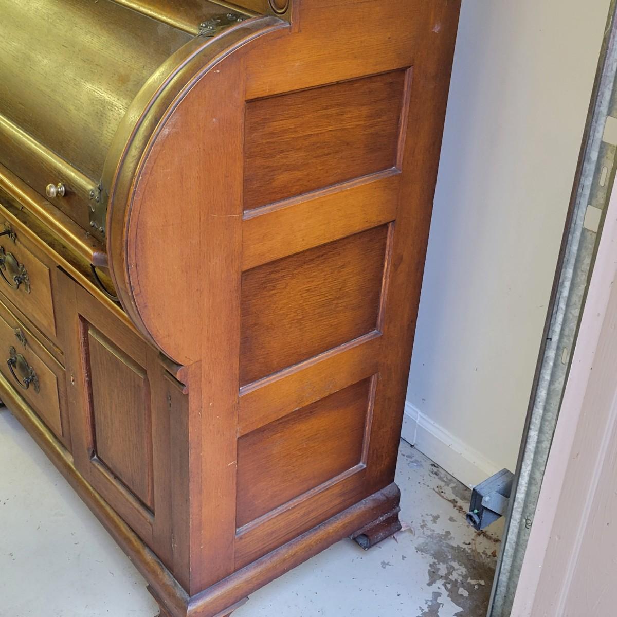 A captains roll top desk that has a solid, curved roll top with a writing desk that pulls out. It appears to be made of oak with a rich medium brown finish and has brass hardware. There are two keys included, but the locking mechanisms do not appear to work. It measures approximately 32.5" x 21.5" x 49"H and has casters on its feet. Local pickup only. Winning bidder must bring assistance to help move and load this item due to its weight and/or size.