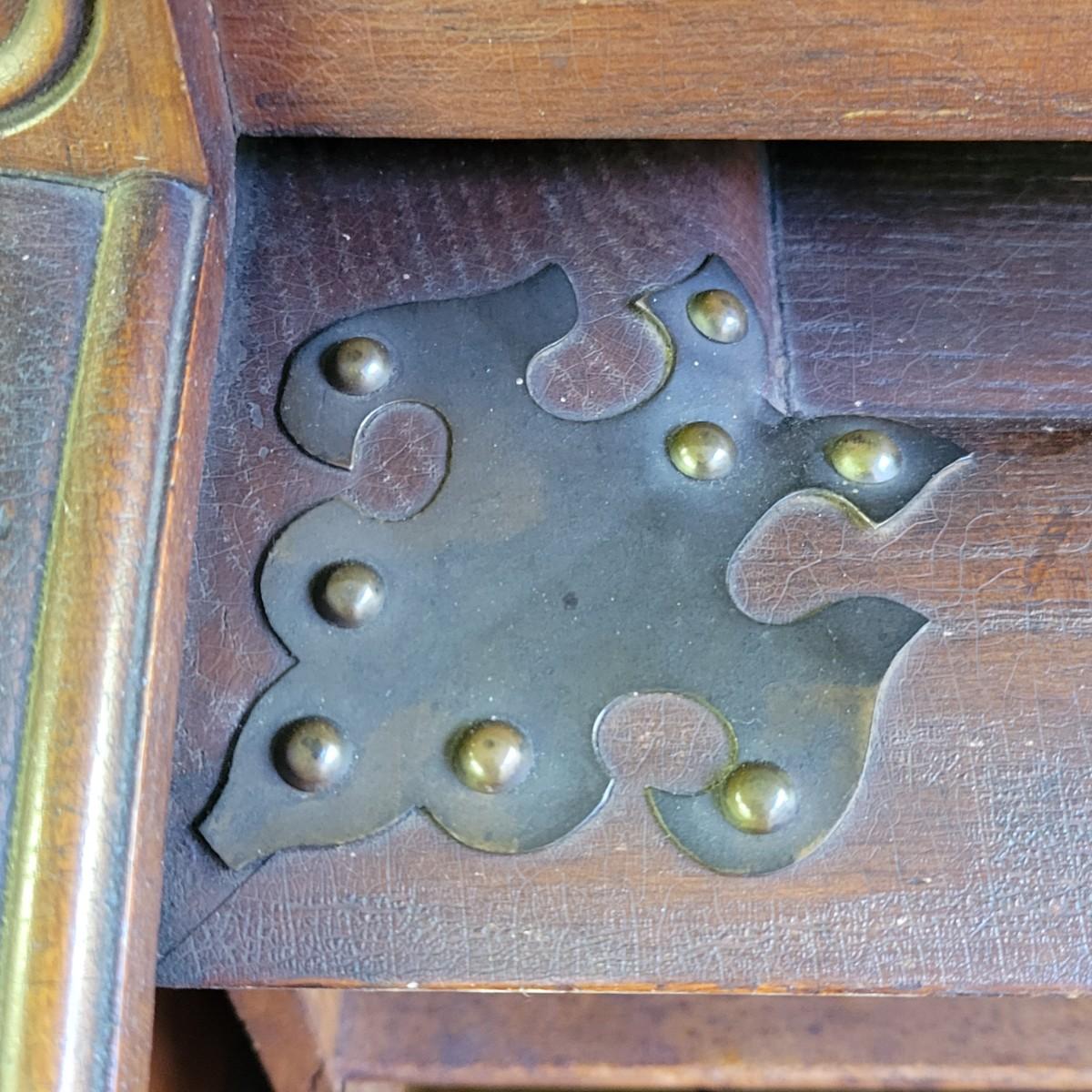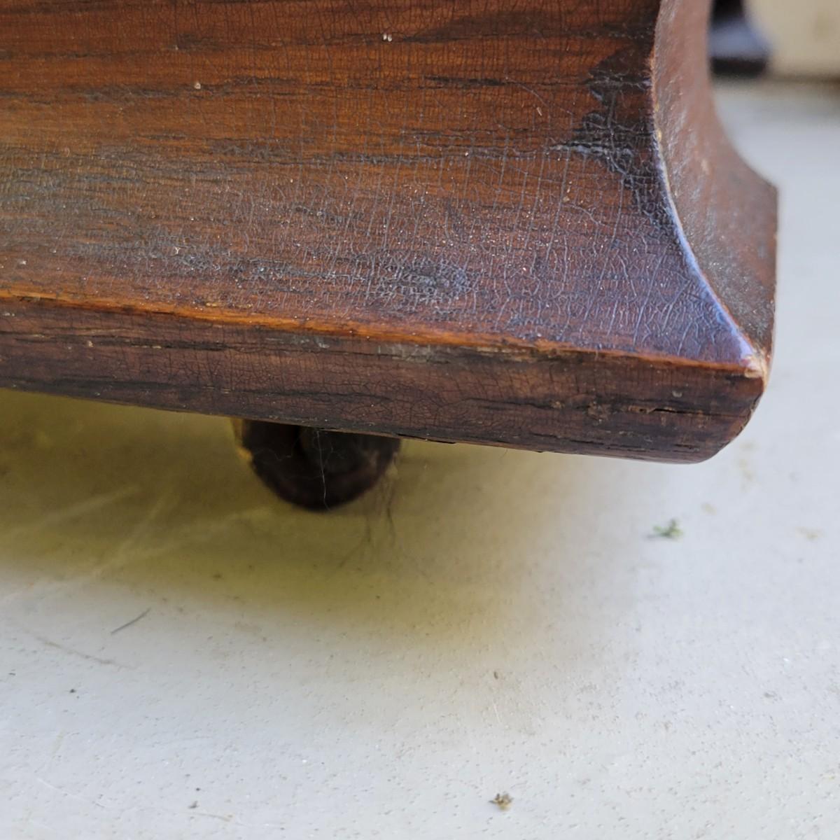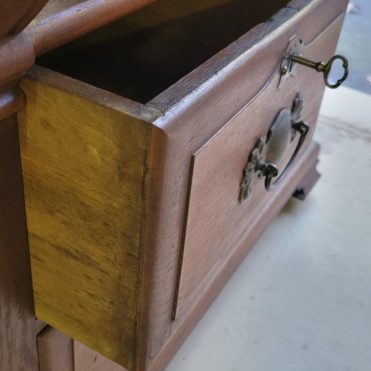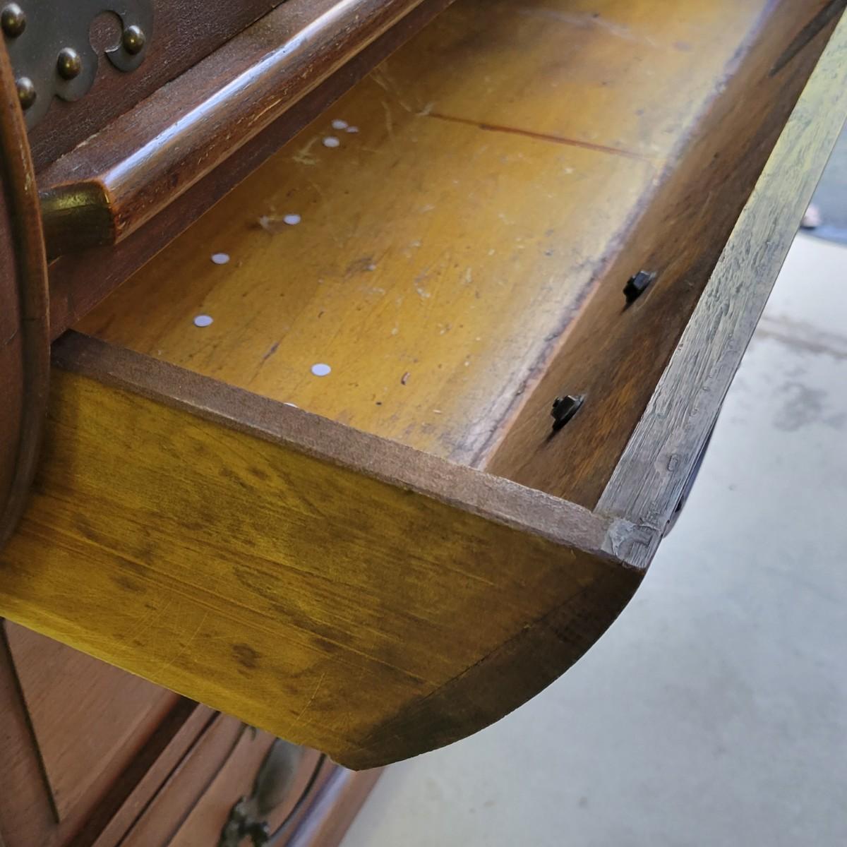 A captains roll top desk that has a solid, curved roll top with a writing desk that pulls out. It appears to be made of oak with a rich medium brown finish and has brass hardware. There are two keys included, but the locking mechanisms do not appear to work. It measures approximately 32.5" x 21.5" x 49"H and has casters on its feet. Local pickup only. Winning bidder must bring assistance to help move and load this item due to its weight and/or size.