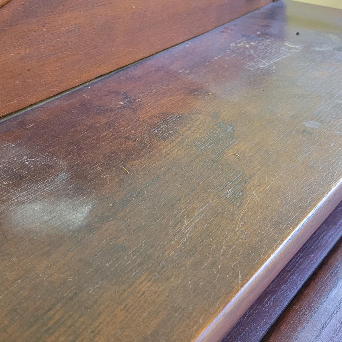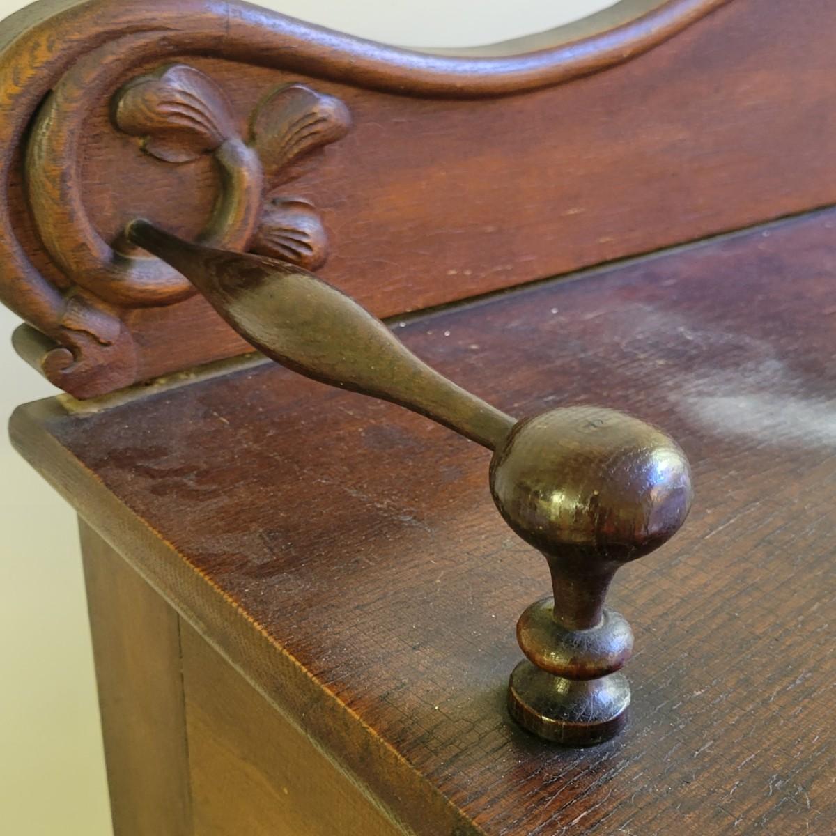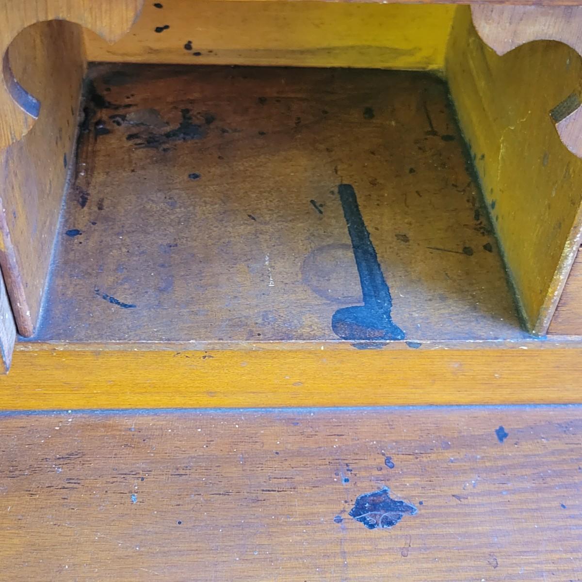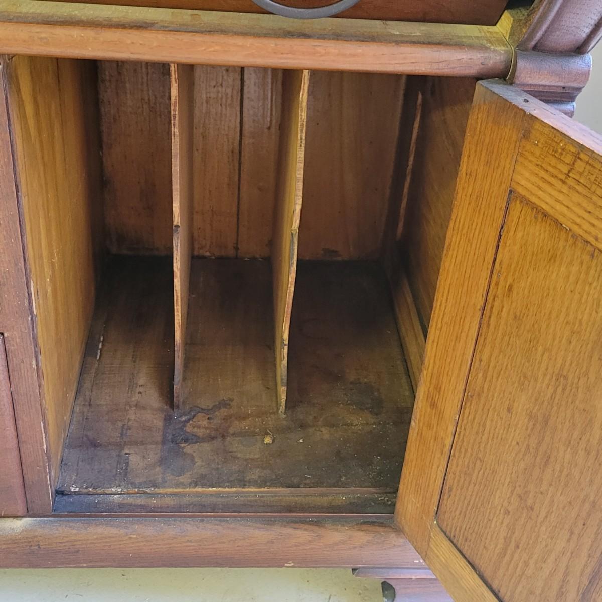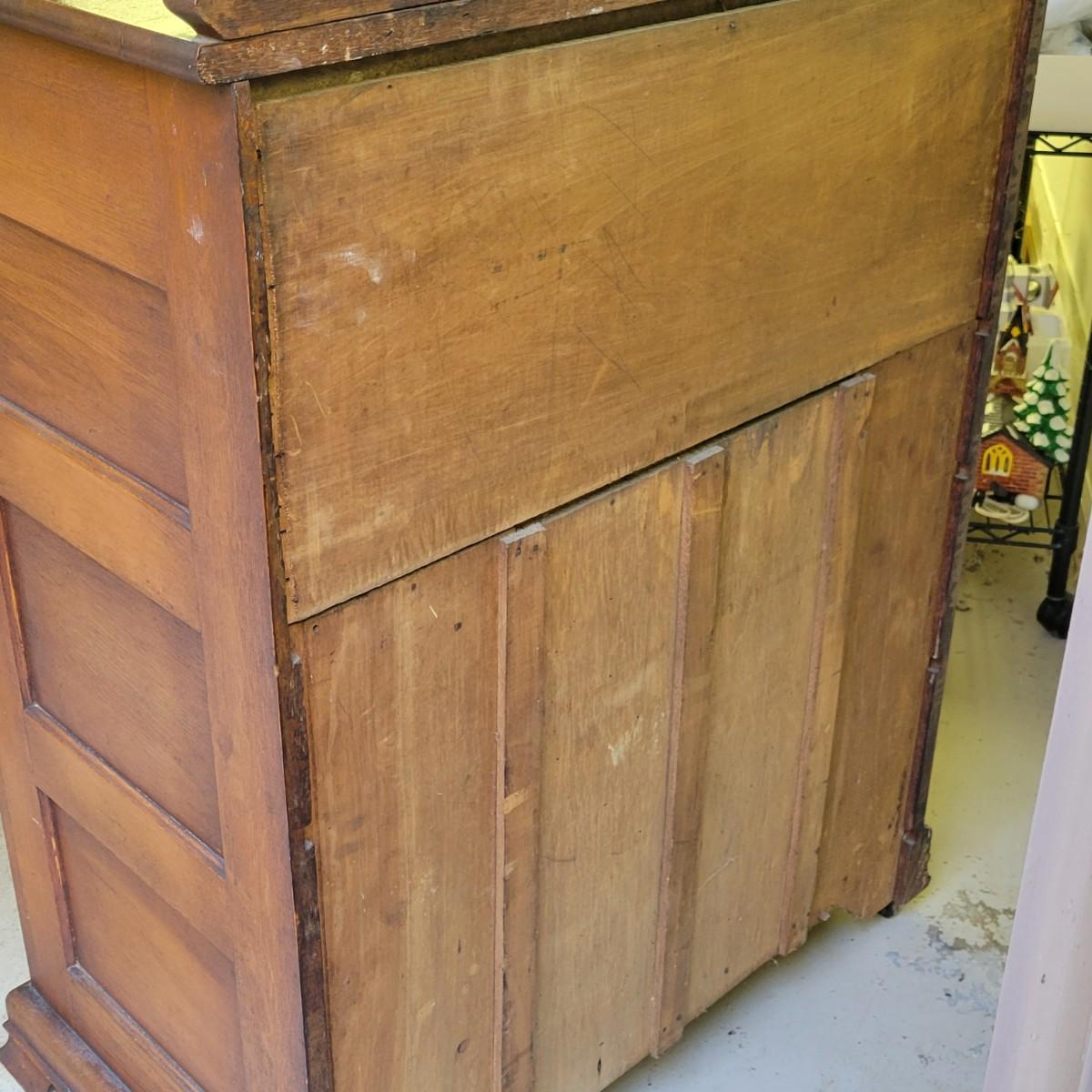 A captains roll top desk that has a solid, curved roll top with a writing desk that pulls out. It appears to be made of oak with a rich medium brown finish and has brass hardware. There are two keys included, but the locking mechanisms do not appear to work. It measures approximately 32.5" x 21.5" x 49"H and has casters on its feet. Local pickup only. Winning bidder must bring assistance to help move and load this item due to its weight and/or size.