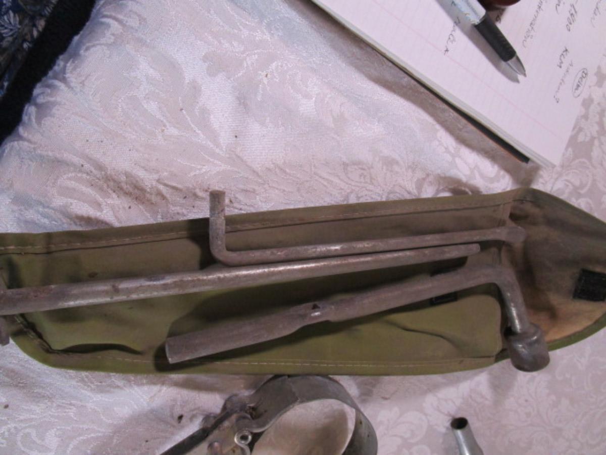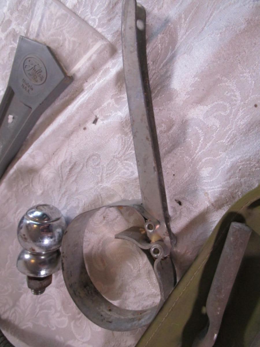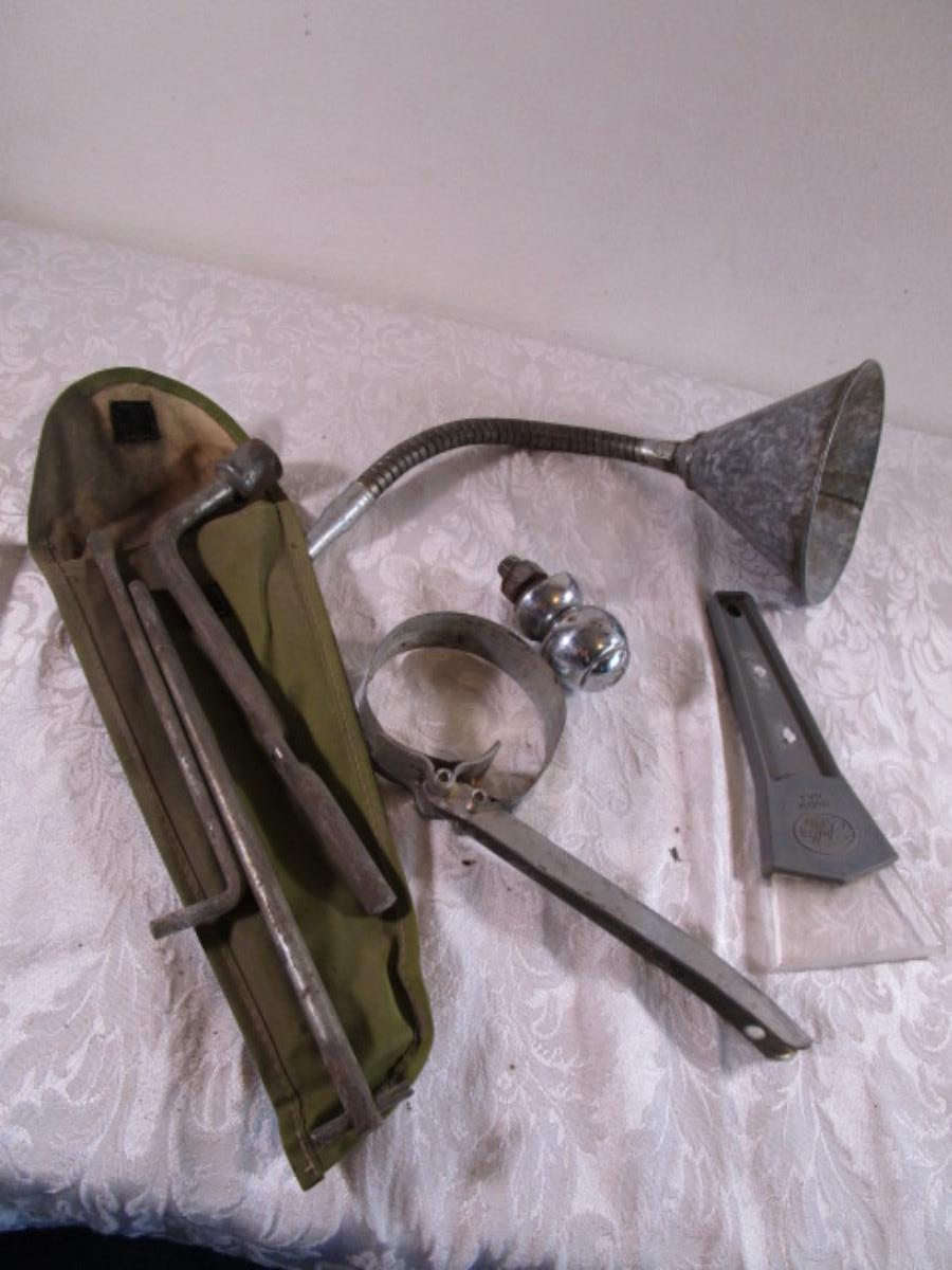 Oil filter puller, snow scraper, trailer ball, long funnel, Toyota jack handle pieces - G