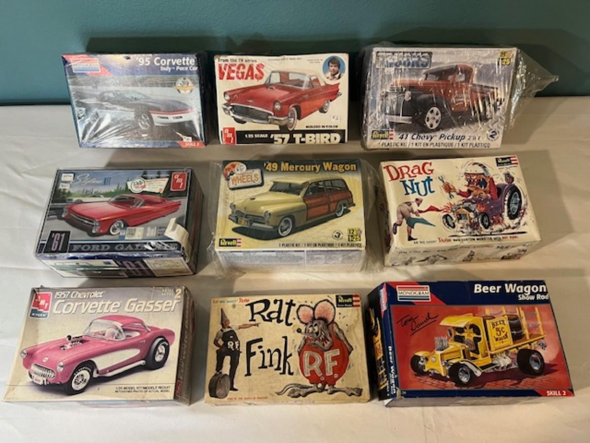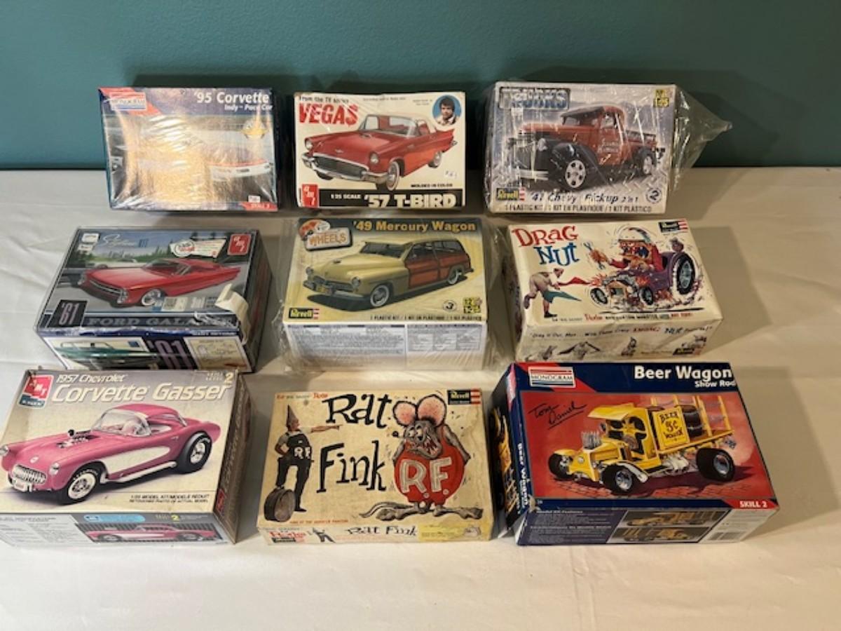 Includes Corvette, Ford Galaxie, Mercury Wagon, Beer Wagon, Rat Fink, and more. Makers include Monogram, Revell, AMT, Ertl, and more. Total of 9. Boxes have age related wear. Cursory inspection only done on these.
