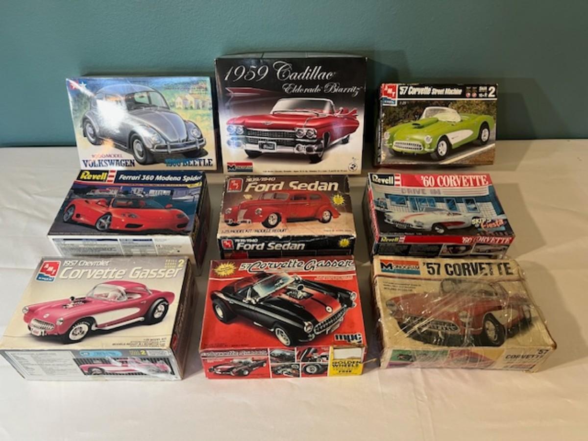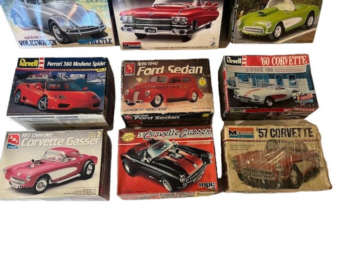 Includes Volkswagen Beetle, Ferrari (missing glass), Cadillac, Corvette, and more. Makers include Revell, AMT, MPC, Monogram, Tamiya, and more. Total of 9. Cursory inspection only done on these.