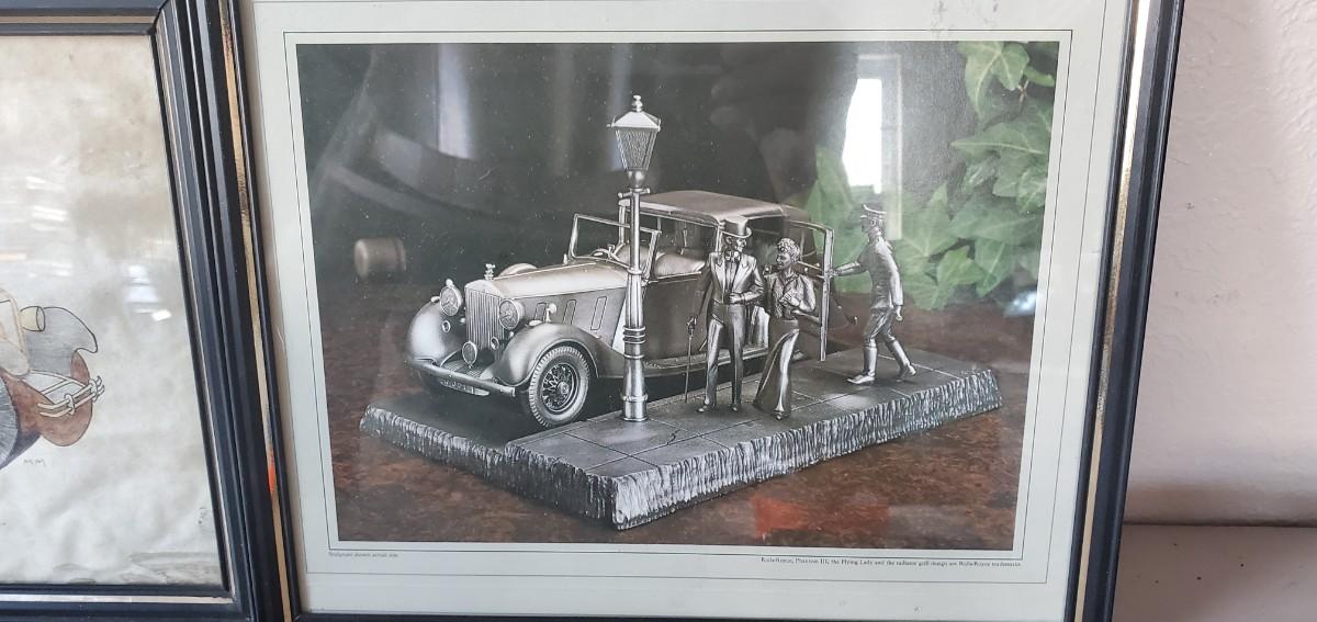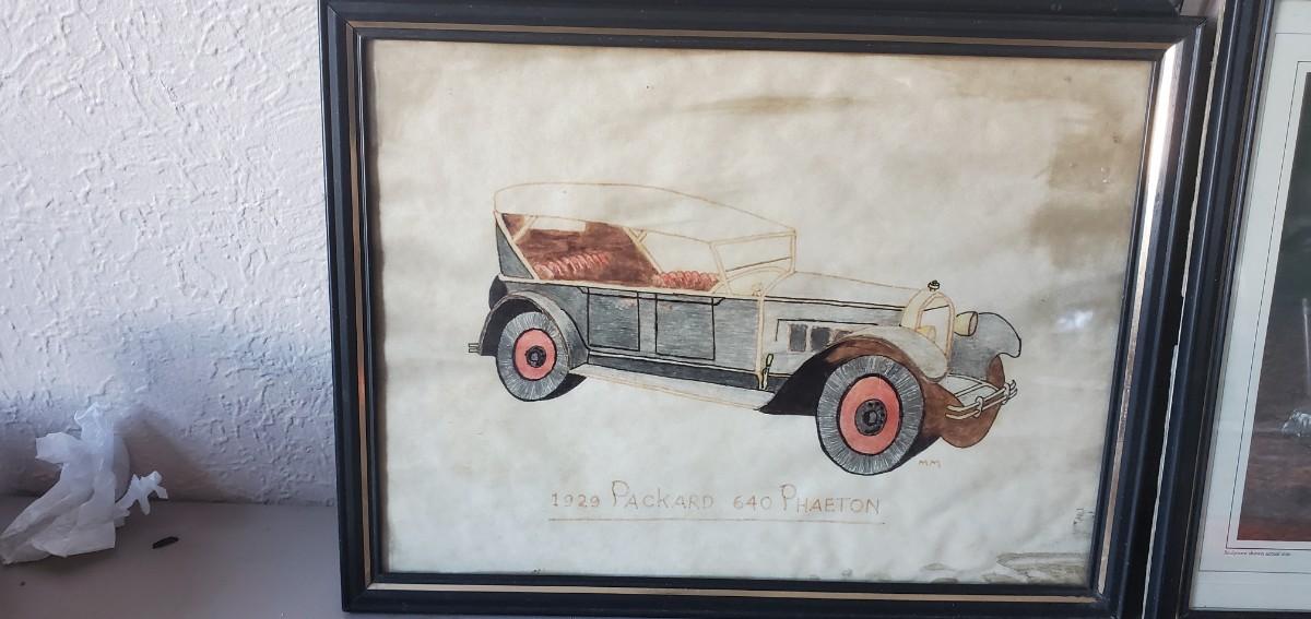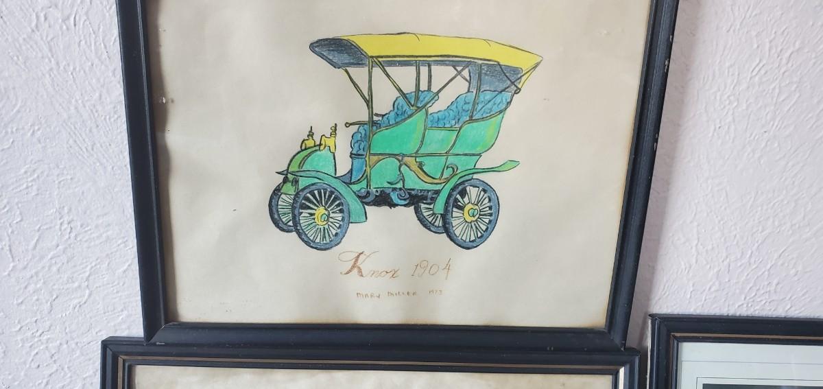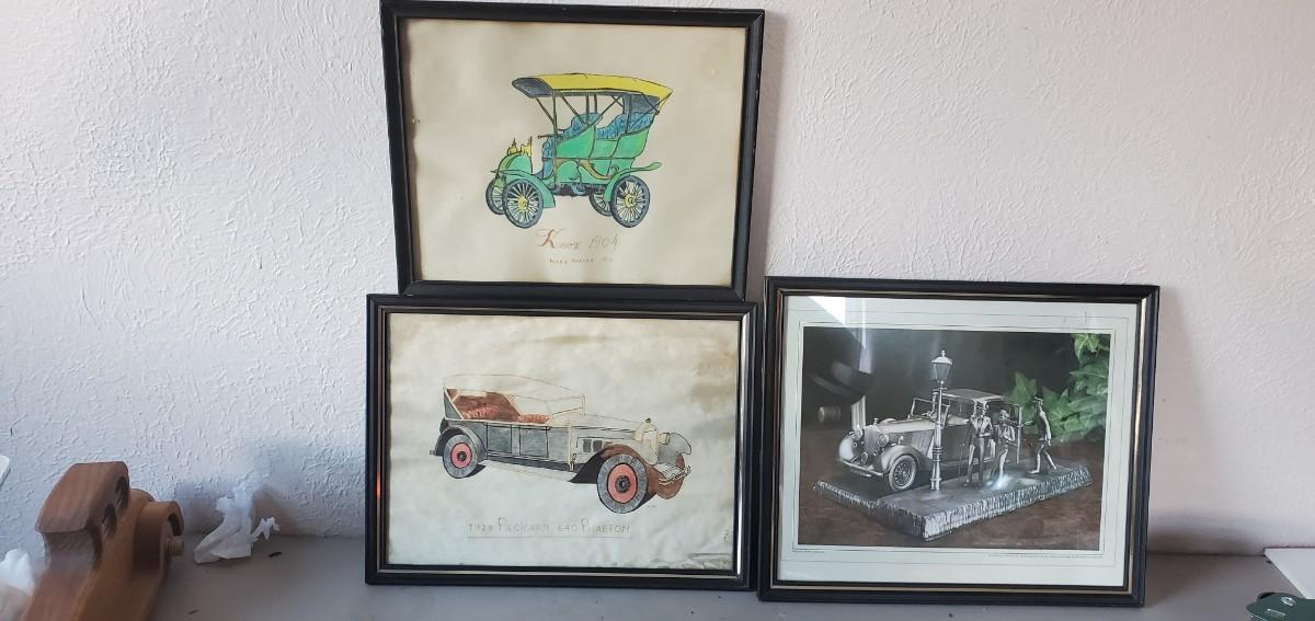 2 drawings by Mary miller,the Knox1904 drawing has the year 1973 on it,the Packard doesn't any years on it but has mm on it,the Rolls Royce appears to be a photo of a sculptor