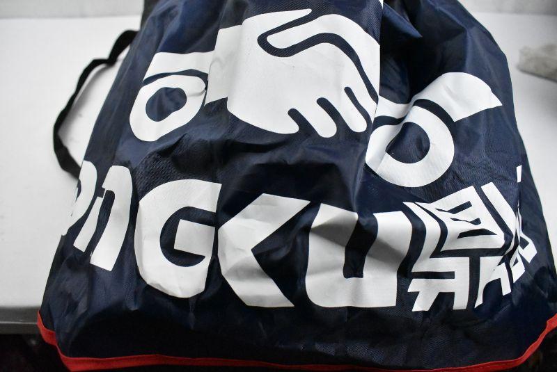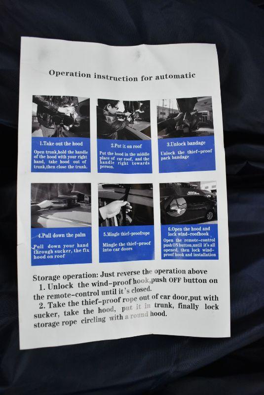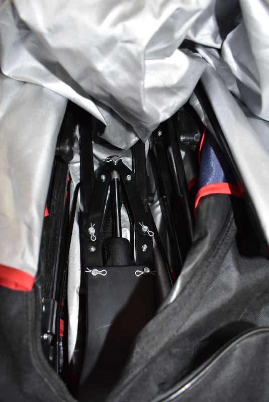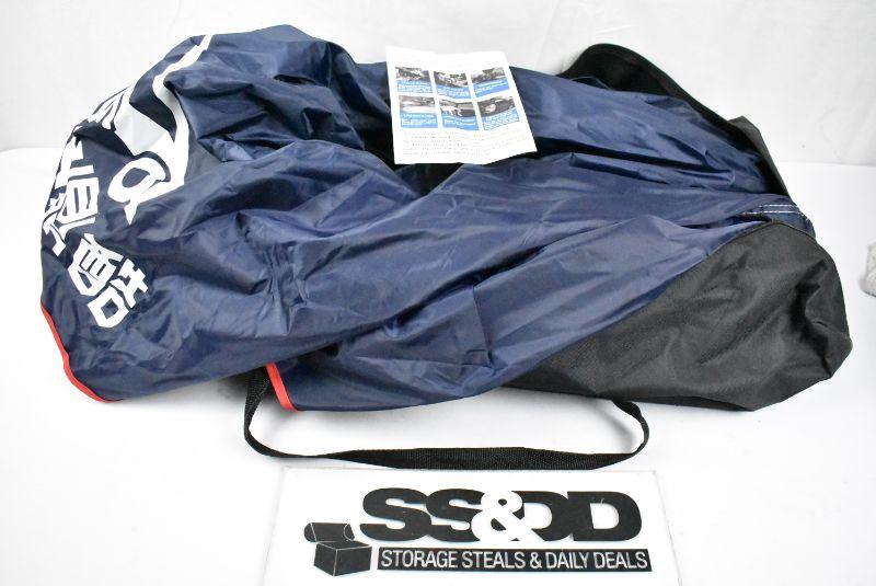 Car Tent Protection Umbrella Movable Folded Telescopic Canopy Carport Cover. Black Carry Bag. Tent is Navy with white words & red trim