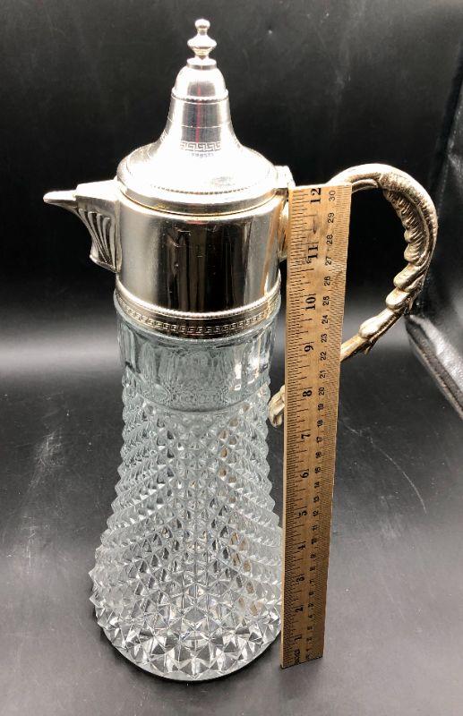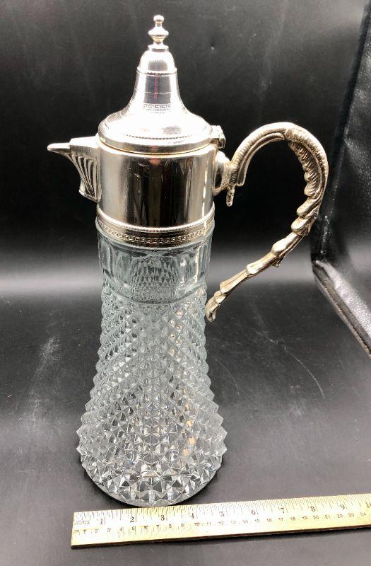 Vintage diamond cut crystal carafe pitcher with silverplate top and handle. Over 12" size. Good condition.