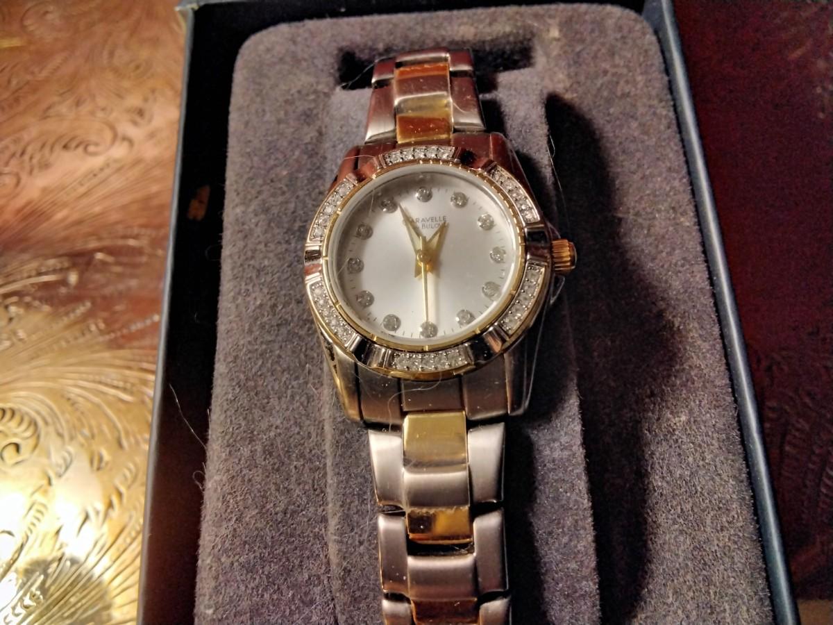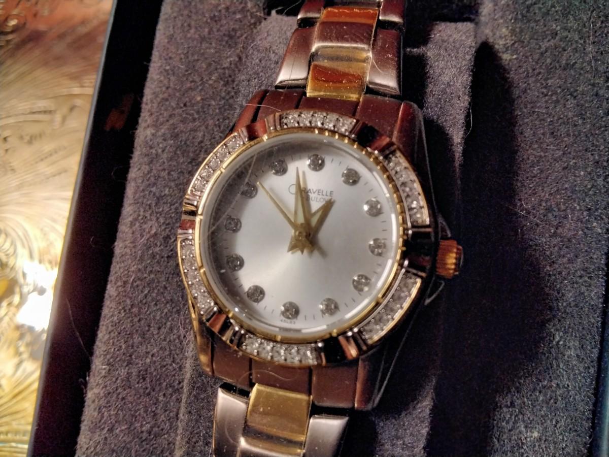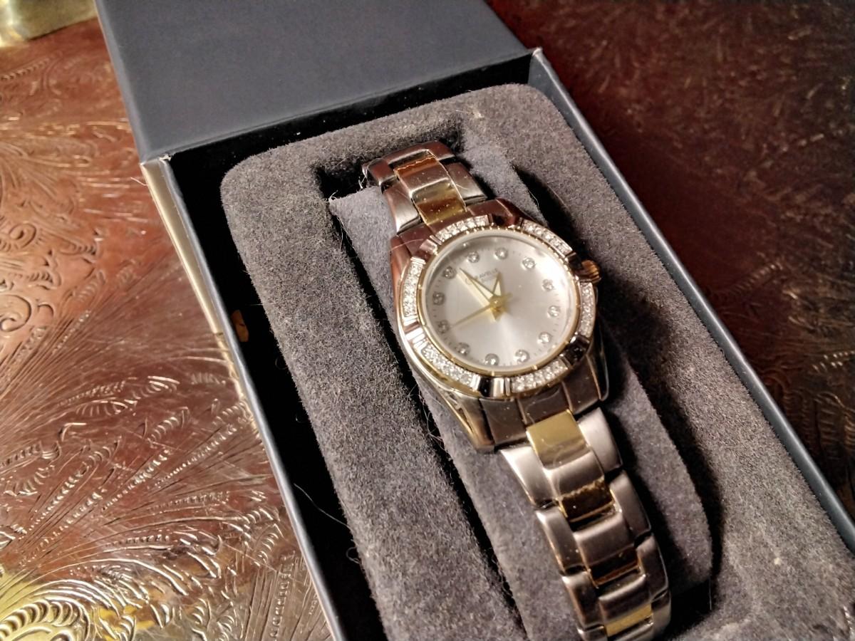 This beauty has a gorgeous face with diamonds surrounding it. Glow in the dark hands this watch is brand new, never worn and a beauty.