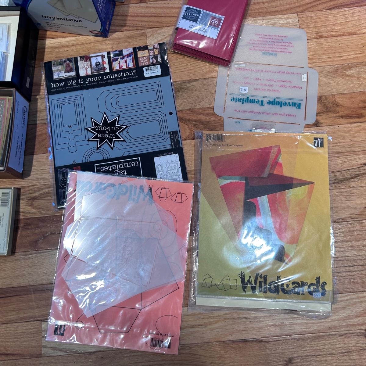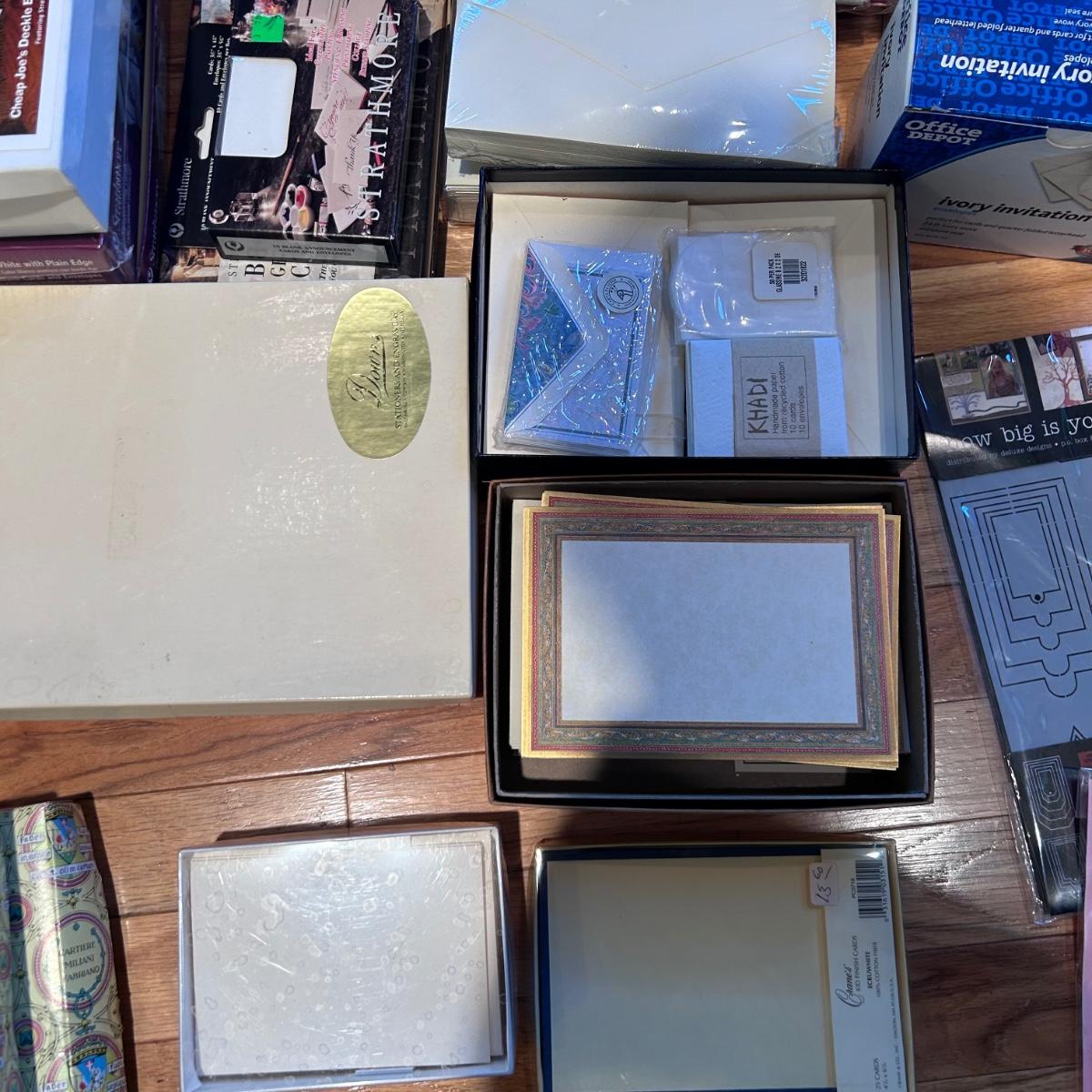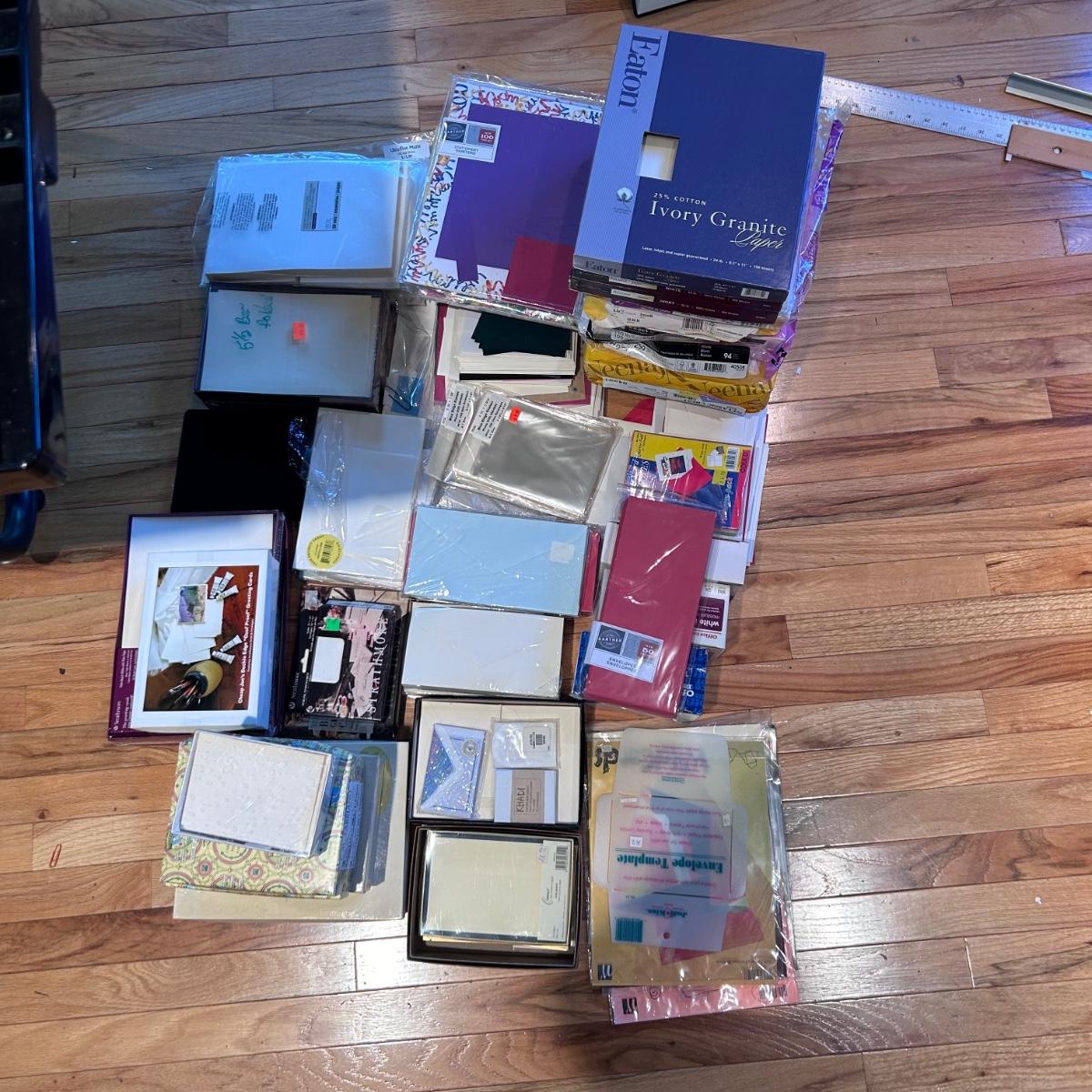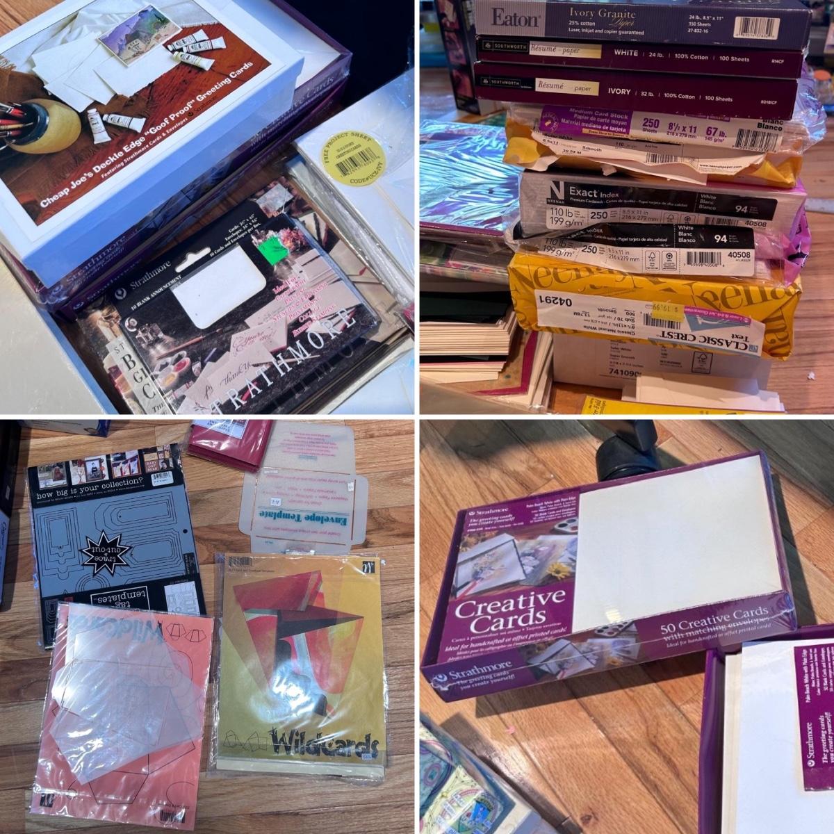 Lot is three boxes full of blank envelopes and cards of all sizes and materials to make your own artistic greeting cards. Some stationary paper, some card stock, envelope folding templates and so much more. Not all boxes are full but a good portion are even unopened. Some nice quality papers. Shipping available.