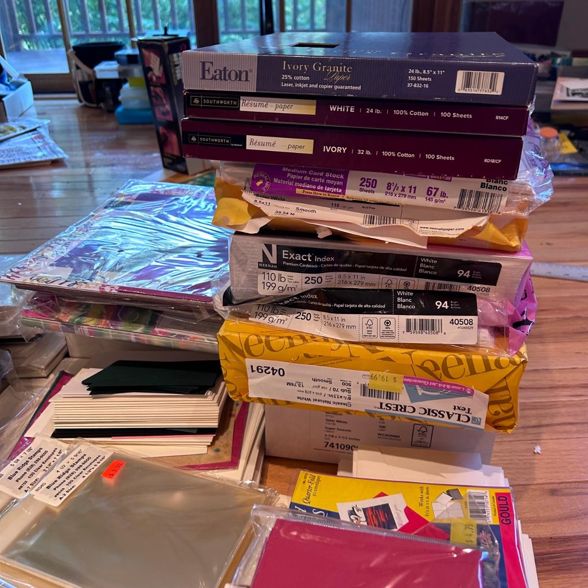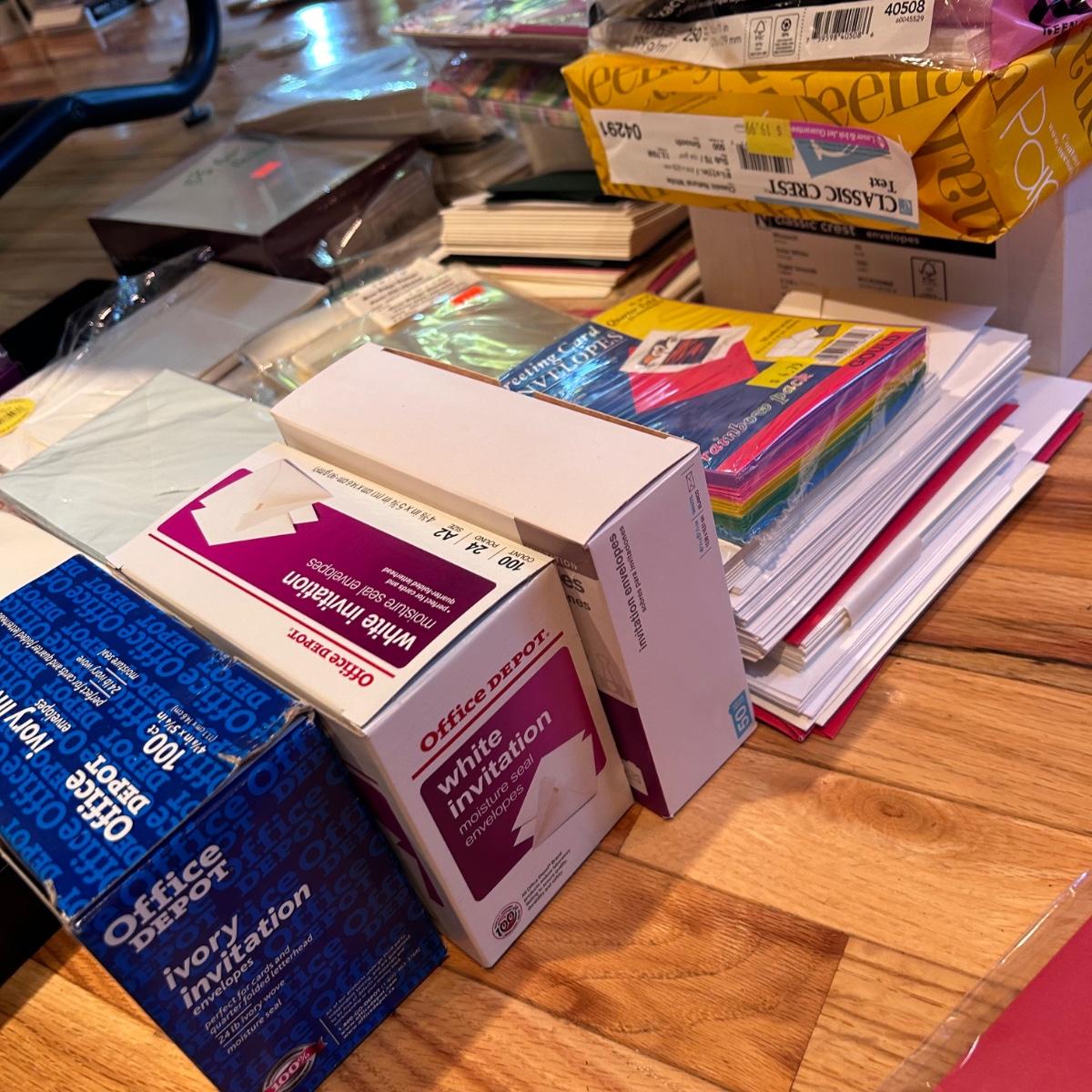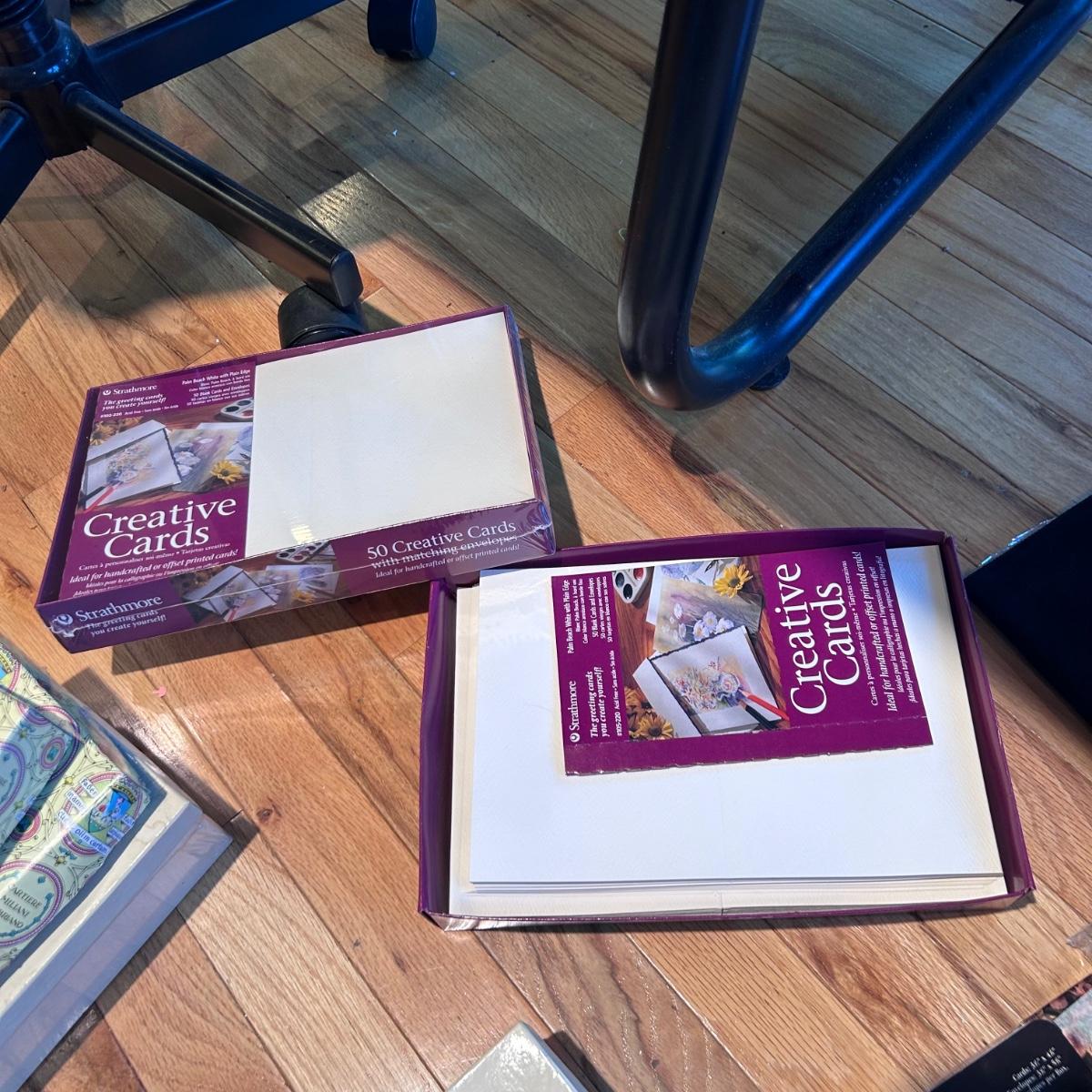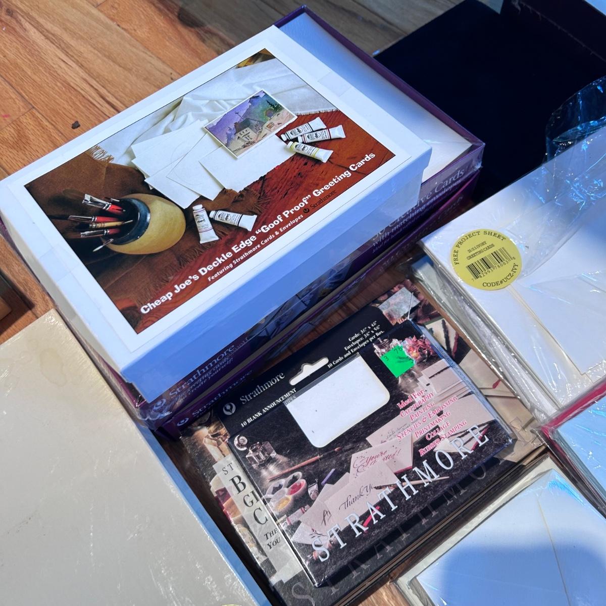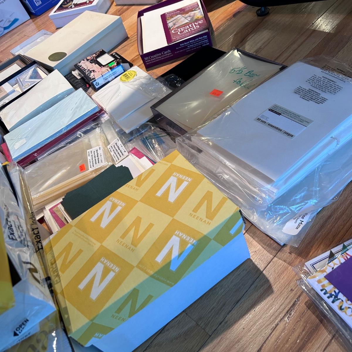 Lot is three boxes full of blank envelopes and cards of all sizes and materials to make your own artistic greeting cards. Some stationary paper, some card stock, envelope folding templates and so much more. Not all boxes are full but a good portion are even unopened. Some nice quality papers. Shipping available.