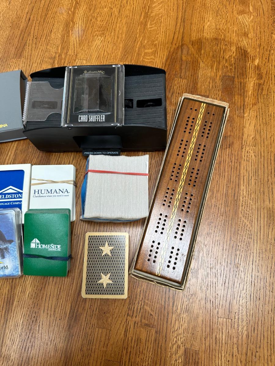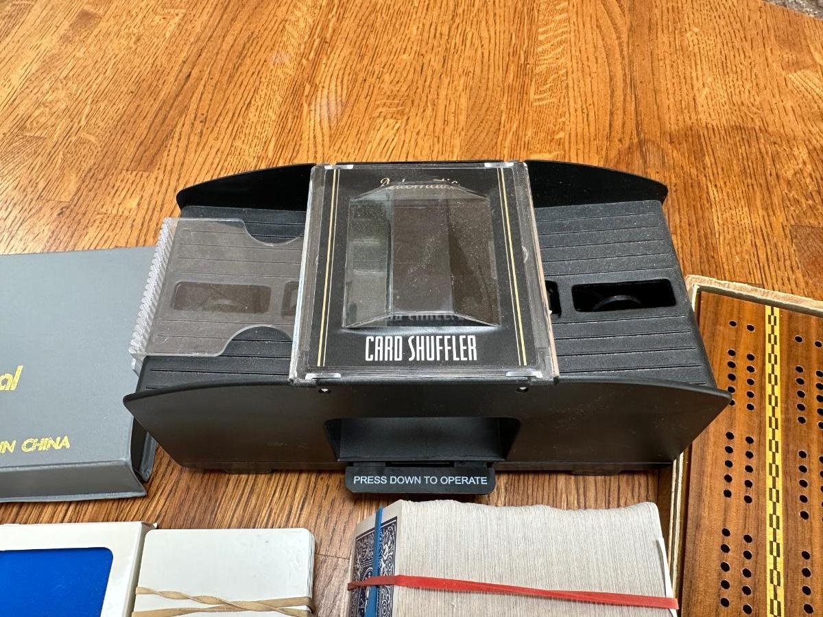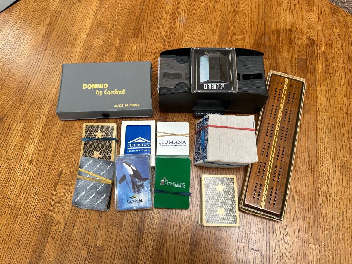 DOMINOS, CRIBBAGE BOARD, DECKS OF CARDS AND CARD SHUFFLER