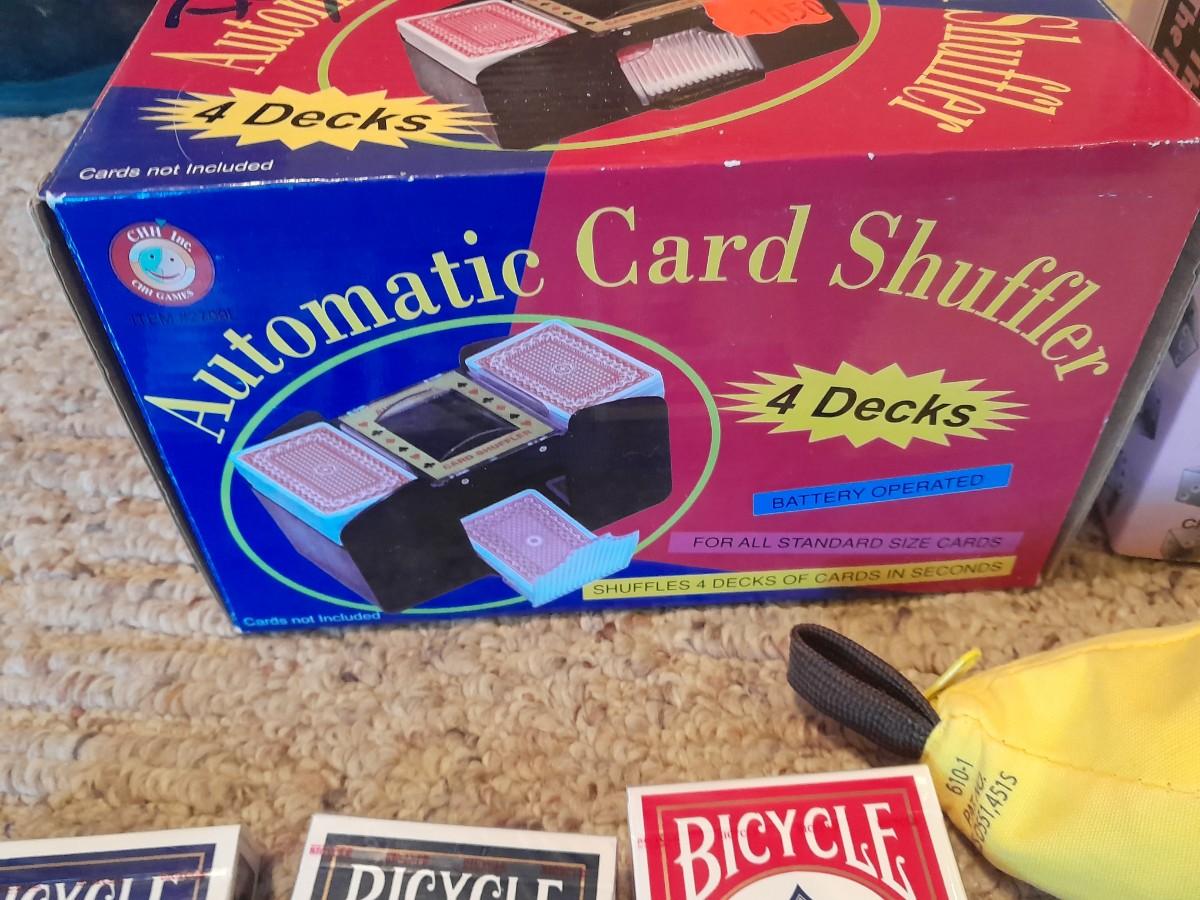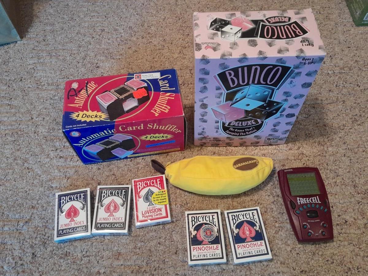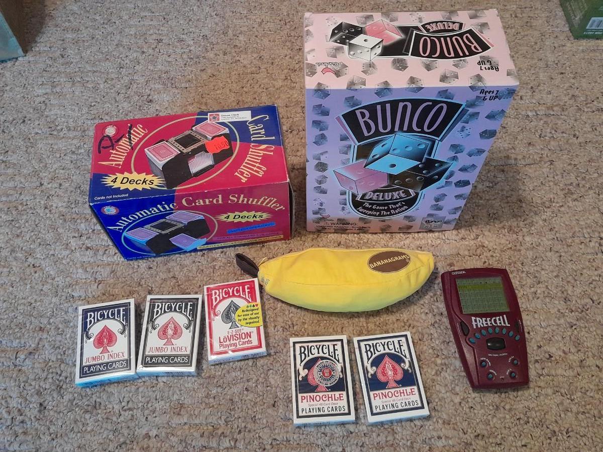 CARD SHUFFLER, BUNCO GAME, ELECTRONIC BATTERY OPERATED FREECELL, DECKS OF CARDS, AND BANANAGRAMS GAME