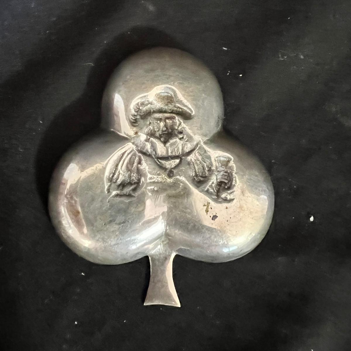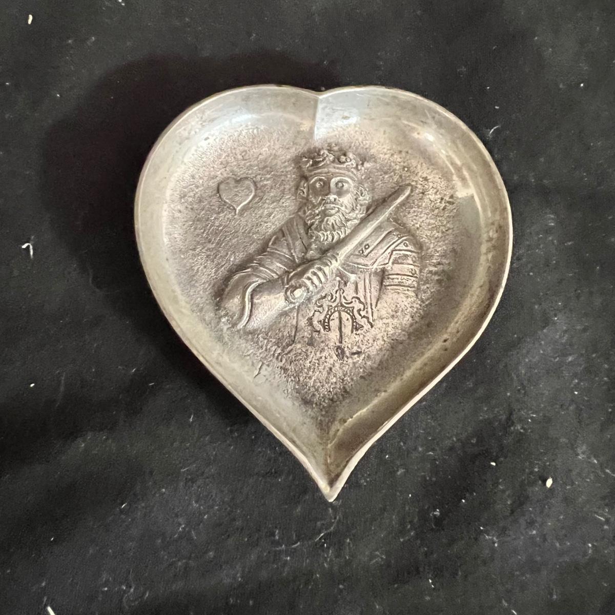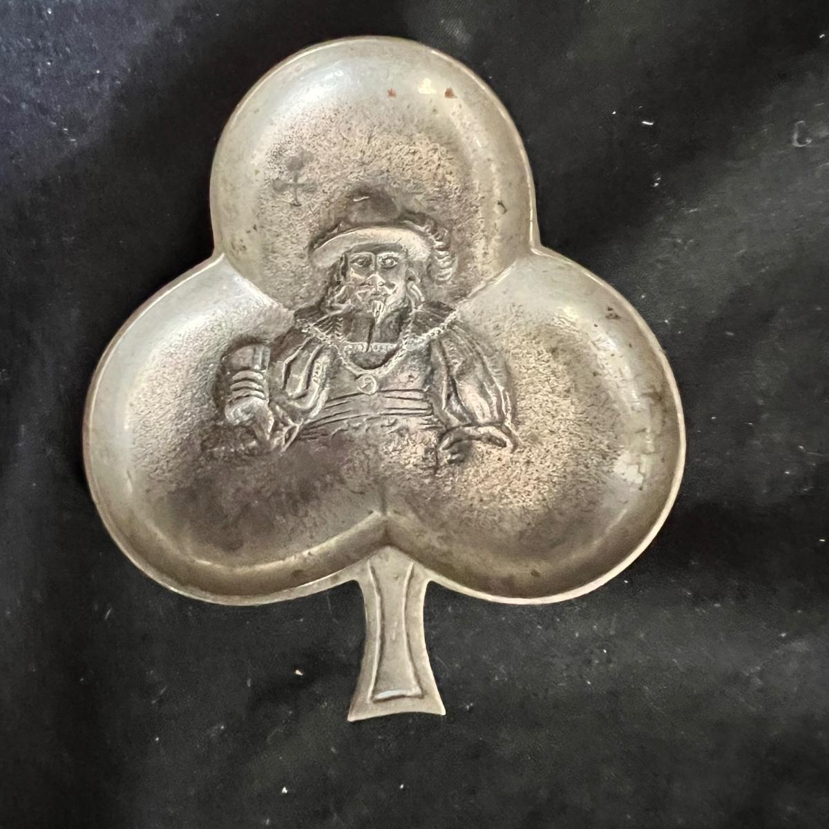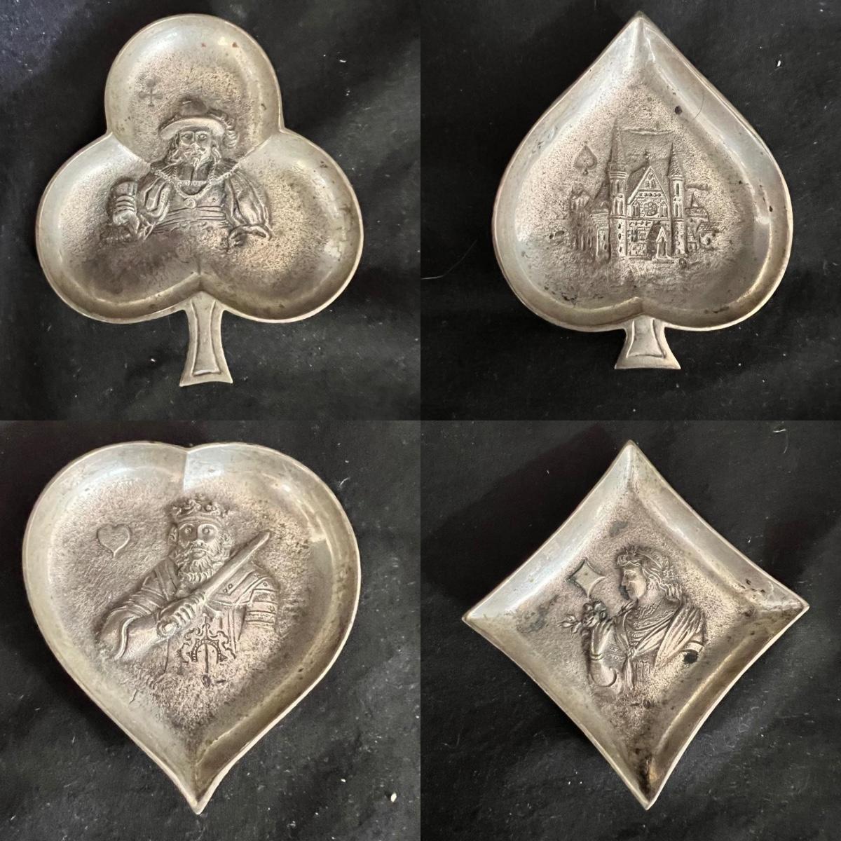 A set of four silver dishes, shaped in a club, spade, heart and diamond. Each dish measures approximately 2.25” x 2.25”.