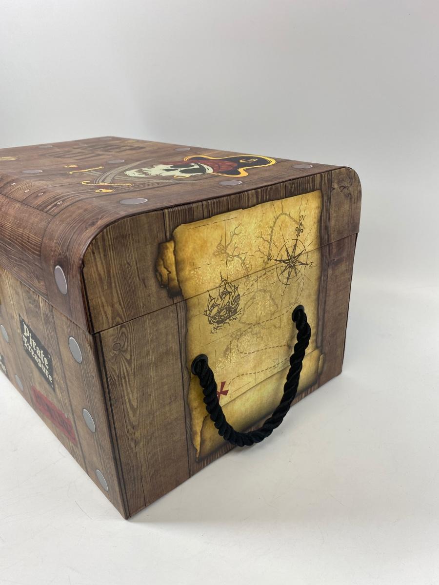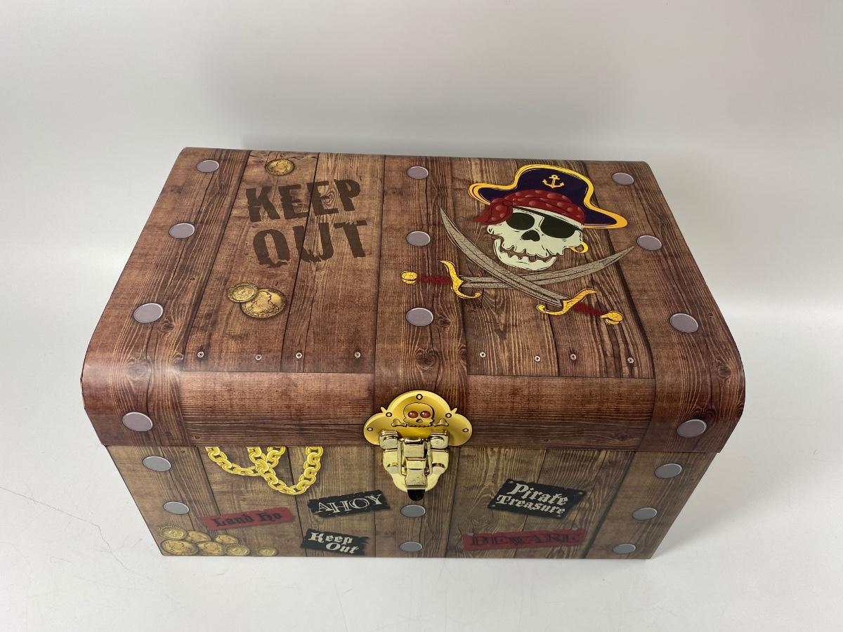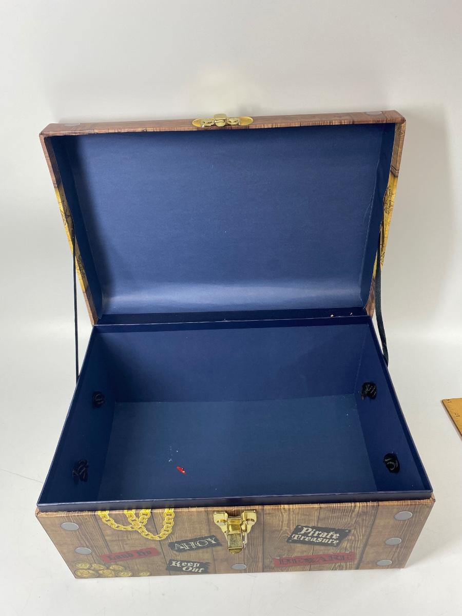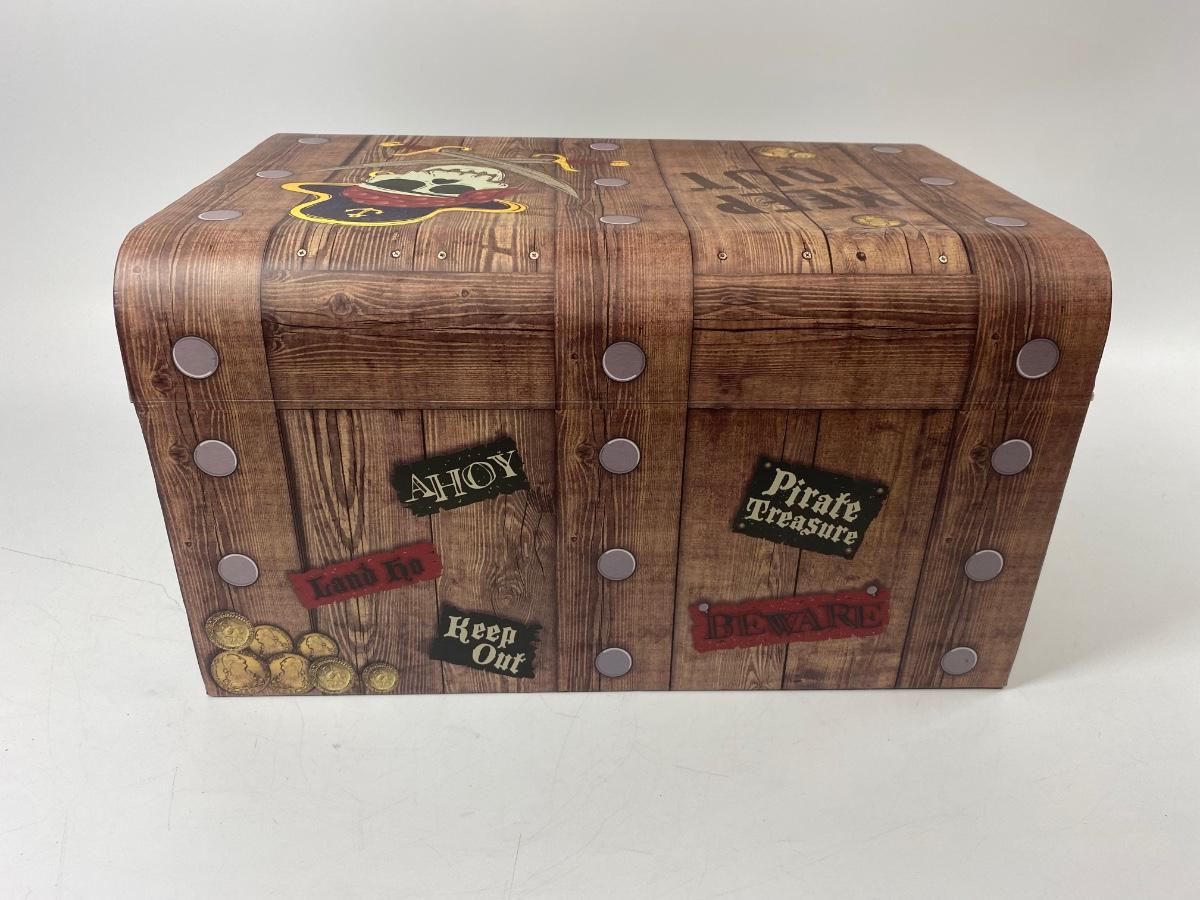 Cardboard pirate's treasure chest box. Hinged lid with a metal latch. Good size and good condition.