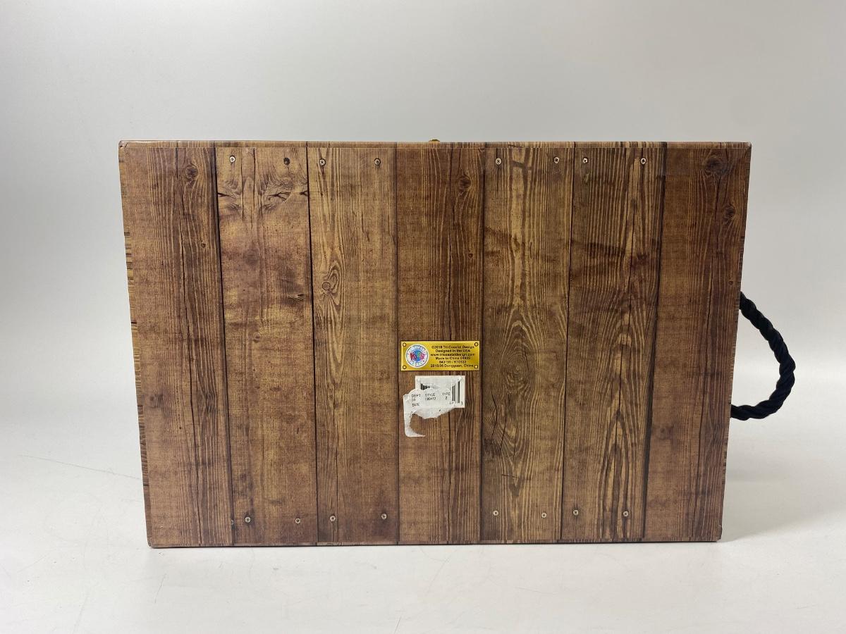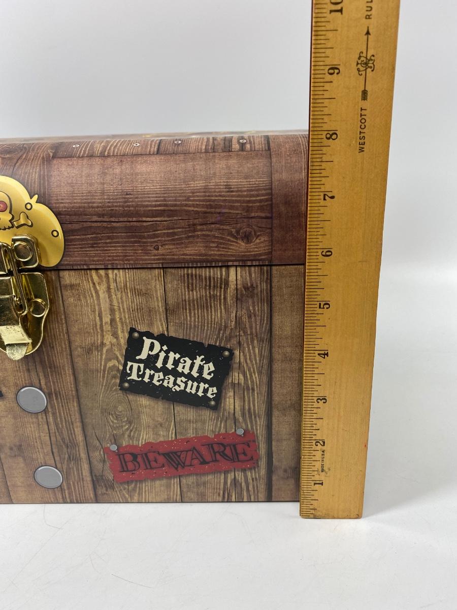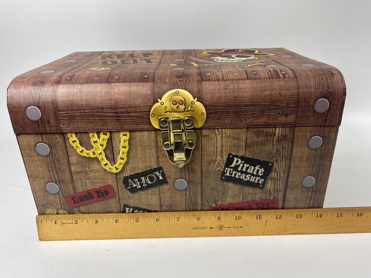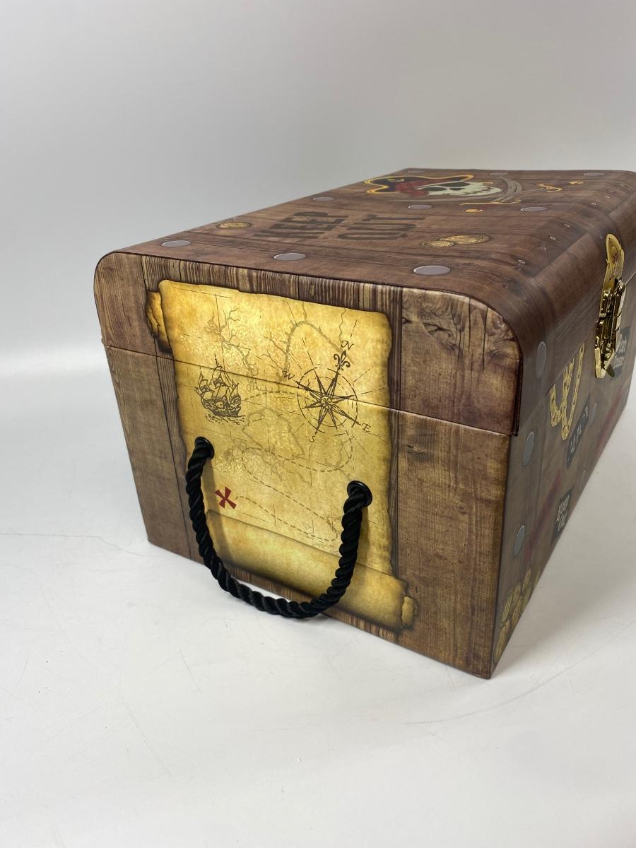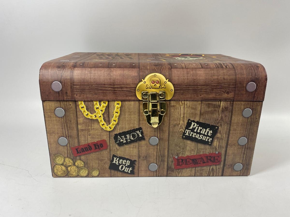 Cardboard pirate's treasure chest box. Hinged lid with a metal latch. Good size and good condition.