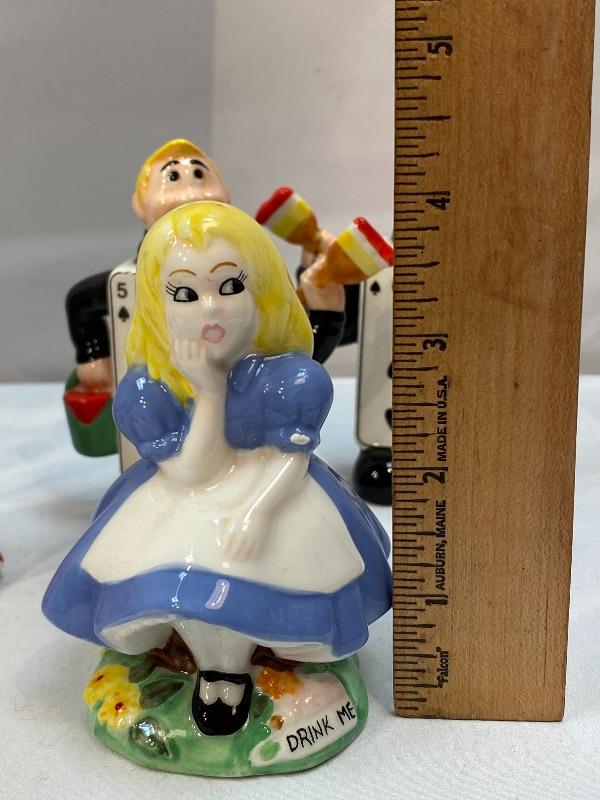 Cardew Design Alice in Wonderland shaker set. 2004 release. 9 shakers includes Alice, the white rabbit, Cheshire cat, tweedle dee & tweedle dum, the queen, the king, and two cardsmen. Good condition.