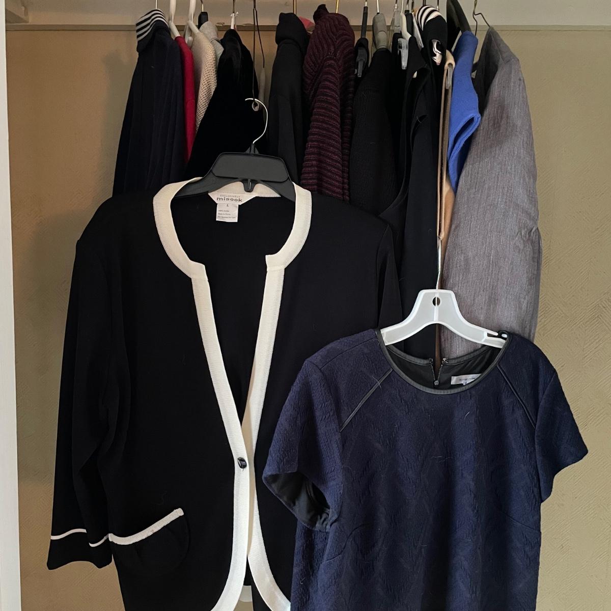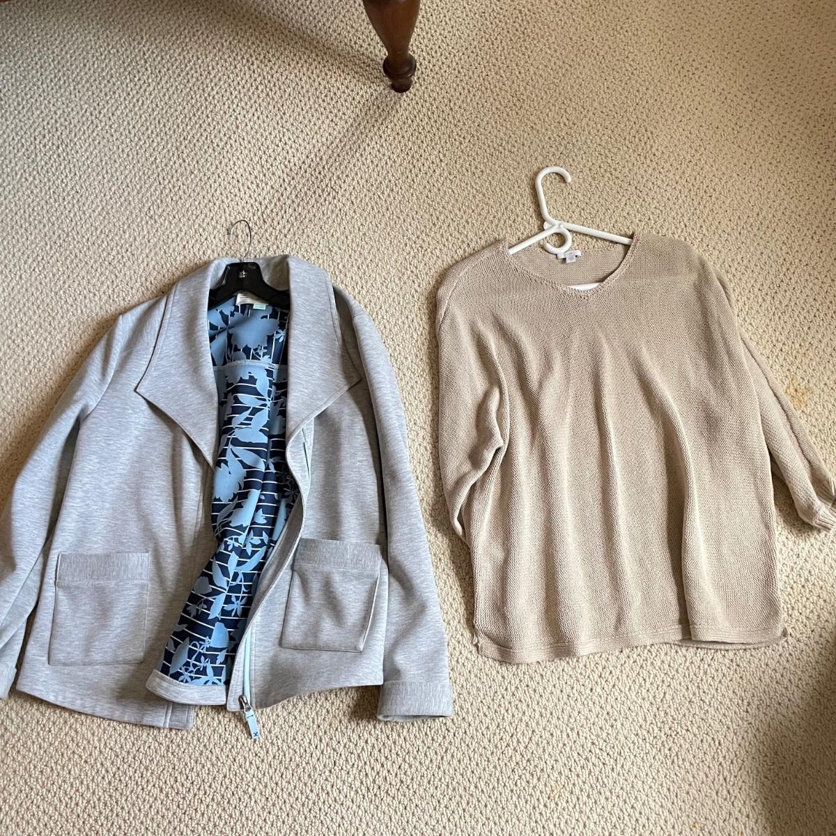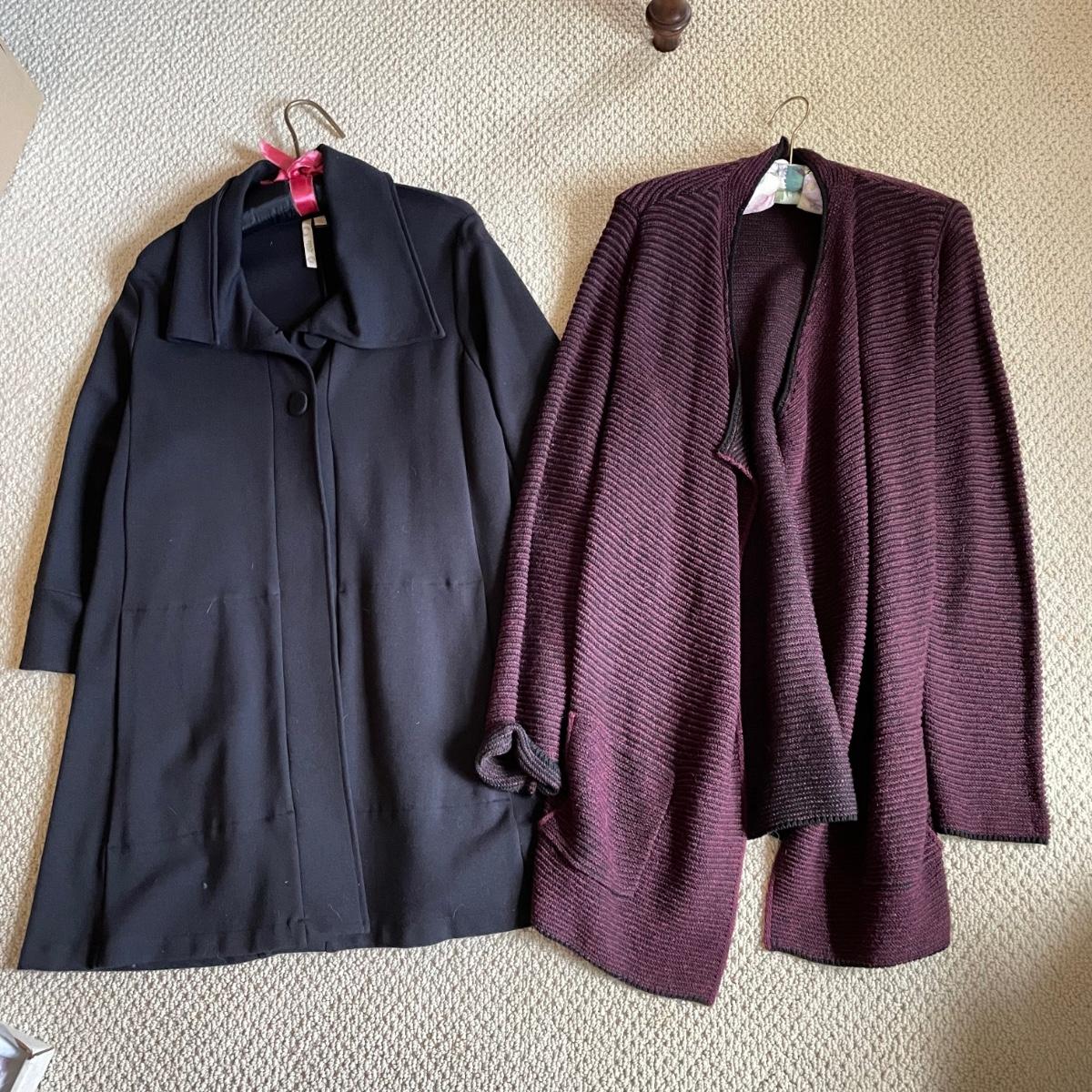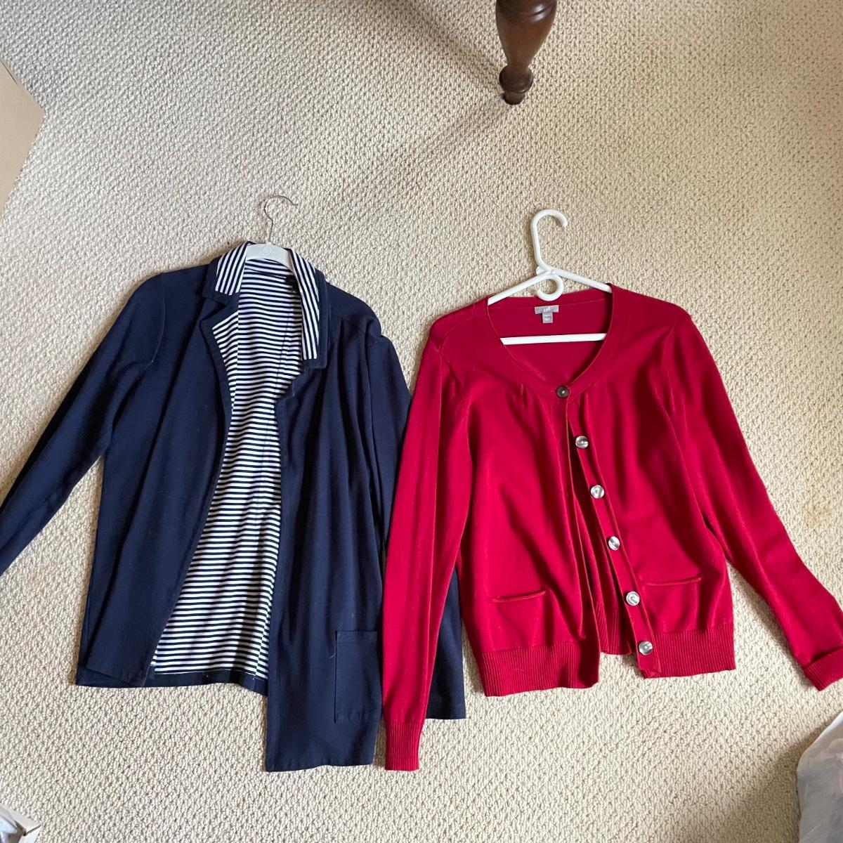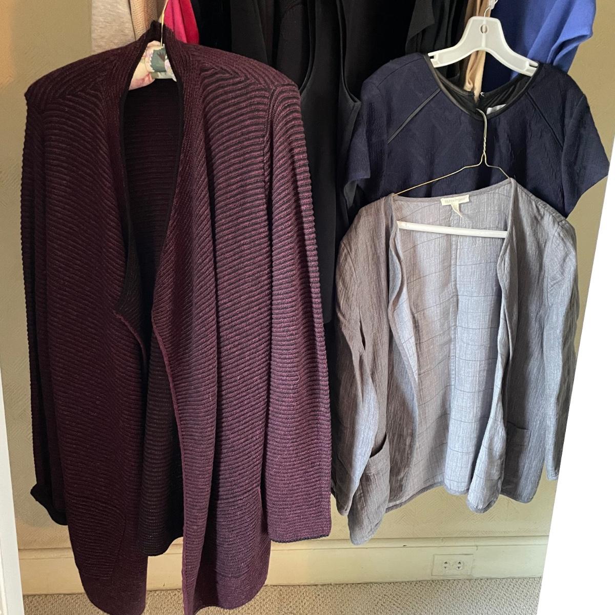 Eleven cardigans and other long sleeve sweaters and jackets plus eight sleeveless shirts to wear with them. Sizes are mostly large and some tops are duplicates. See images. Local pick up only.