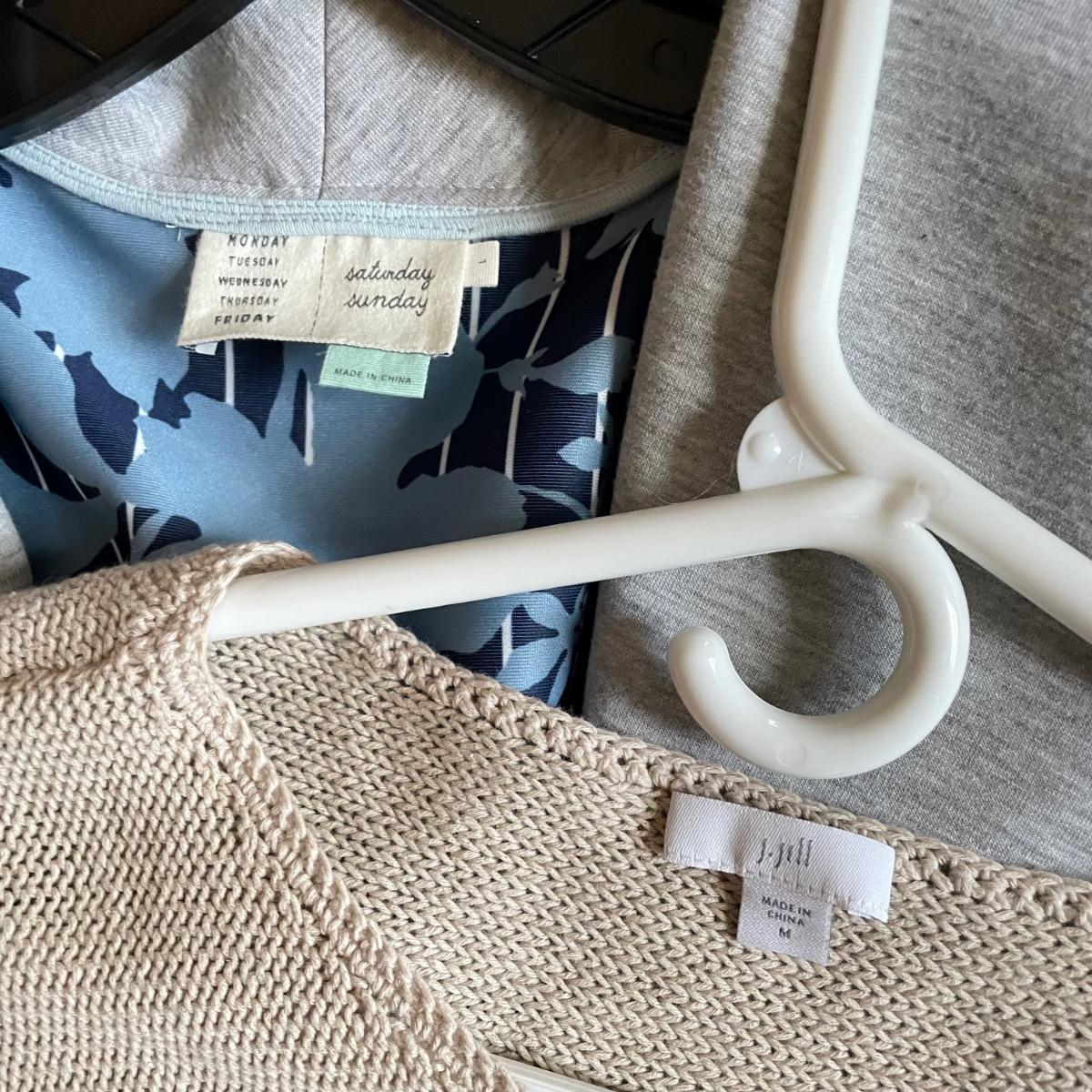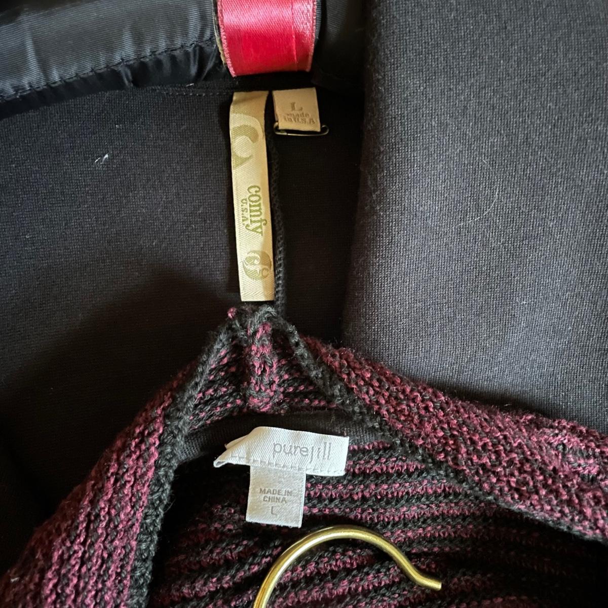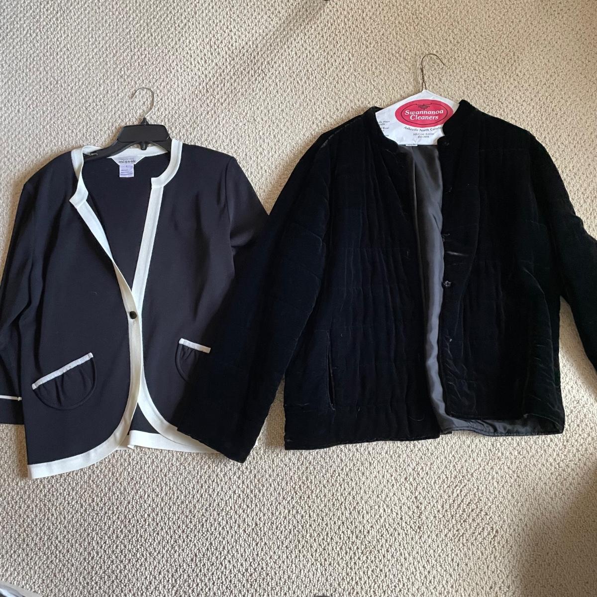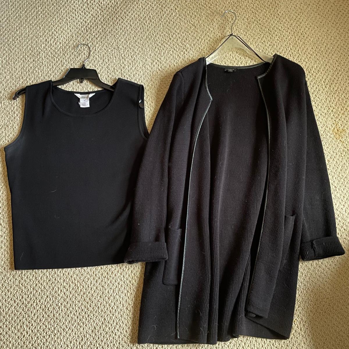 Eleven cardigans and other long sleeve sweaters and jackets plus eight sleeveless shirts to wear with them. Sizes are mostly large and some tops are duplicates. See images. Local pick up only.